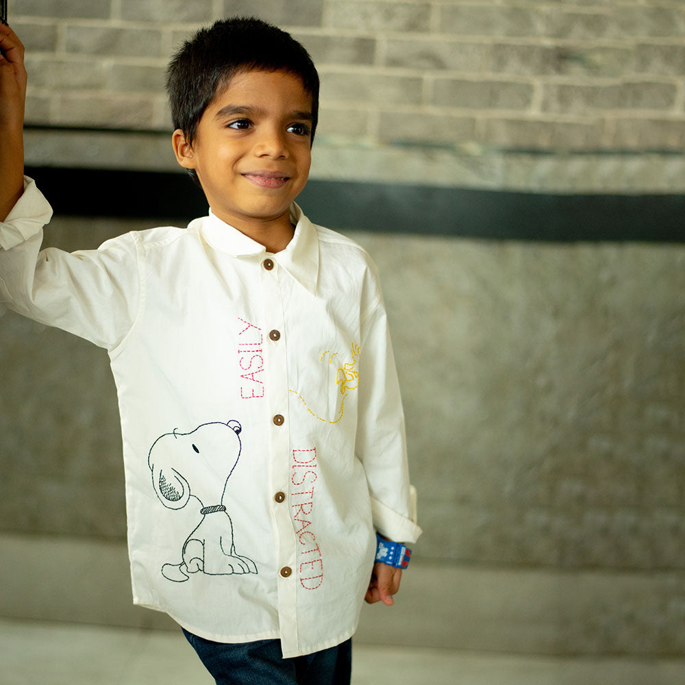 Soft, comfy, and full of character – this white shirt features a hand-embroidered Snoopy who is “Easily Distracted” and Woodstock buzzing above. A fun pick for curious minds and little daydreamers!