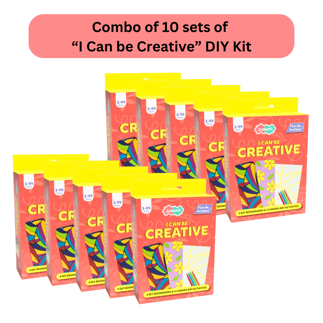 This is a combo of 10 sets of the " I Can Be Creative " which makes it perfect for return gifting, bulk gifting and play dates.Unleash your imagination and explore the world of art with JoGenii's "I Can Be Creative" Mini DIY Kit! Perfect for creative minds aged 3 to 99, this kit is a fantastic way to spend quality time together while crafting beautiful bookmarks and canvas art activities.