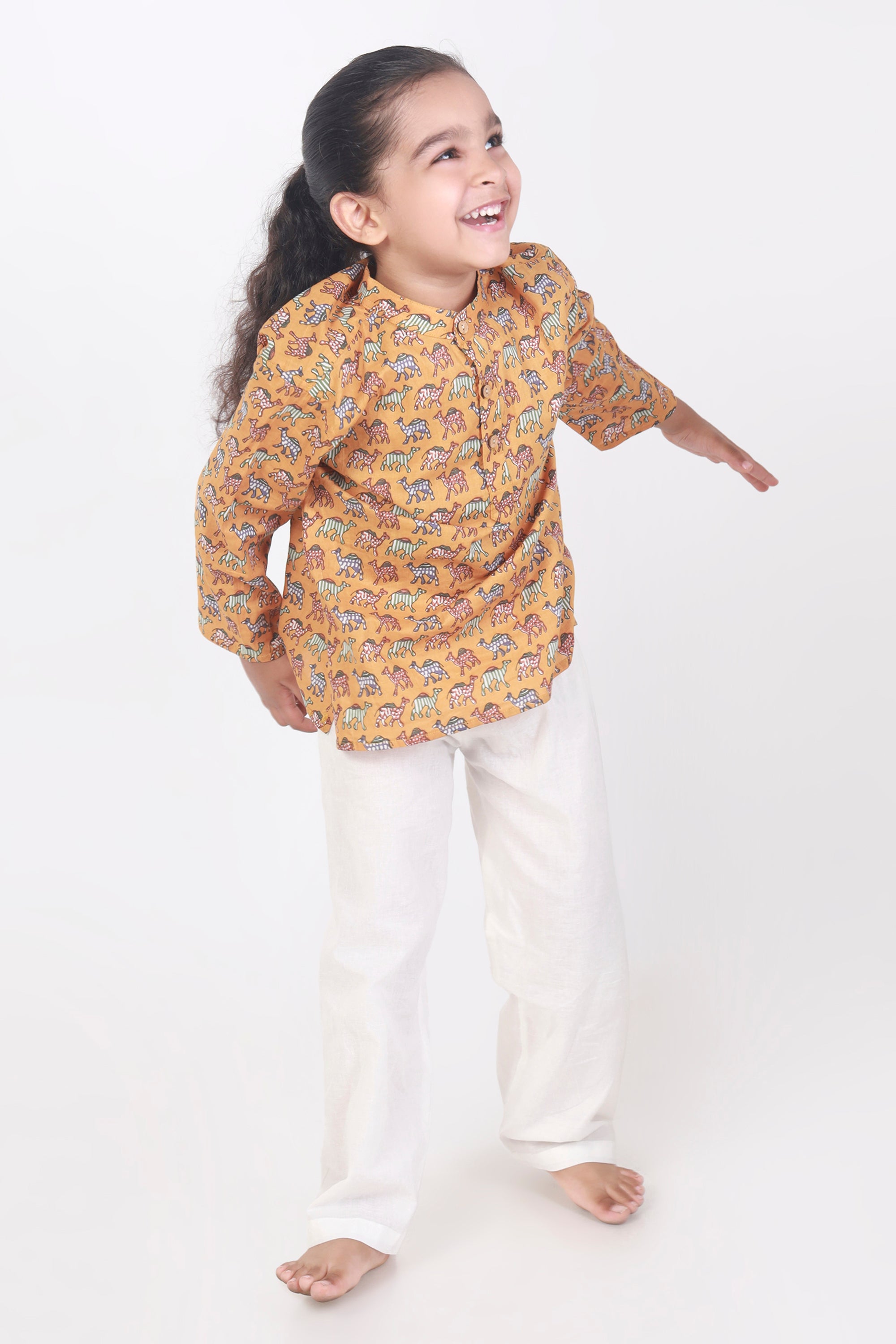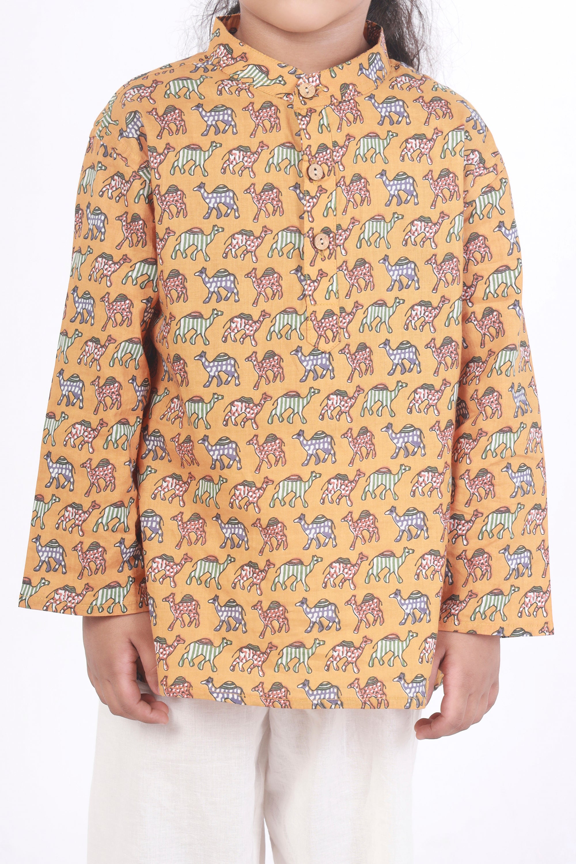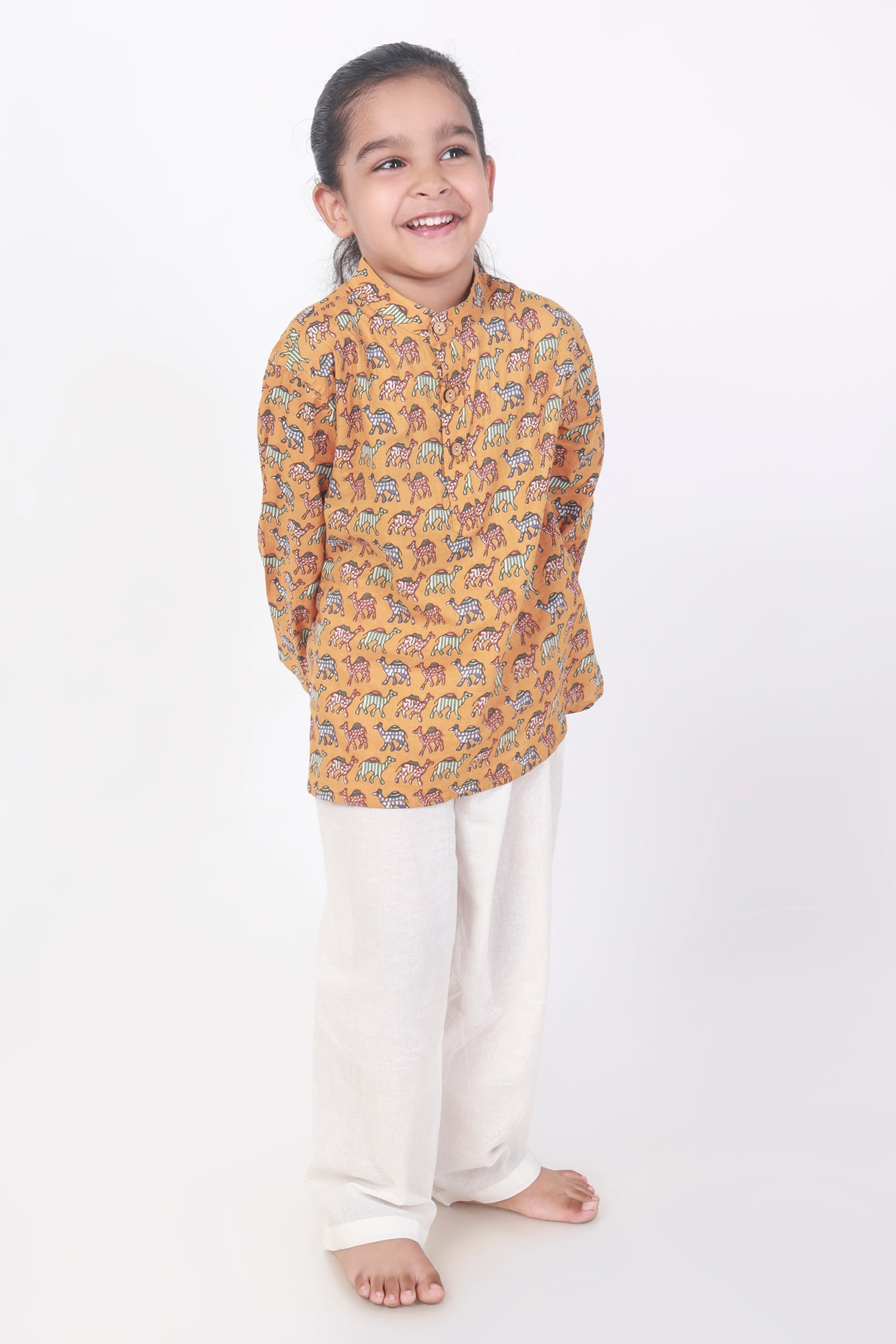 Kids Cotton Nightsuit – Yellow Camel Print Kurta & Pyjama Co-ord Set for Boys & Girls