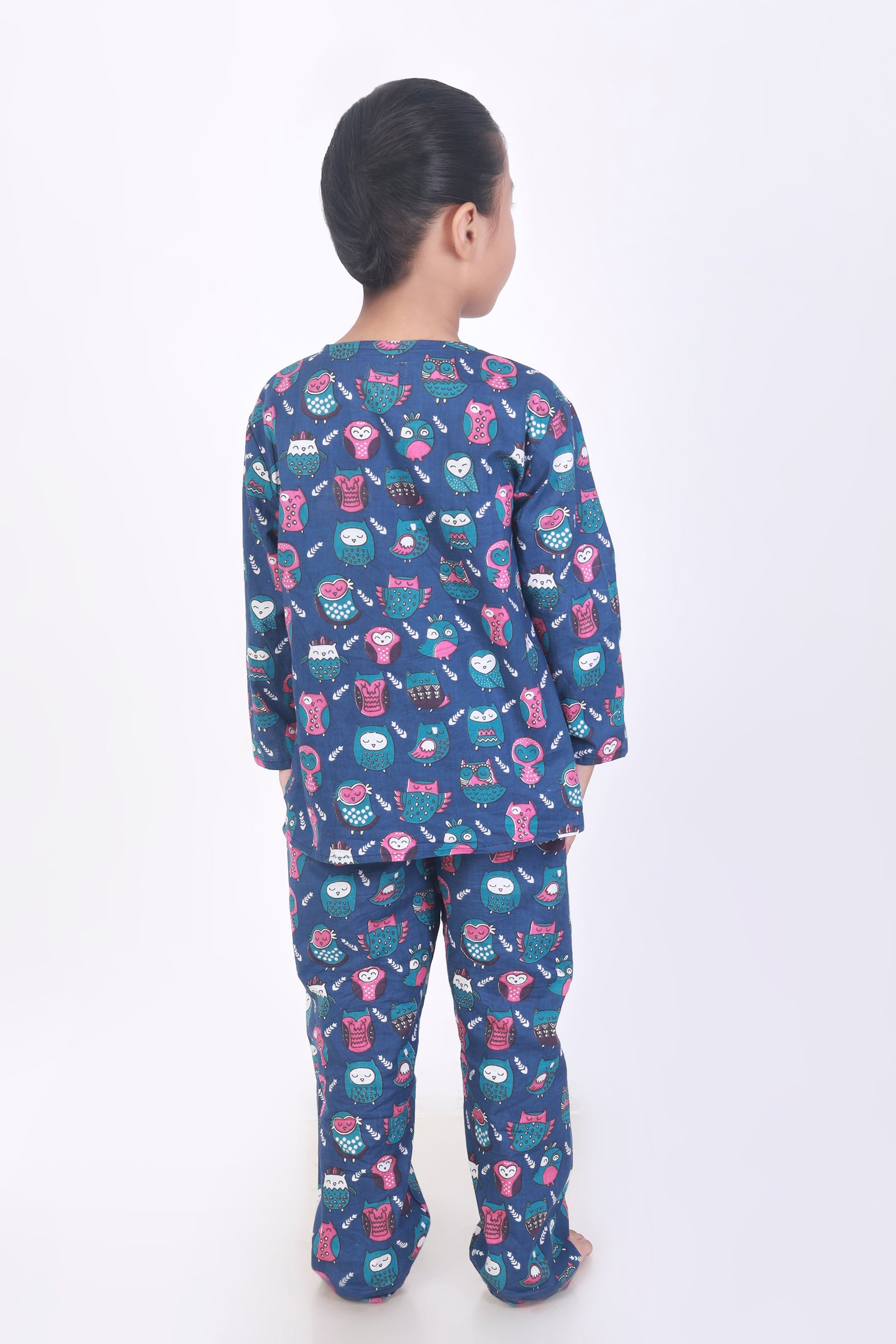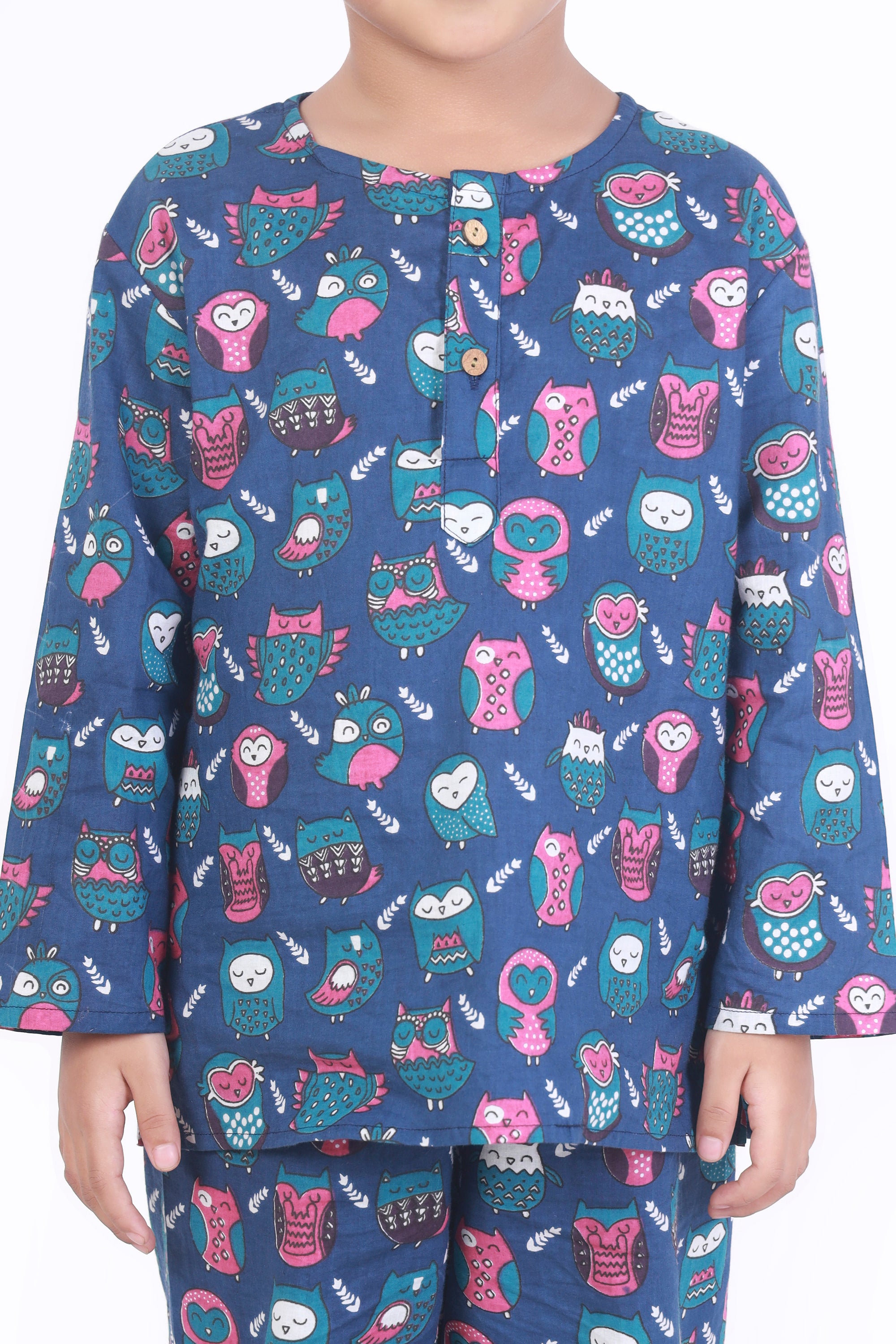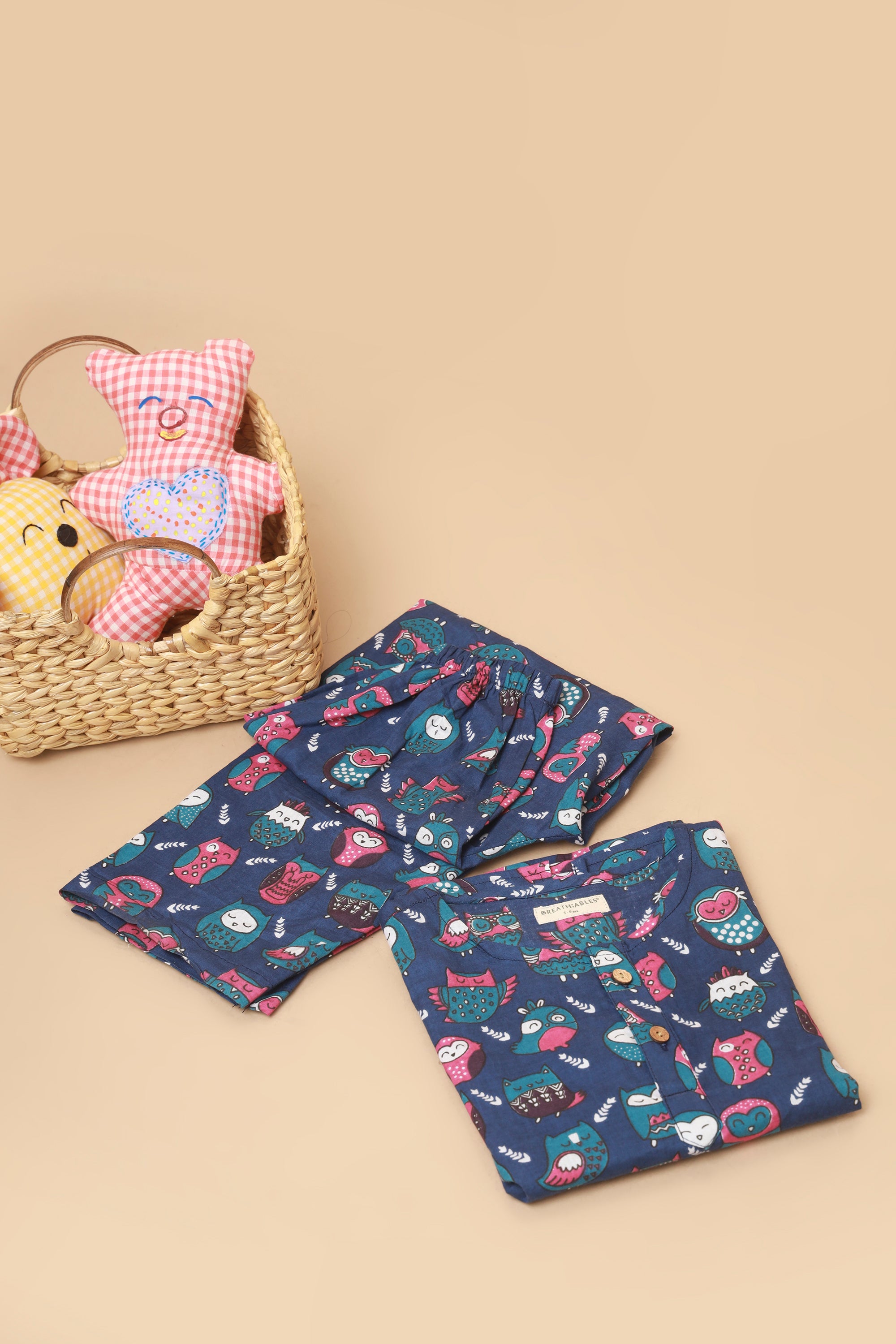 Kids Cotton Owl Print Co-ord Nightsuit – Navy Blue