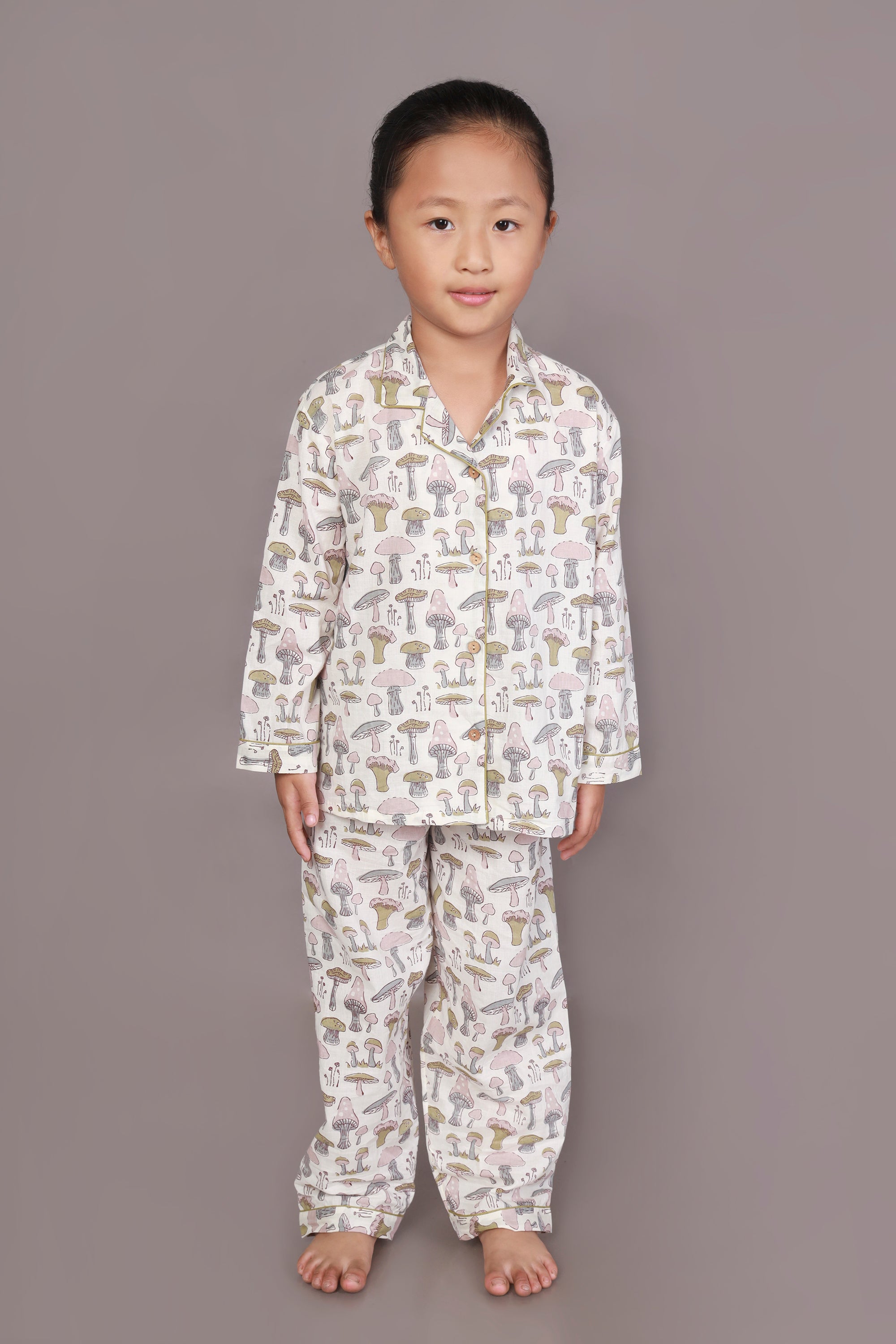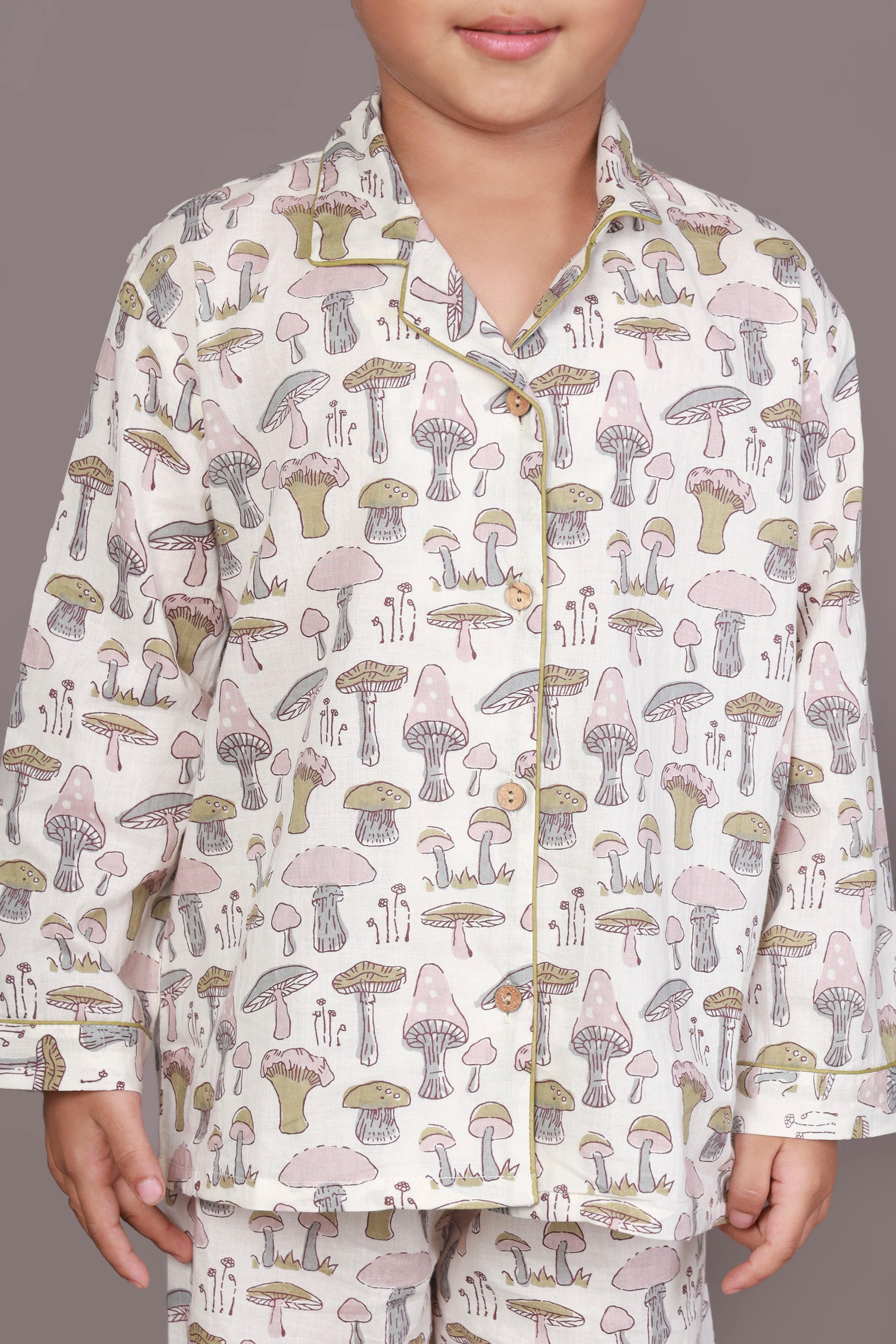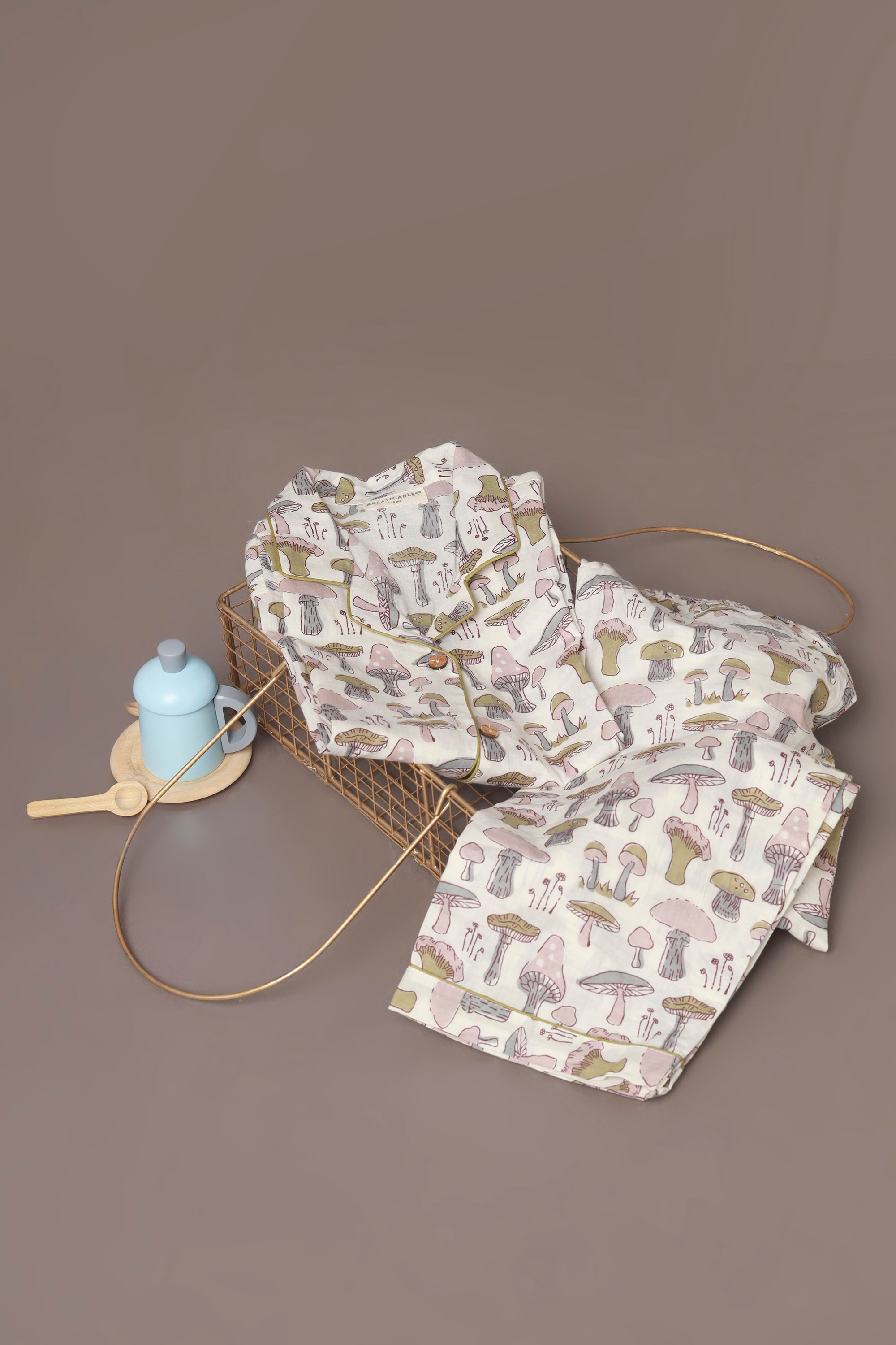 Kids Cotton White Mushroom Print Shirt & Pyjama Unisex Nightsuit