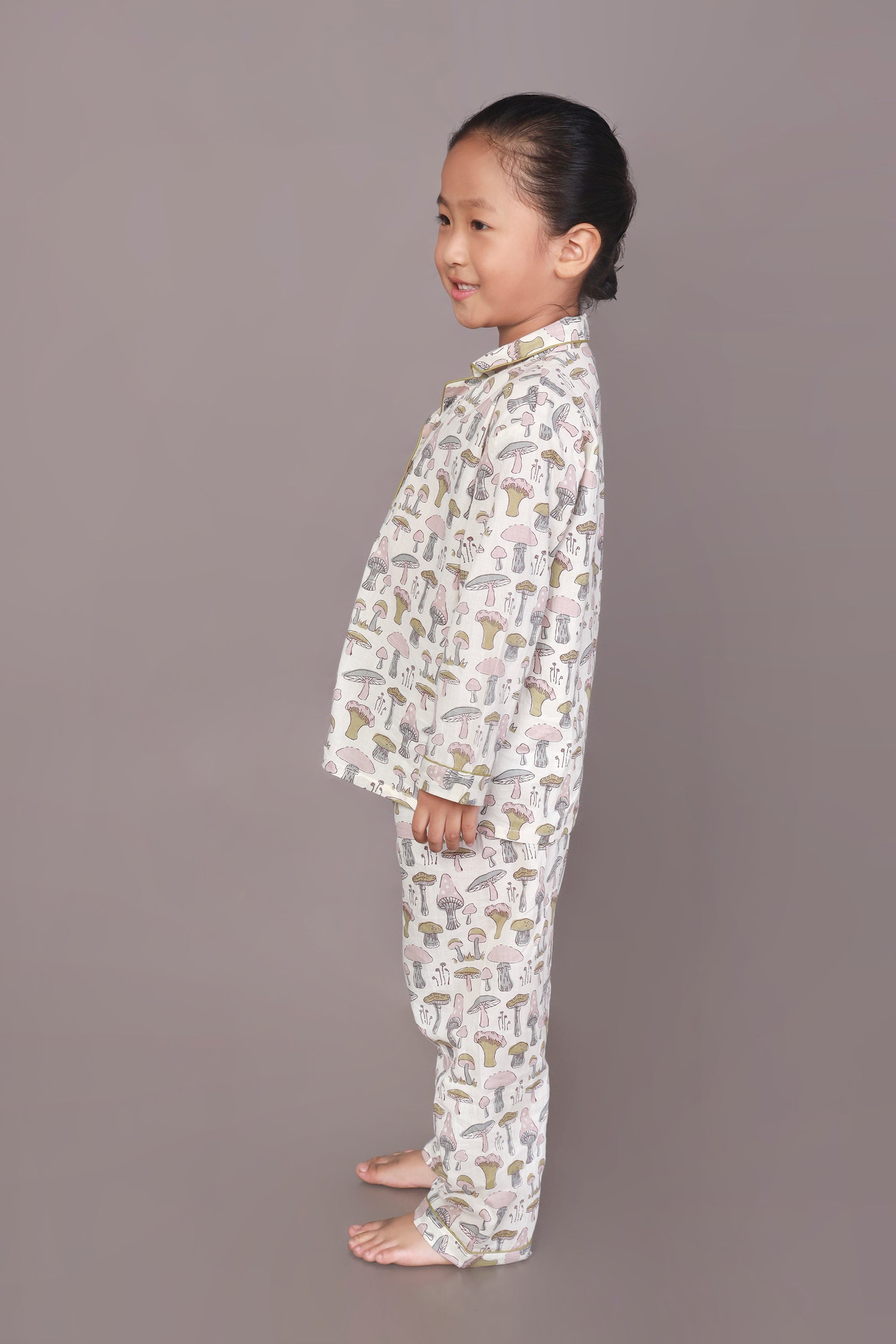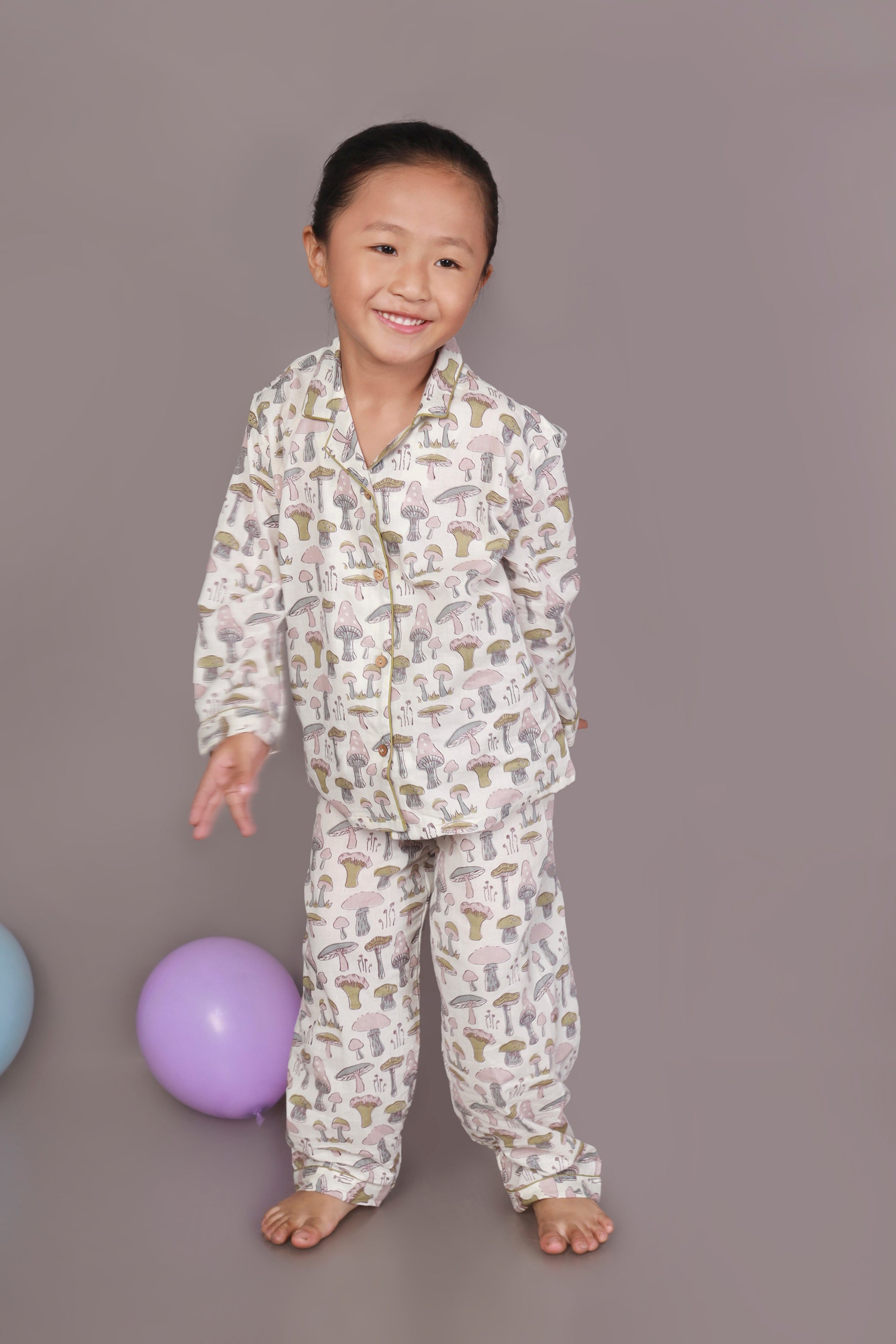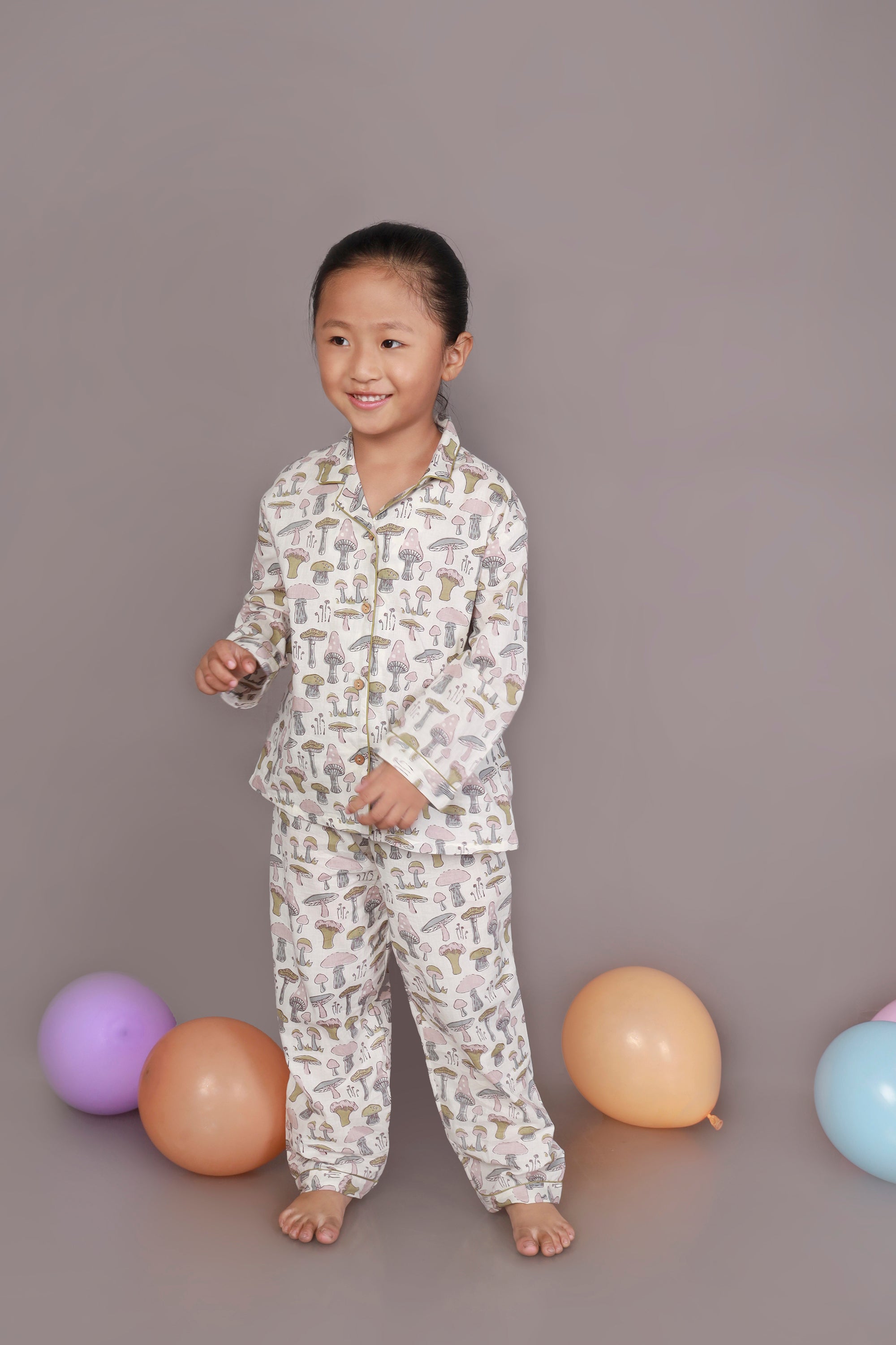 Kids Cotton White Mushroom Print Shirt & Pyjama Unisex Nightsuit