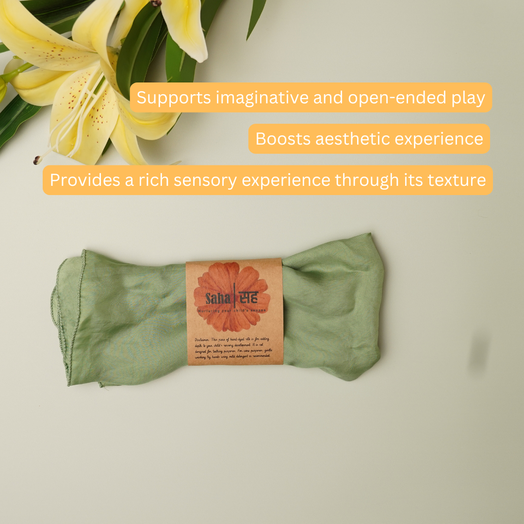 Introducing the 'Treasure Trove 2.0' that is perfect for little explorers 12 months and up. This delightful treasure box is packed with love and learning! Inside, you'll find a soft, mellow sap green play silk, two colorful little peg dolls, and five beautifully crafted wooden Waldorf-inspired blocks.