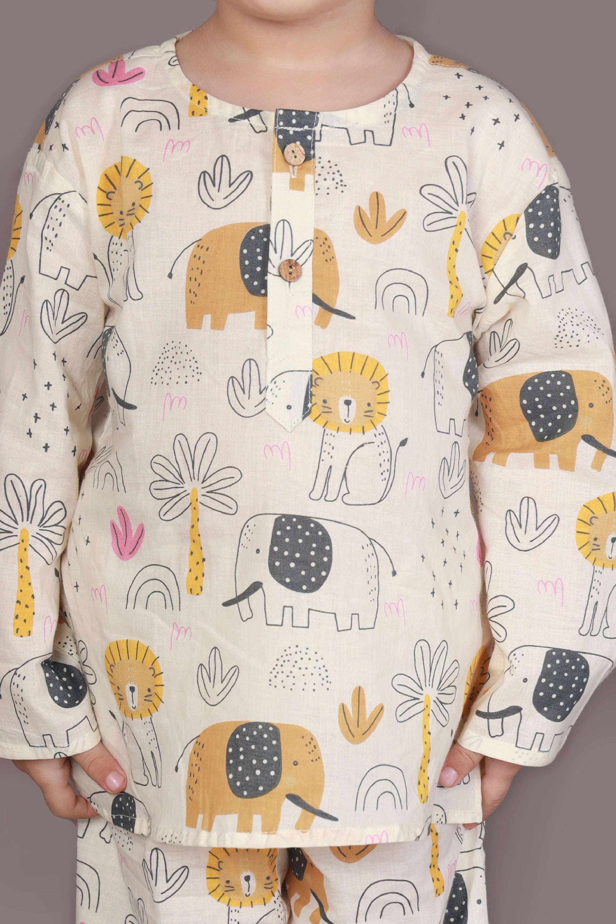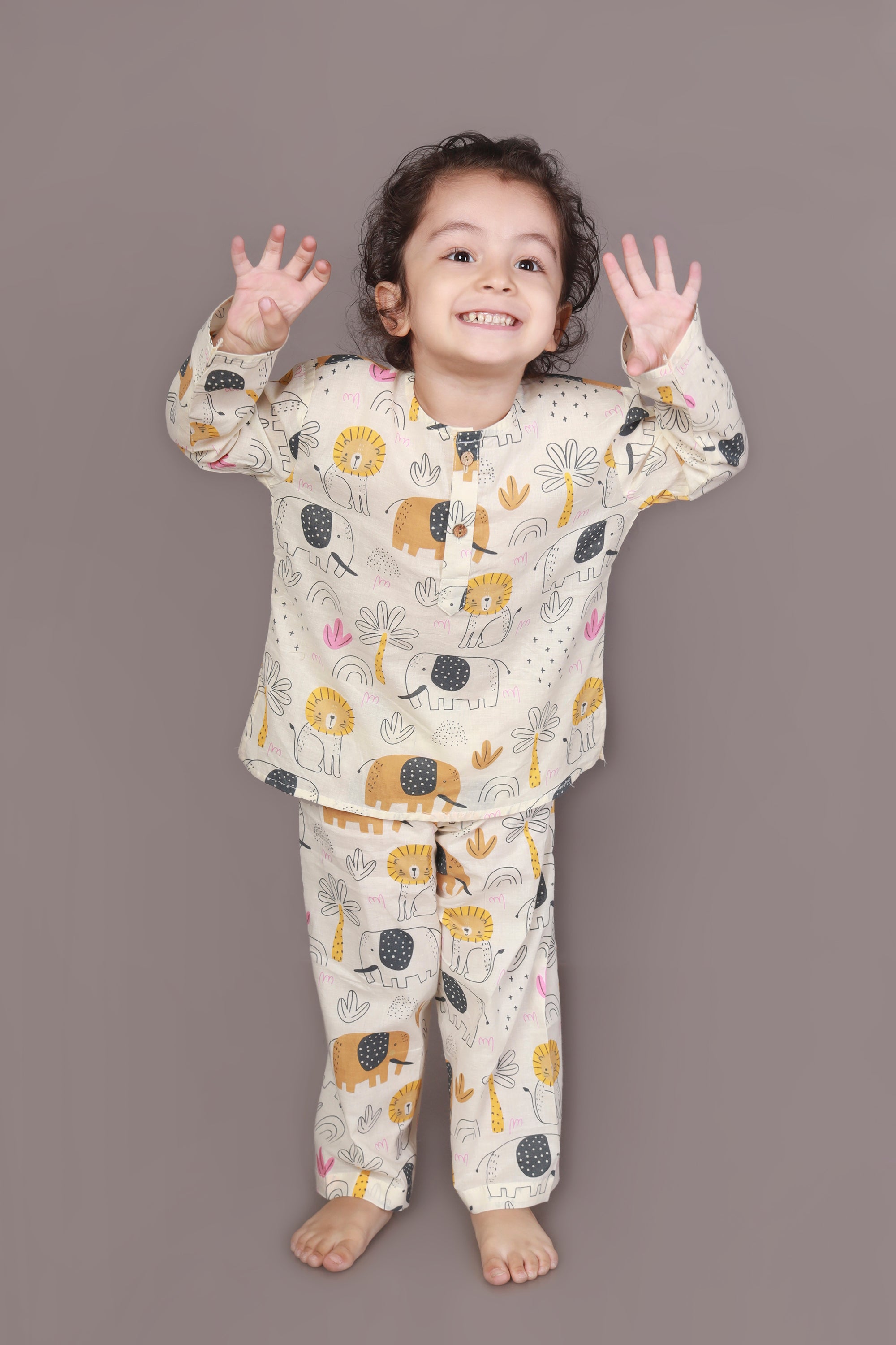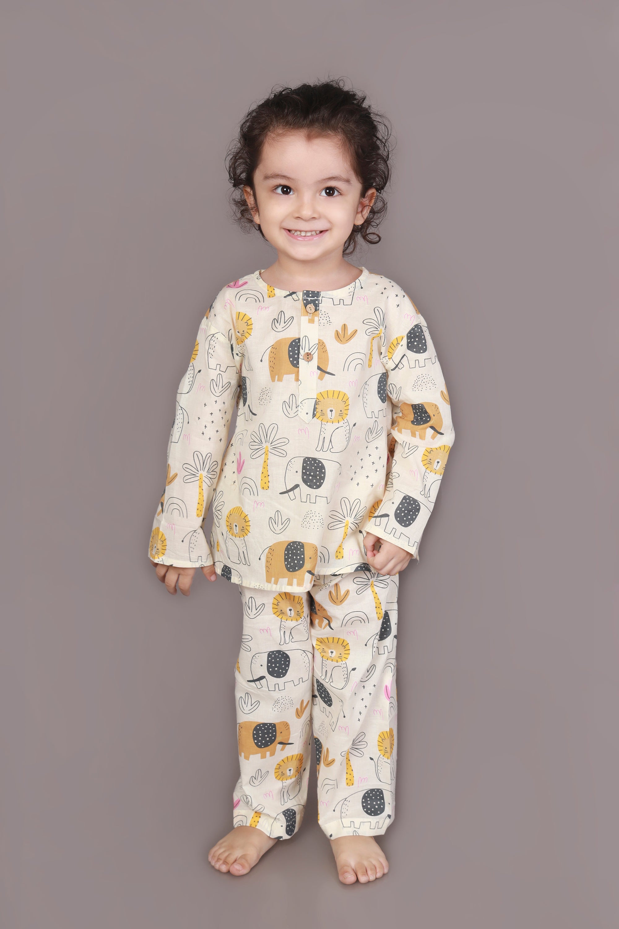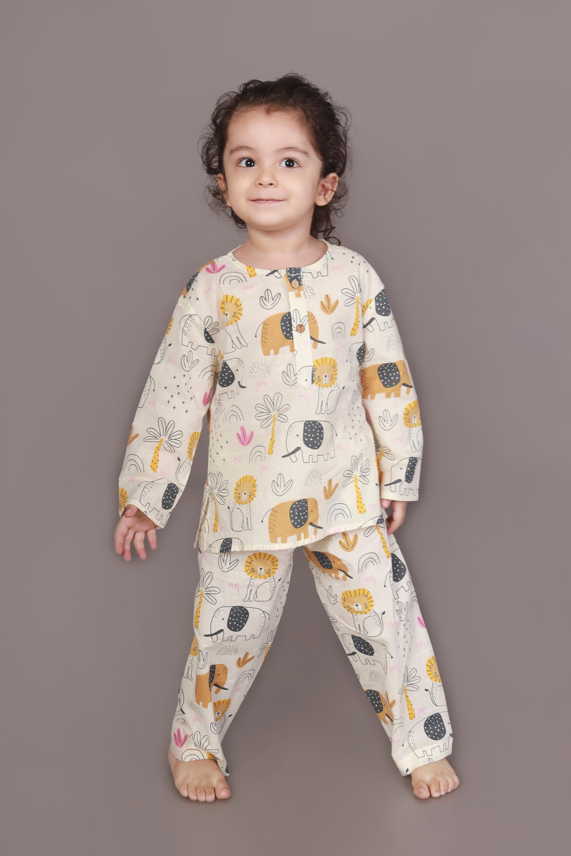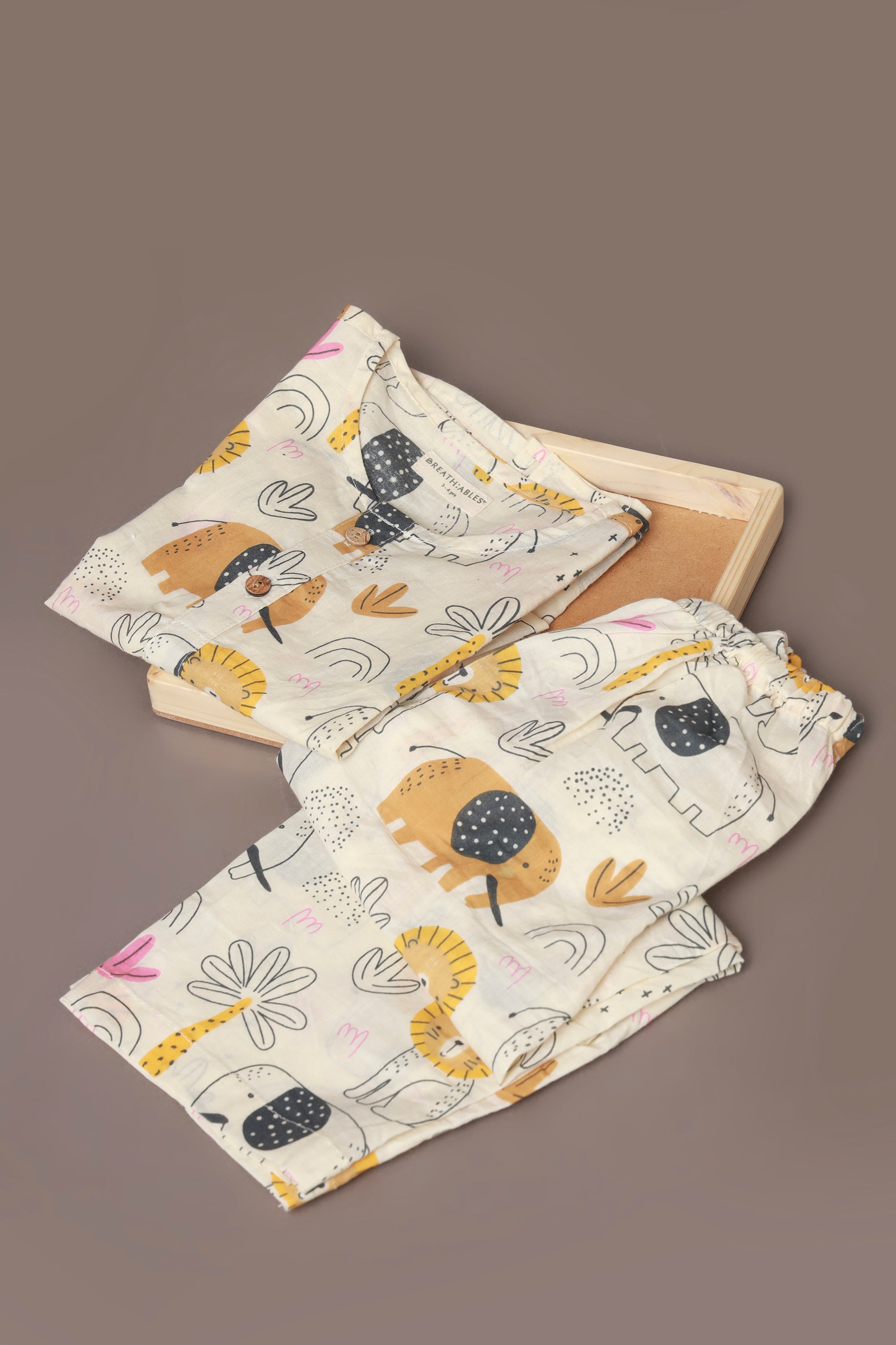 White Animal Print Cotton Nightsuit Set | Unisex Kids Sleepwear