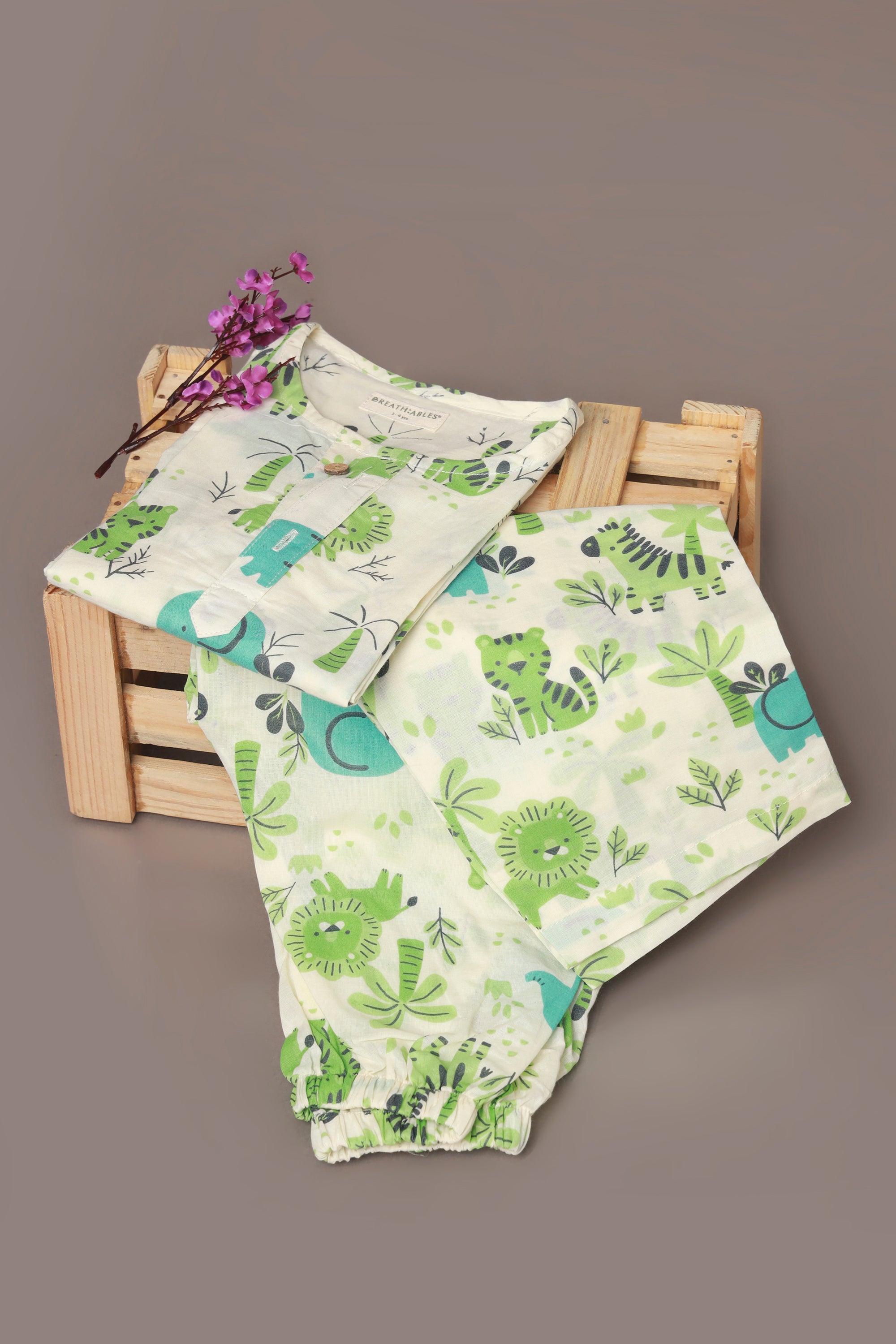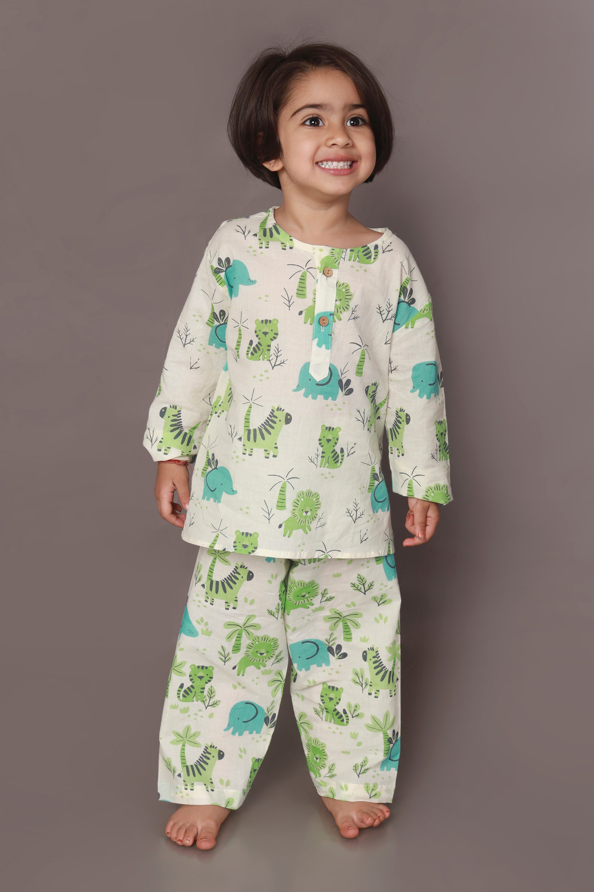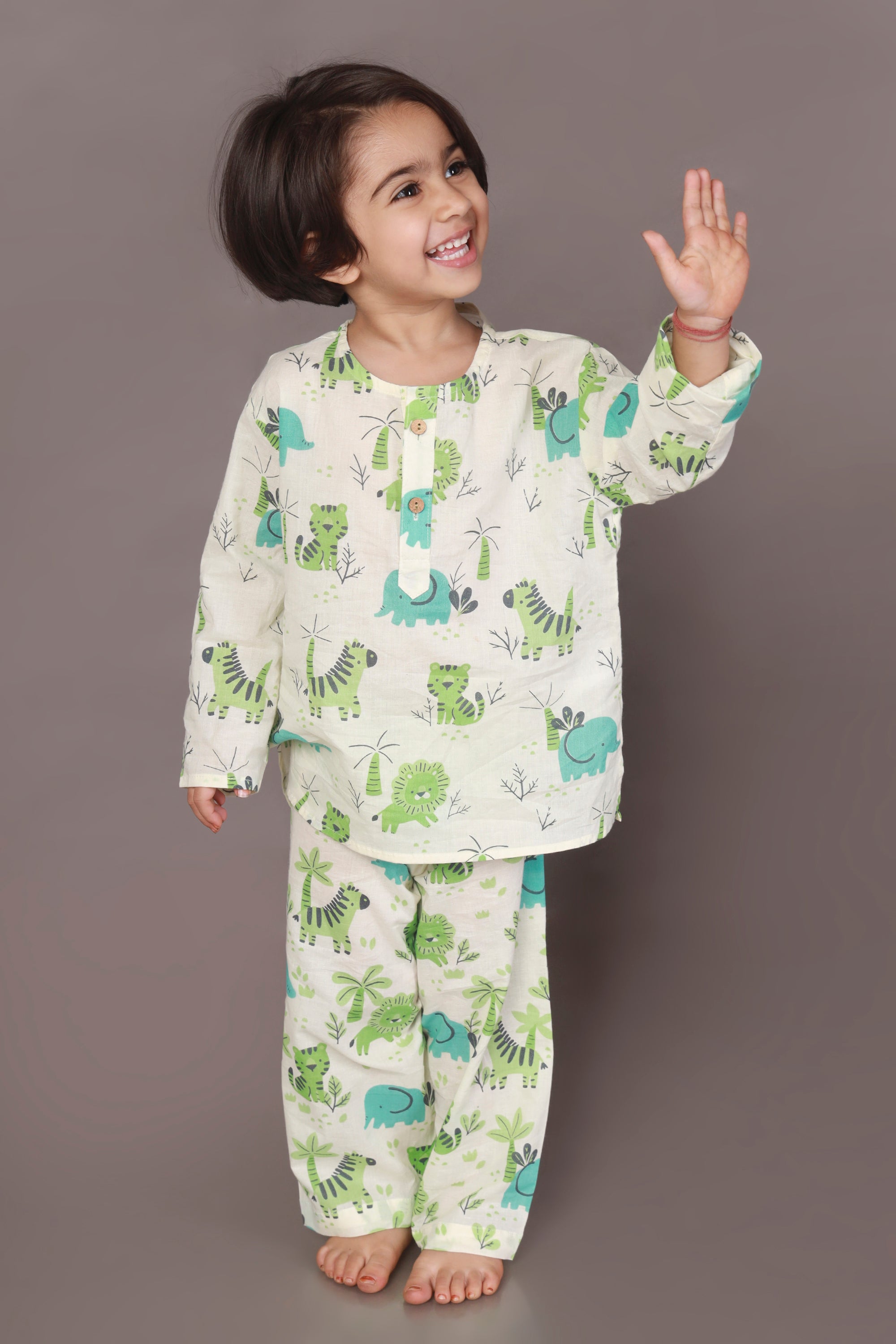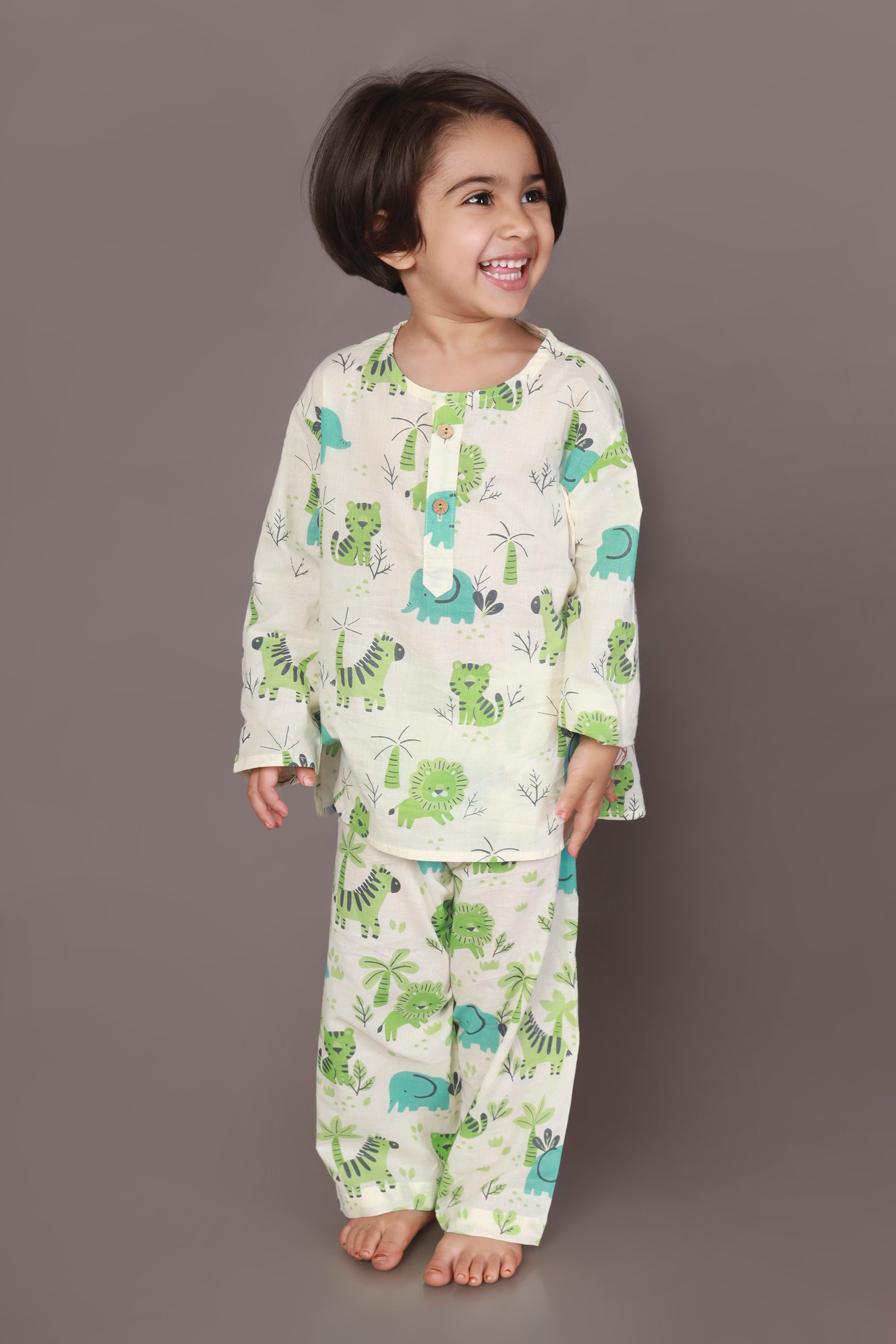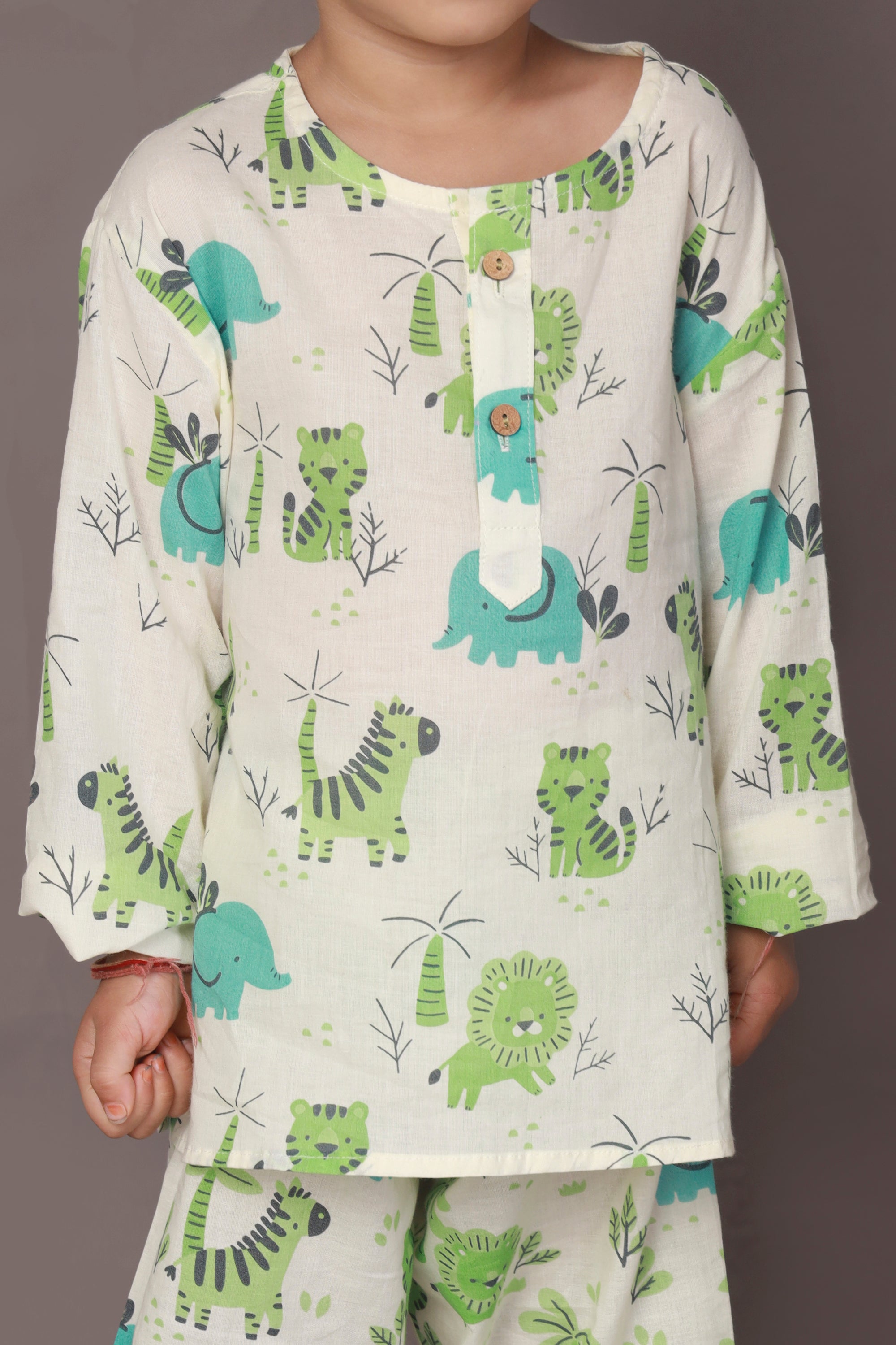 This breathable cotton nightsuit is crafted to keep your child comfortable and cool throughout the night. Featuring a charming blend of blue and green animal prints on a crisp white background with playful design. The kurta offers a relaxed fit making it ideal for restful sleep or relaxed mornings at home. Perfect for parents seeking both comfort and style in their child’s nightwear.