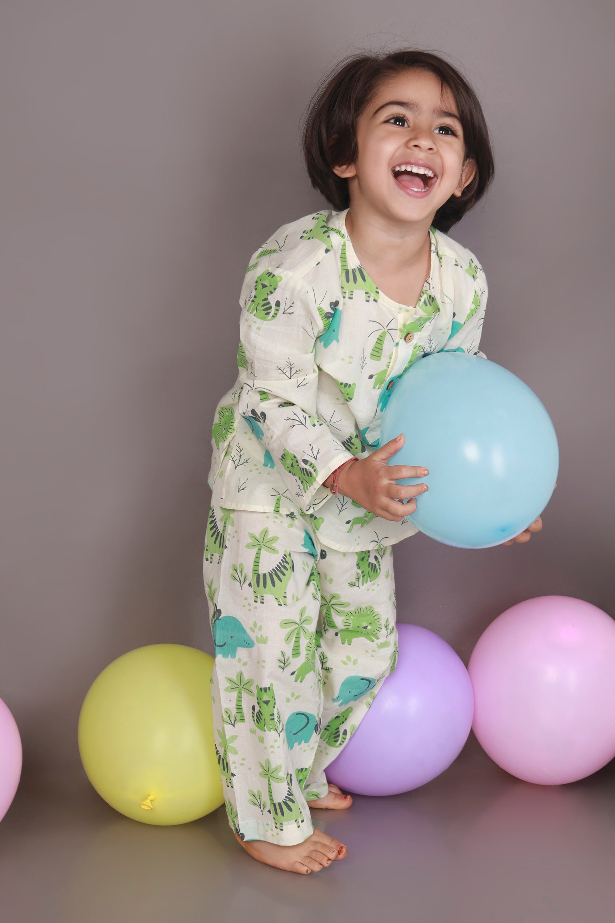 White Blue-Green Animal Cotton Nightsuit | Unisex Kids