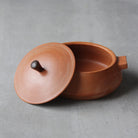Seasoning the Pot:: This only needs to be done one time, before use. Fill the pot to the brim and leave overnight. Discard the water and after drying, apply oil with fingertips to the surface inside out. Leave for a few hours. Rinse again throughly, the pot is now ready to be used. Cooking on the Stove-top:: Start on low heat. Increase temperature to medium. Unglazed pots hold all the heat given to them, so no heat is lost and there's no need to go past medium setting. Care and Cleaning Use wooden spoons. They go well with the pots and do not scratch the surface. Clean them as needed. Unglazed pure clay pots become completely non-stick in a few uses so cleaning them is very easy. Also, since most of the steam rising from the food is locked inside food seldom burns or sticks to the bottom. Using baking soda is recommended for cleaning: wet the pot and lid thoroughly with water, sprinkle 1/2 tsp of baking soda, scrub and rinse off. Dry the pot with a cotton towel/rag and put it away to dry. Handmade in India by skilled artisans who work on each piece from start to finish. Inspired by the spirit of slow food and local food -- made by people who love food for people who love food. Completely food and human safe. Flameware pottery holds heat, keeping food warm during mealtime. Does not pit or leach metals or other chemicals into food or the environment. Arth Pots and Pans are completely food and human safe. Flameware pottery holds heat, keeping food warm during mealtime. Does not pit or leach metals or other chemicals into food or the environment.