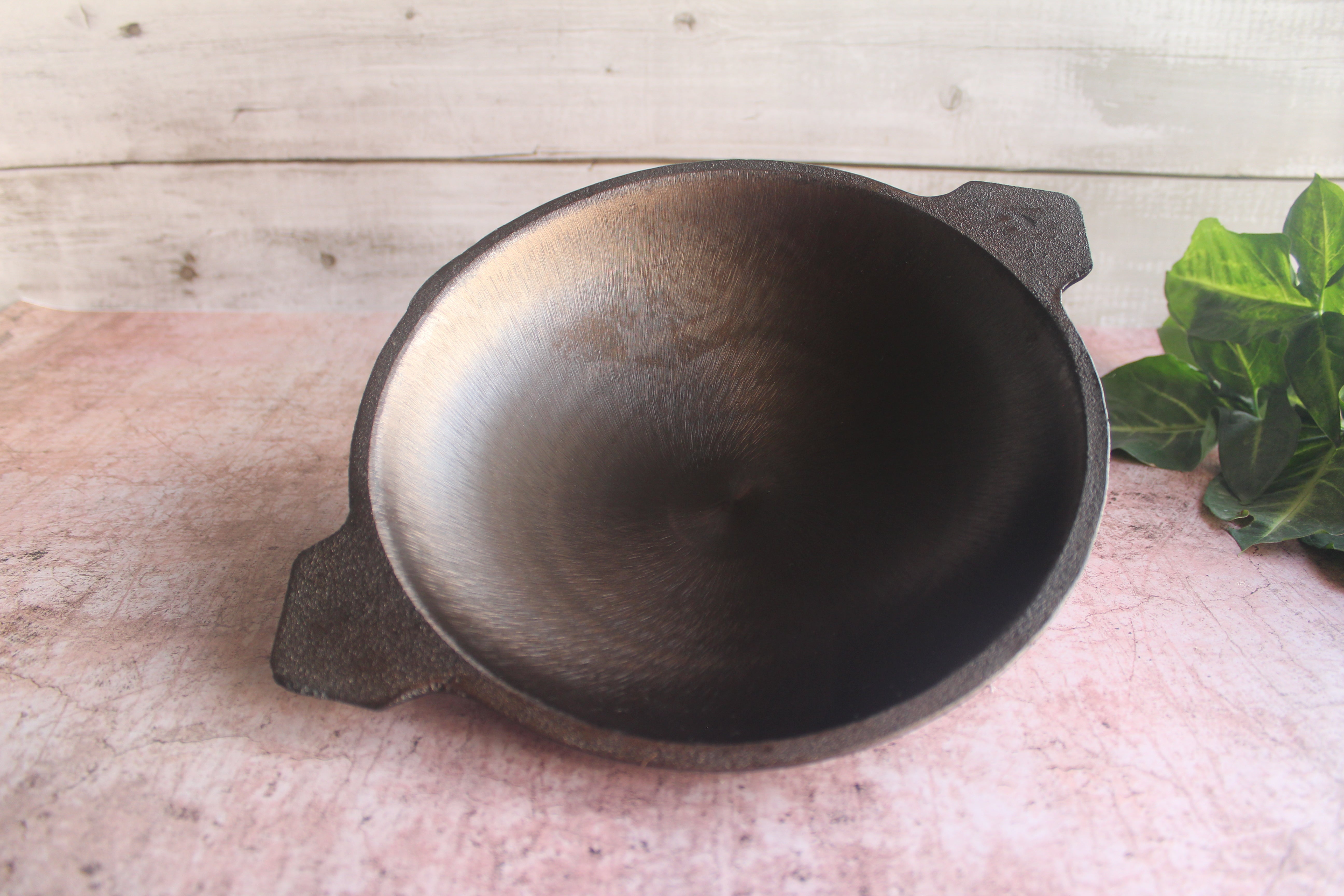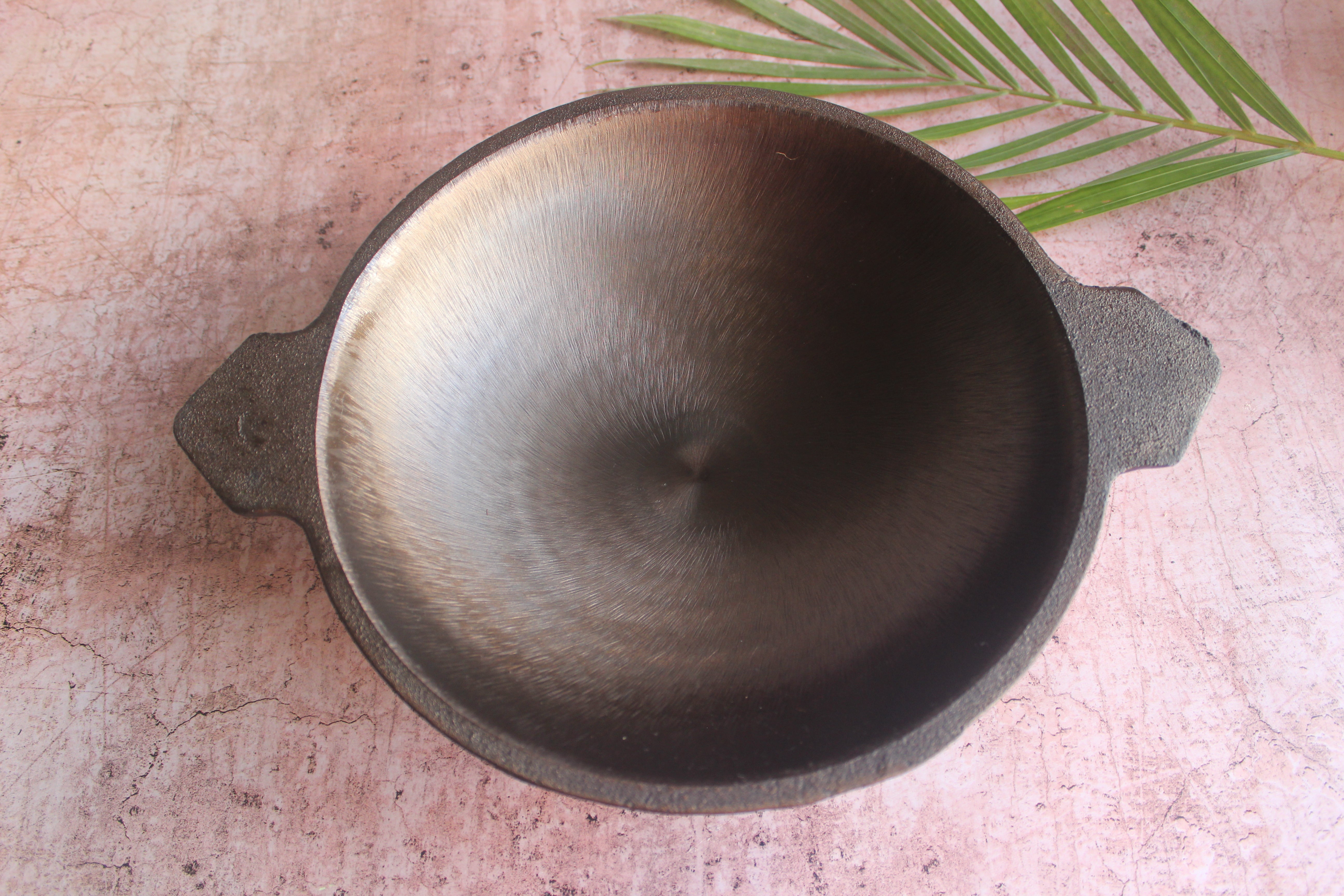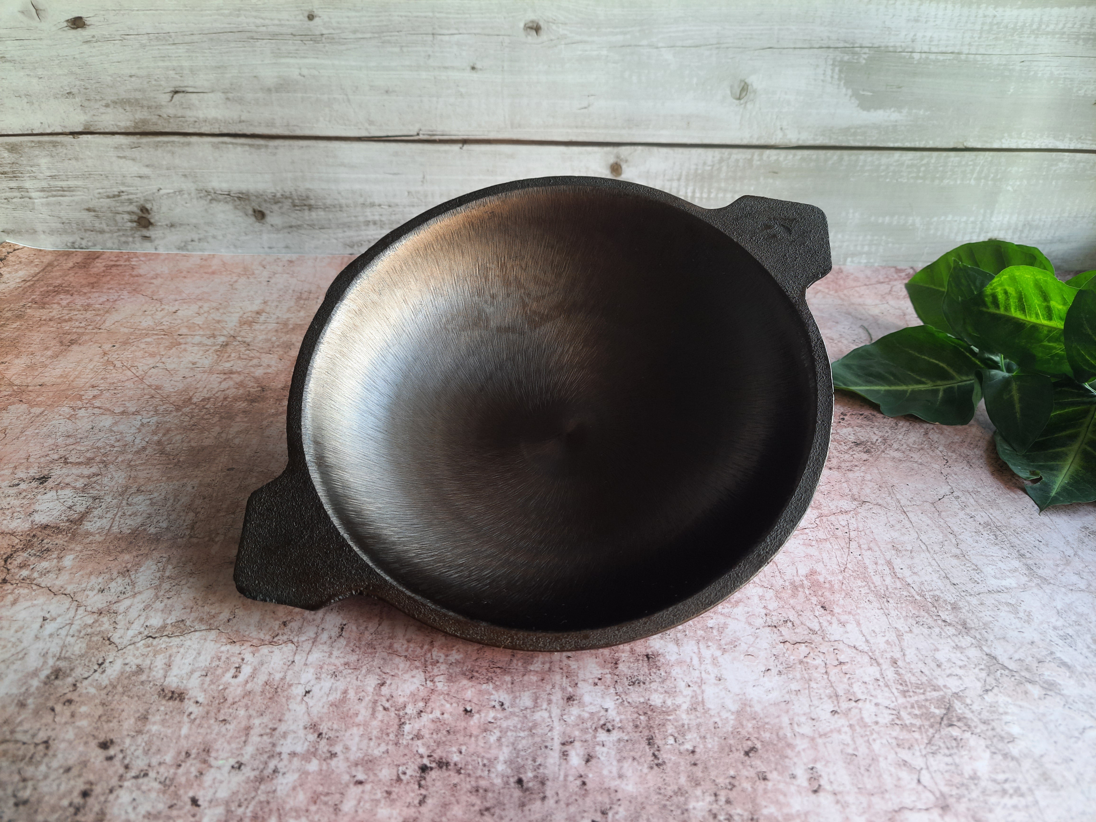 Cast Iron Smooth Appam Pan, designed to elevate your appam-making experience. This premium pan comes pre-seasoned, ensuring a natural non-stick surface that requires minimal oil or butter. Crafted from non-toxic and sustainable materials, it boasts a smooth finish that prevents appams from sticking, resulting in consistently perfect appams crispy outside and soft inside. With its ideal size, it allows you to create large, fulfilling appams effortlessly. It has been hand-seasoned with vegetable oils by our skilled artisans, adding an extra touch of care and expertise. In addition to its exceptional performance, this pan is environmentally friendly, combining durability, convenience, and culinary excellence into a single product.