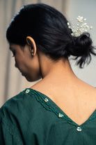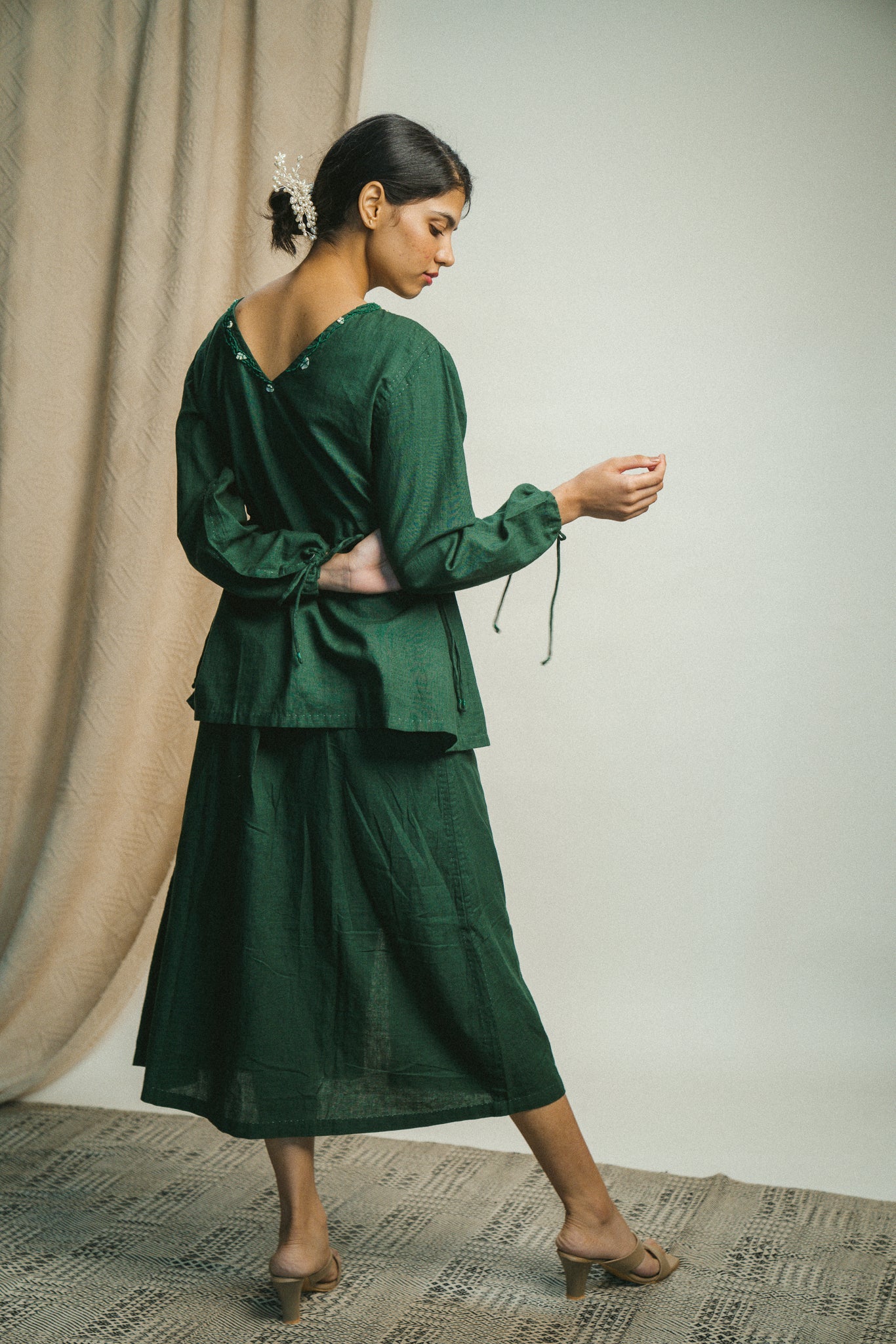 The Rewind Peplum Blouse and the Rewind Flared Skirt come in a rich and elegant shade of green that we call Secret Path. The 60s cotton skirt comes with a mid-slit and features side pockets and is intricately adorned with bullion knots and uncut mother of pearl as embellishment along the slit and the bottom hem. A classic piece for any season.