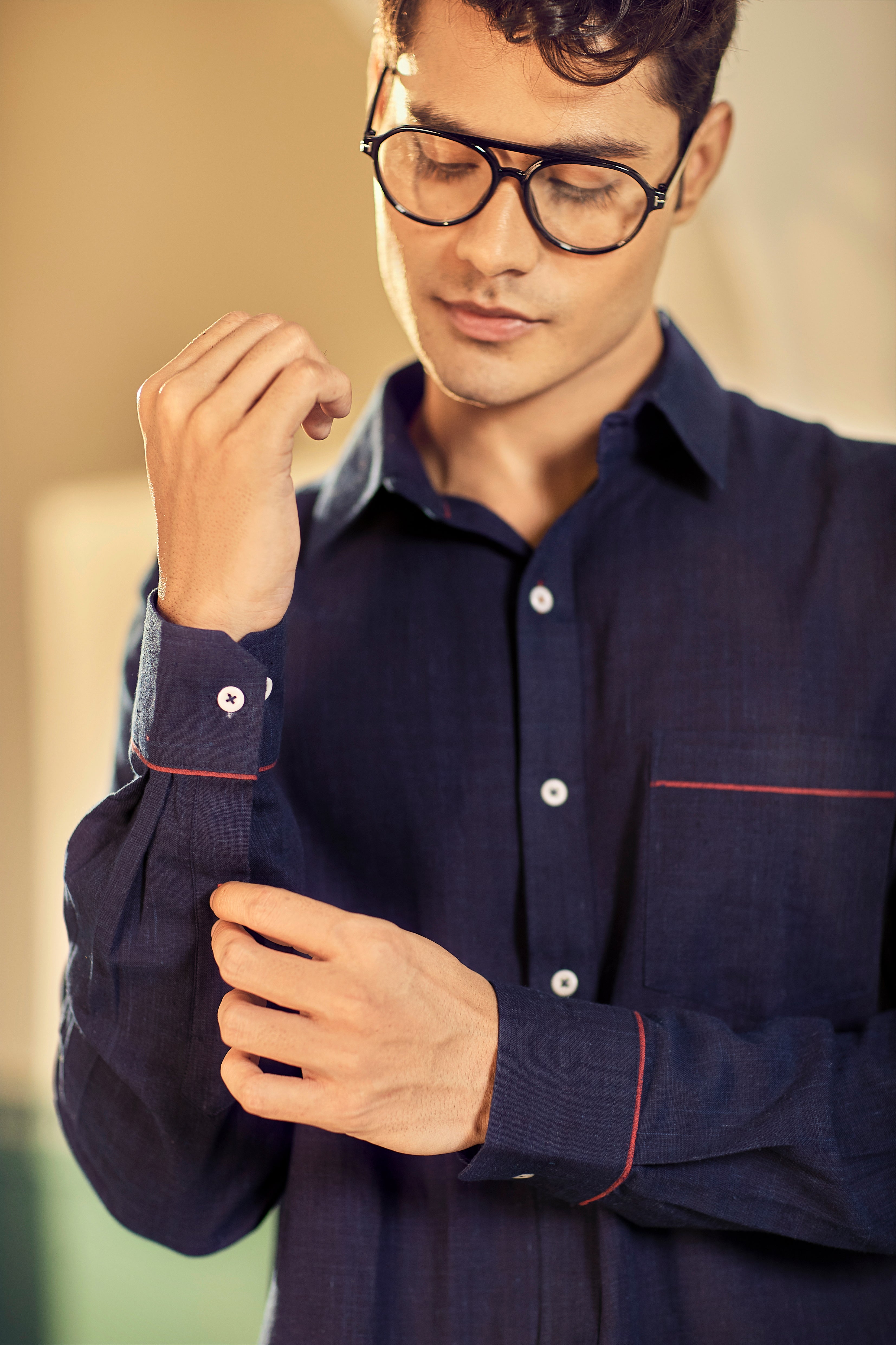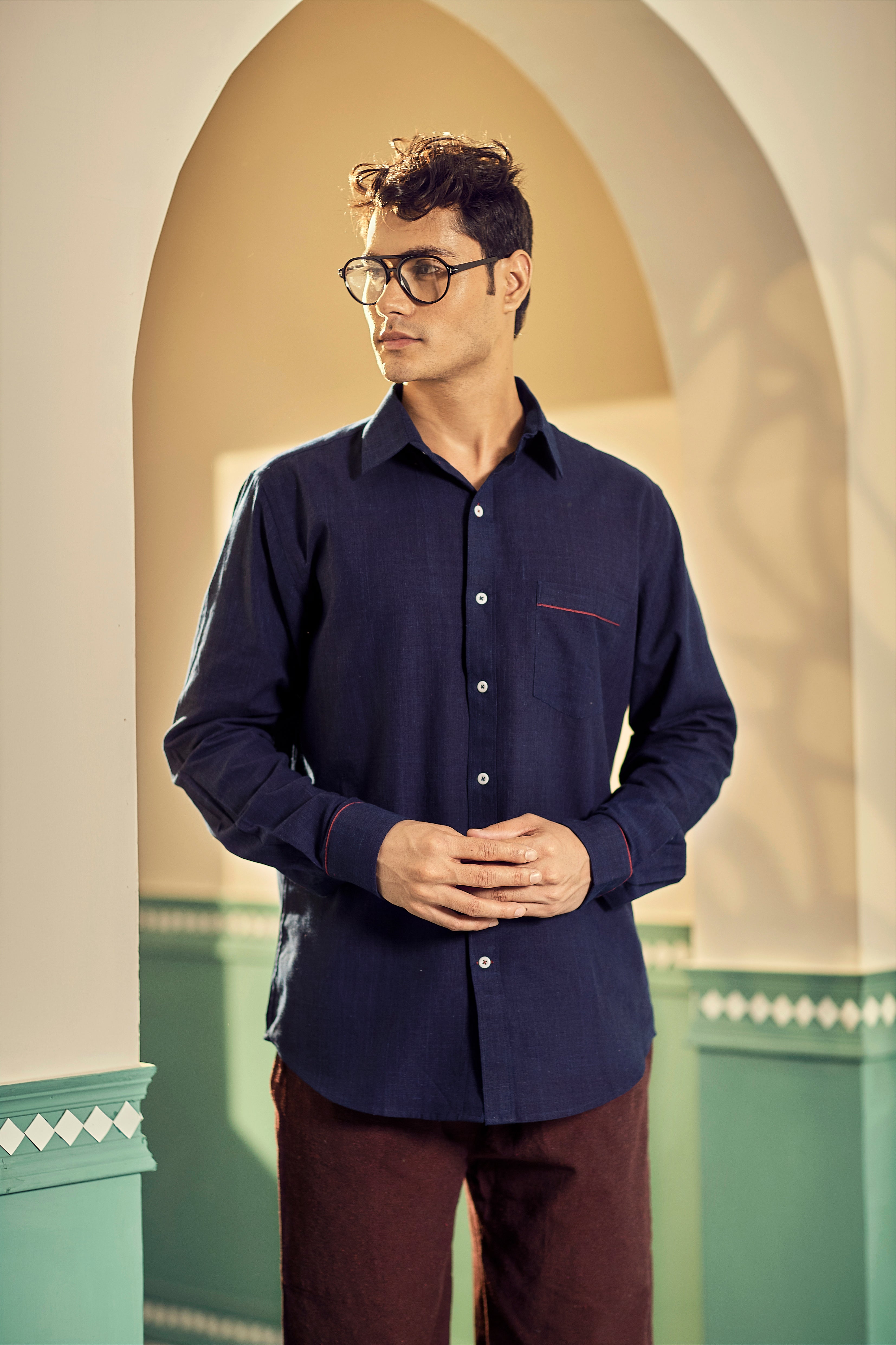The shirt is consciously crafted and hand-woven by the weavers of Udyog Bharti from Gondal, Gujarat. It features a relaxed design made elegant by the finishing red strips and embellishing corozo buttons.