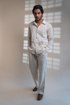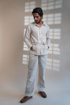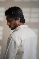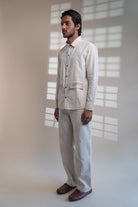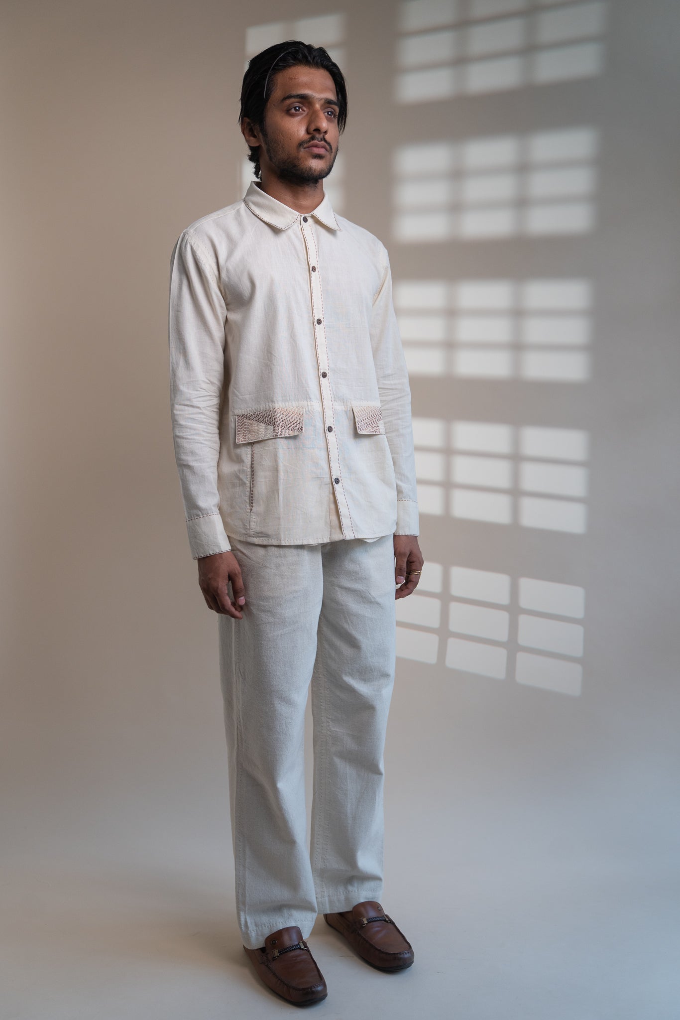 This Dawning Flap Detailed Shirt comes in a calm and soothing colour that we call Kora. A contemporary take on the classic long sleeve shirt. Crafted in 100% cotton fibres and natural materials. This 60s cotton button-down shirt is undyed and unbleached. Details include intricate Kantha stitches, a form of Indian hand embroidery on the faux flaps and pockets.