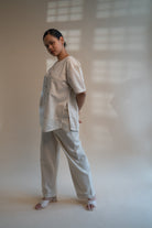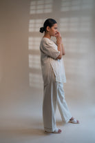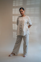 This Dawning Layered Shirt comes in a calm and soothing colour that we call Kora. Crafted in 100% cotton fibres and natural materials. This layered shirt with an interesting play of panelling of two fabrics, Kala Cotton and self-checked is undyed and unbleached.