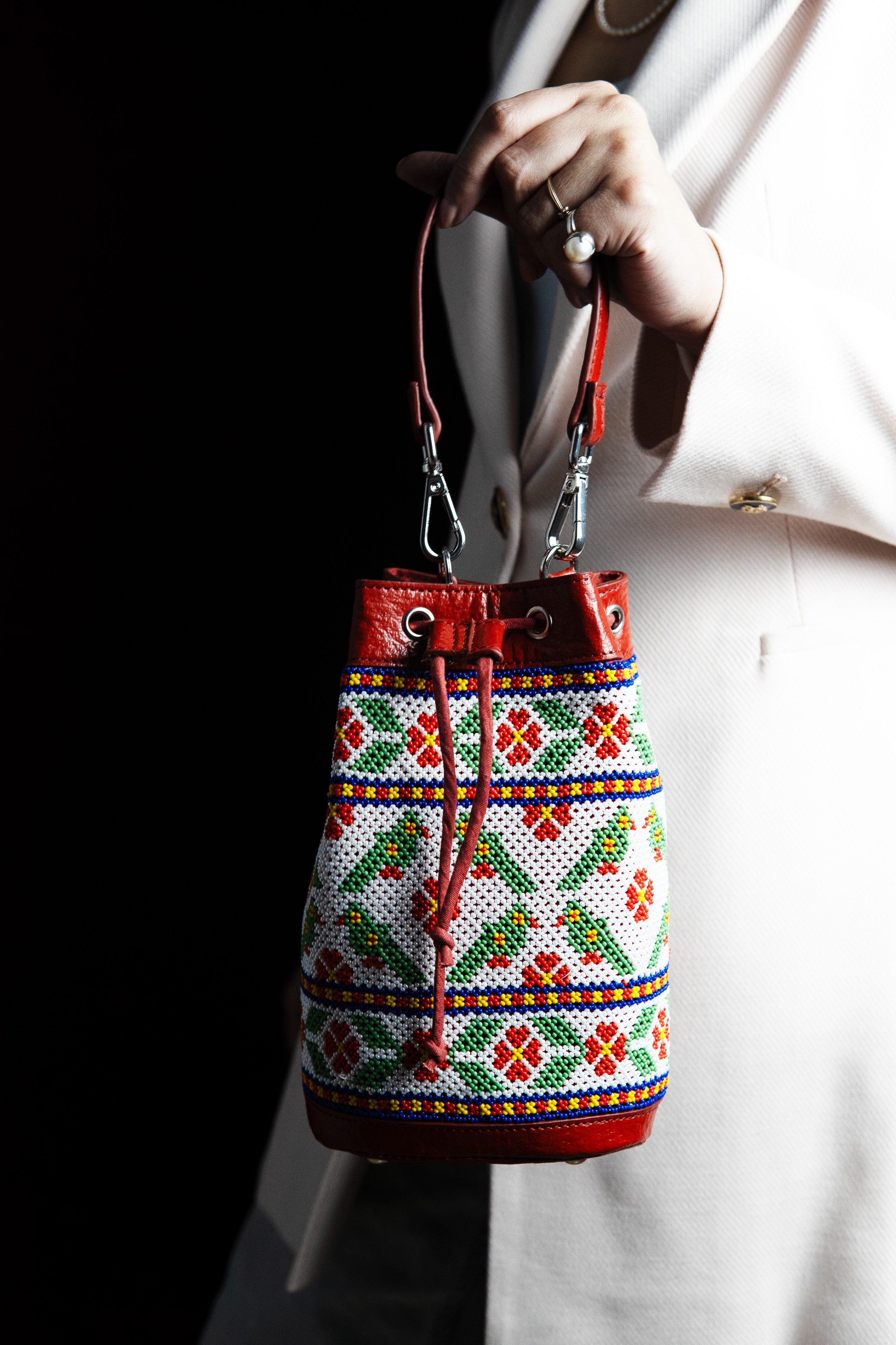 Experience the charm of tradition and sustainability woven into this exquisite hand-beaded bucket bag. Crafted from banana fiber leather, a premium vegan alternative, this bag embodies luxurious style while prioritizing eco-consciousness.
