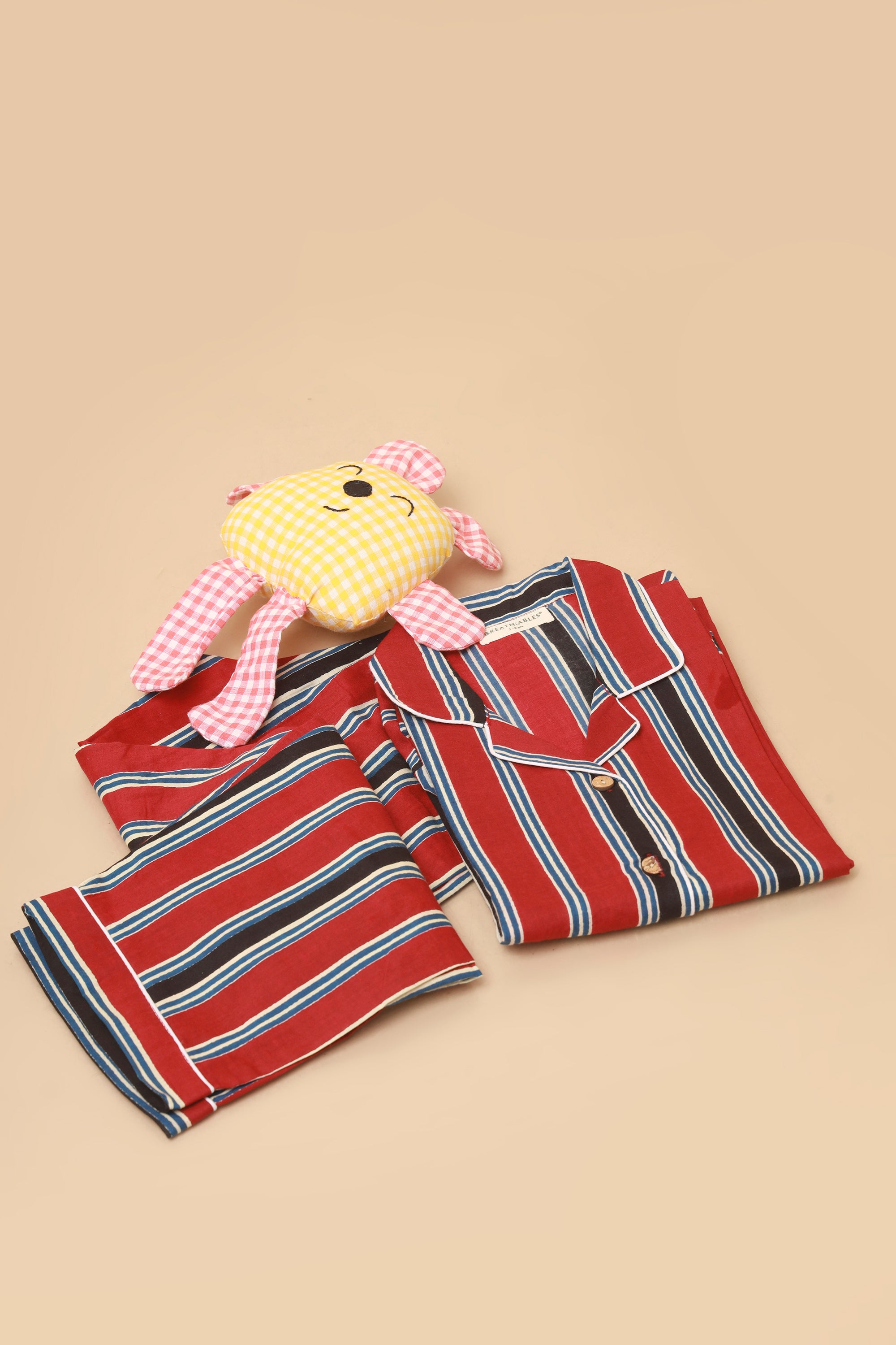 Bring some classic flair to naptime with this red striped shirt and pyjama set for kids. BREATH:ABLES’ full-sleeve co-ord set features a notched collar shirt paired with comfy PJs – all in breathable cotton. Timeless, bold, and tailored for maximum cuteness and comfort.