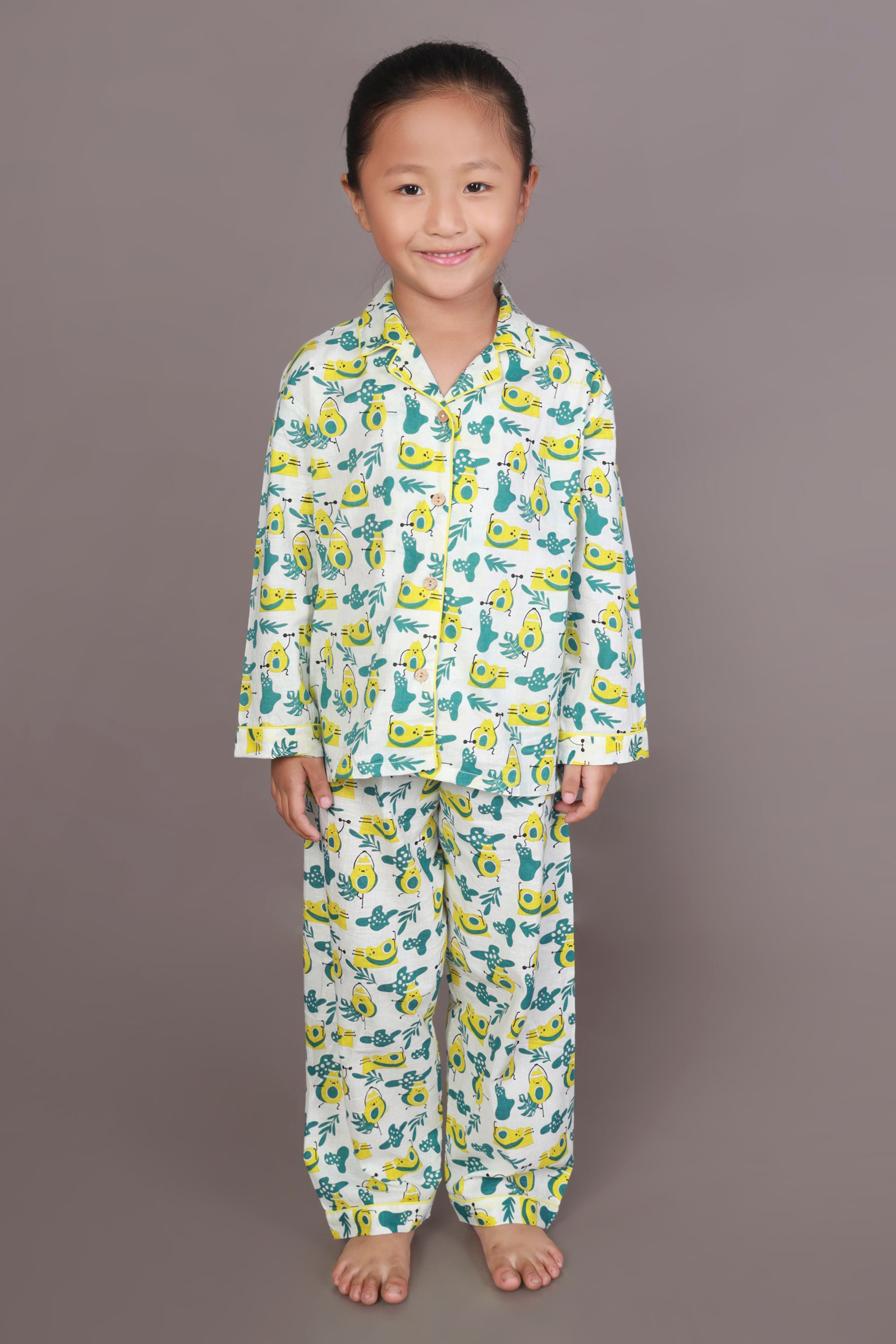 Kids Cotton Nightsuit – White Avocado Print Shirt & Pyjama Co-ord Set for Boys & Girls