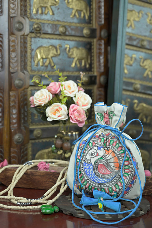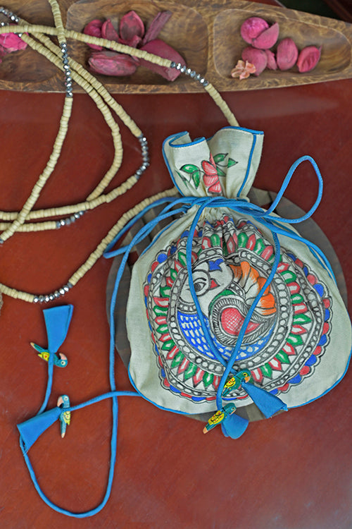 Adorned with beautiful hand-painted multicolor madhubani and contrast piping that add to its charm, our Silk potli is handcrafted, unique and intricate.This ethnic potli is perfect to go along with your traditional or Indo-Western attire.