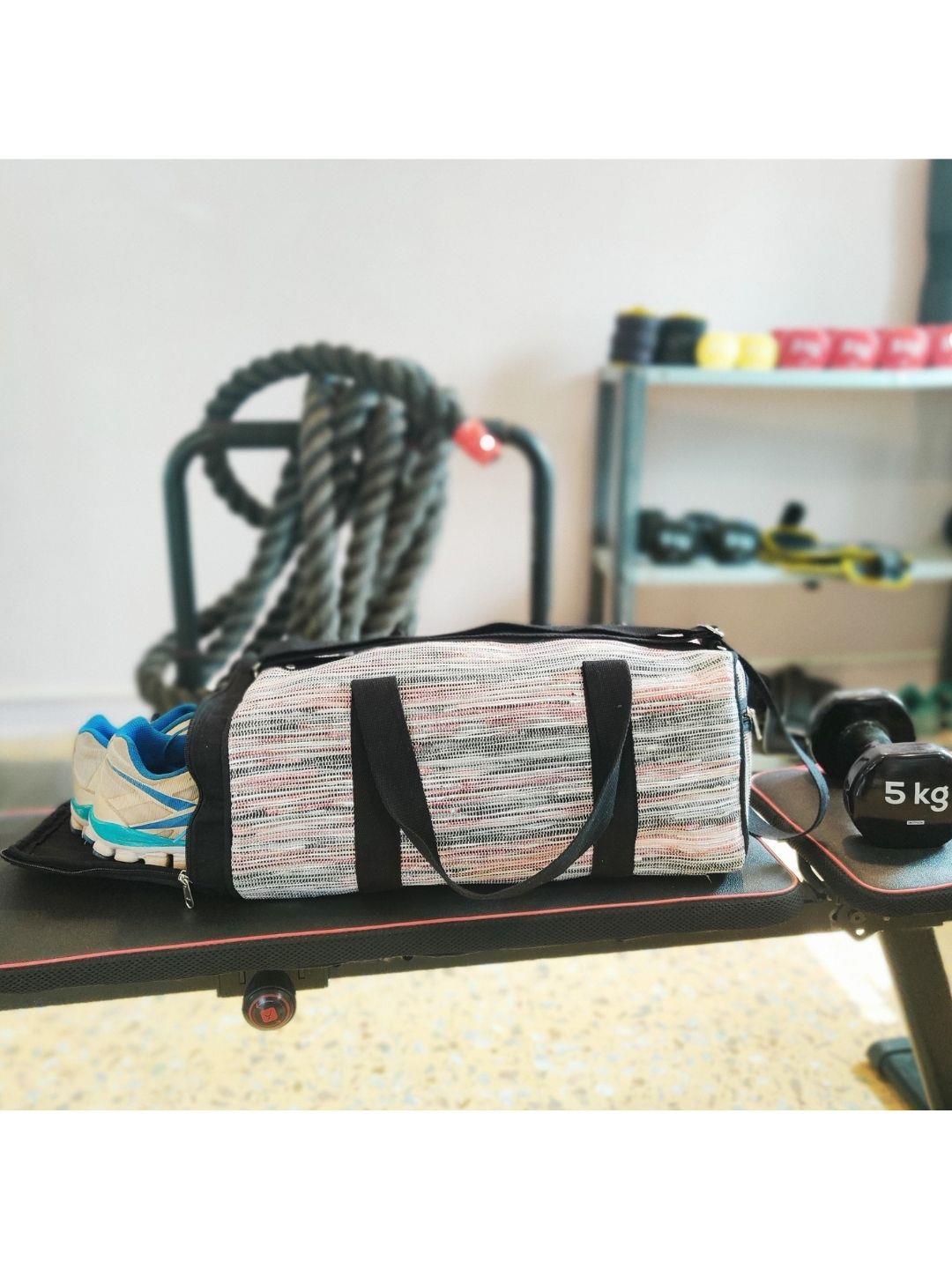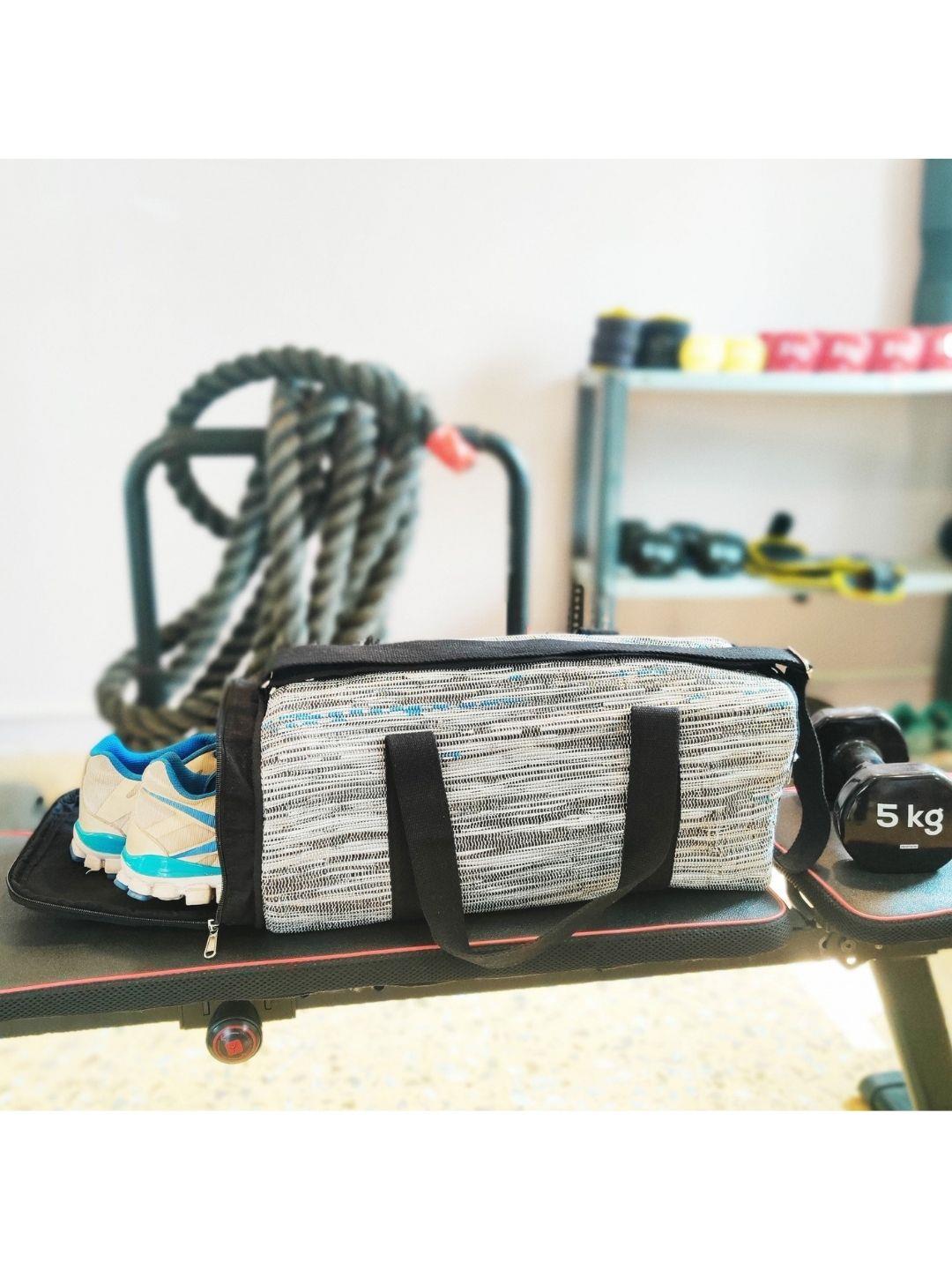 Be it your everyday fitness goals or a weekend getaway,reCharkha's UPCYCLED-HANDWOVEN Duffle Bag can be for both! Make this bag your forever companion and carry-it-around in vogue, as it can fit your -shoes in a compact weatherproof compartment, a towel, a bottle of water or smoothie, keys, and lots more!