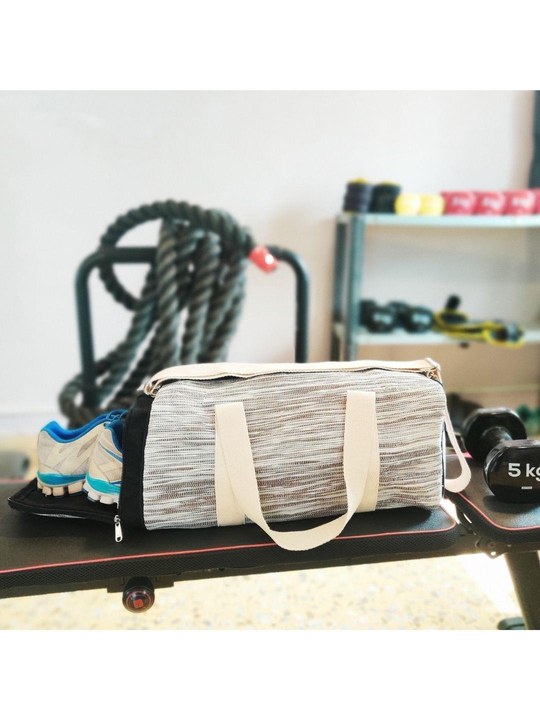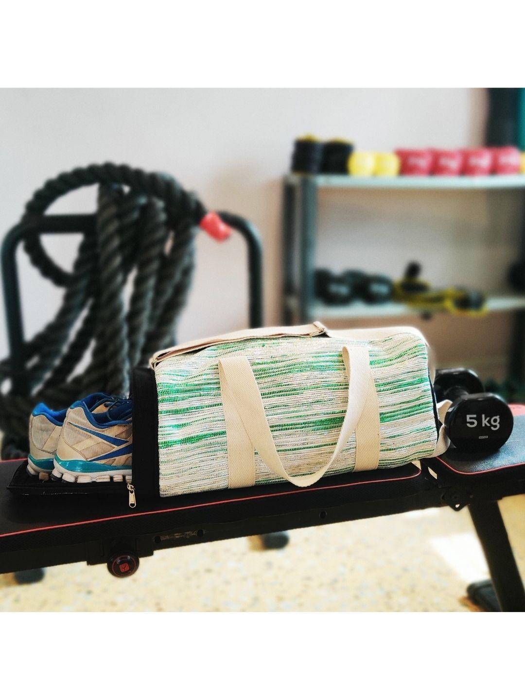 Dimensions: 18” x 8” x 8" (l x b x h) Product Details: reCharkha's UPCYCLED-HANDWOVEN fabric made from waste plastic on the outside, unbleached cotton fabric lining on the inside, two zippered side pockets, one small zipper pocket from inside, one pair of short cotton handles to hold the Gym Bag in your fist, and one long adjustable cotton handle, to sling it around your body.