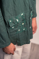 Crafted in 100% cotton fibres and natural materials. This 60s cotton shirt comes with pockets and full front panelling. The two patch pockets are extensively adorned with abstract lines of bullion knots and uncut mother of pearls as embellishment.