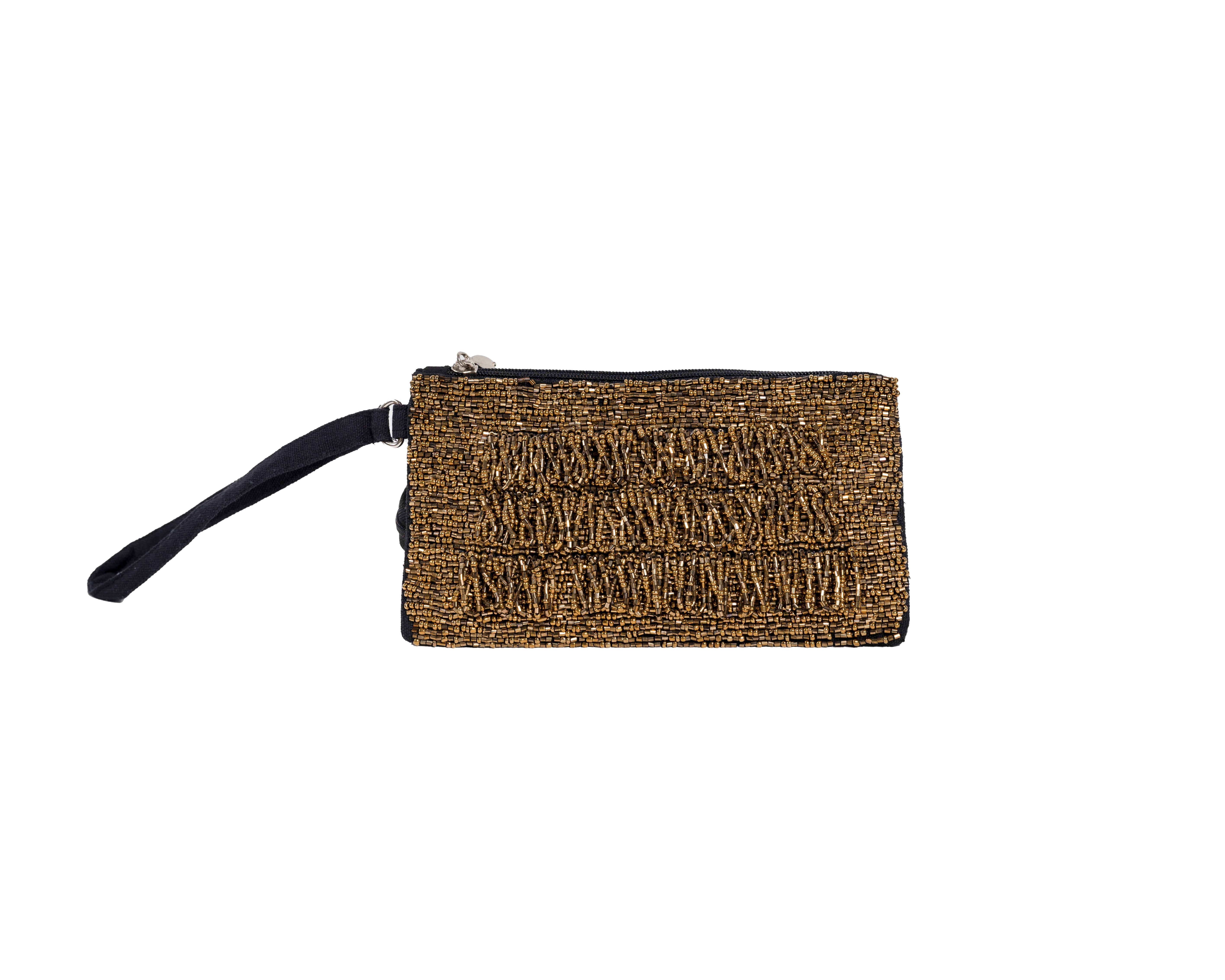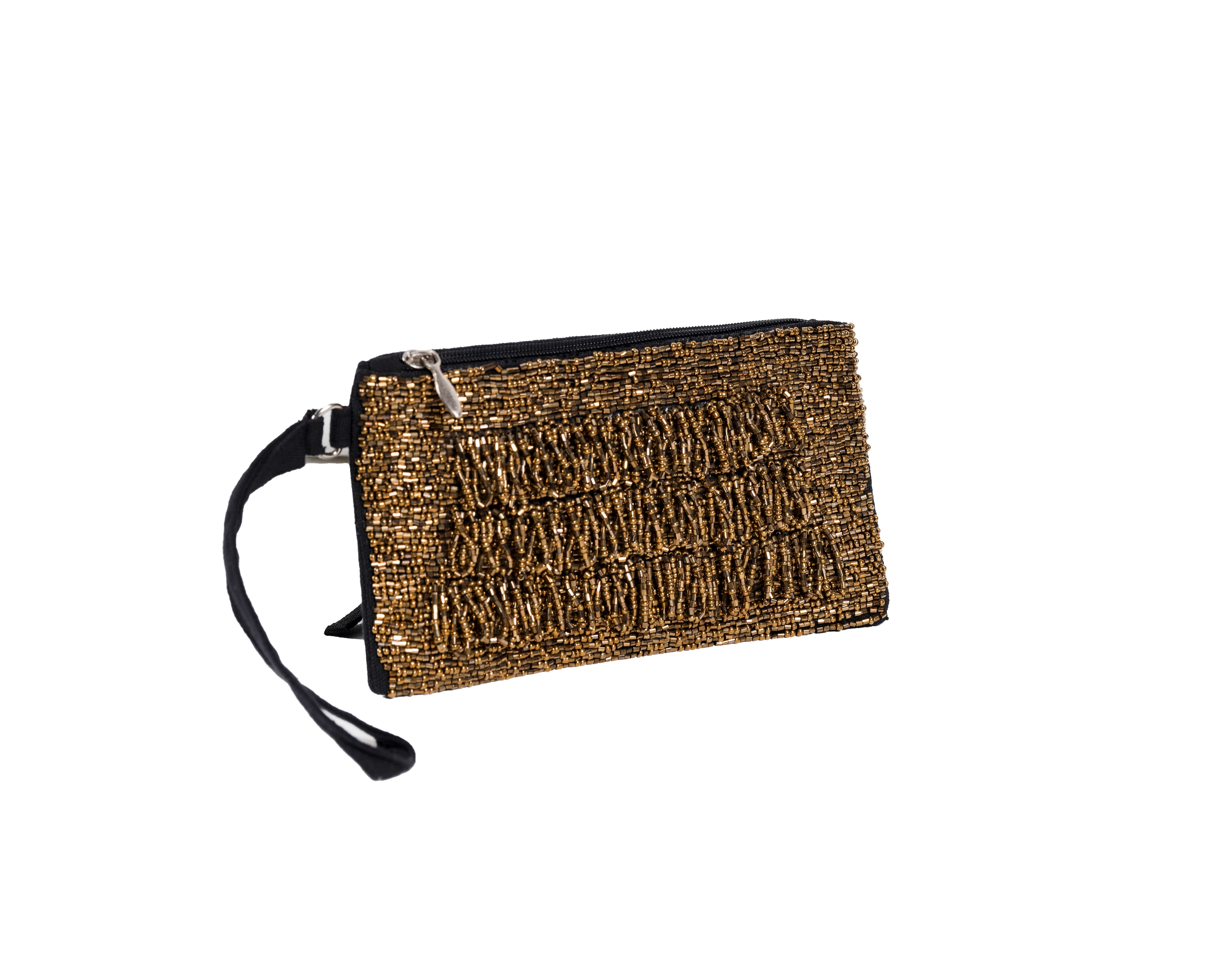 This sleek coin pouch sparkles with the brilliance of sunset-caught gold, featuring intricate beadwork by master craftsmen from Bareilly. The compact design conceals surprising functionality, while the detachable wrist strap offers versatile carrying options. Each tiny bead is carefully placed to create a textured surface that catches light from every angle.