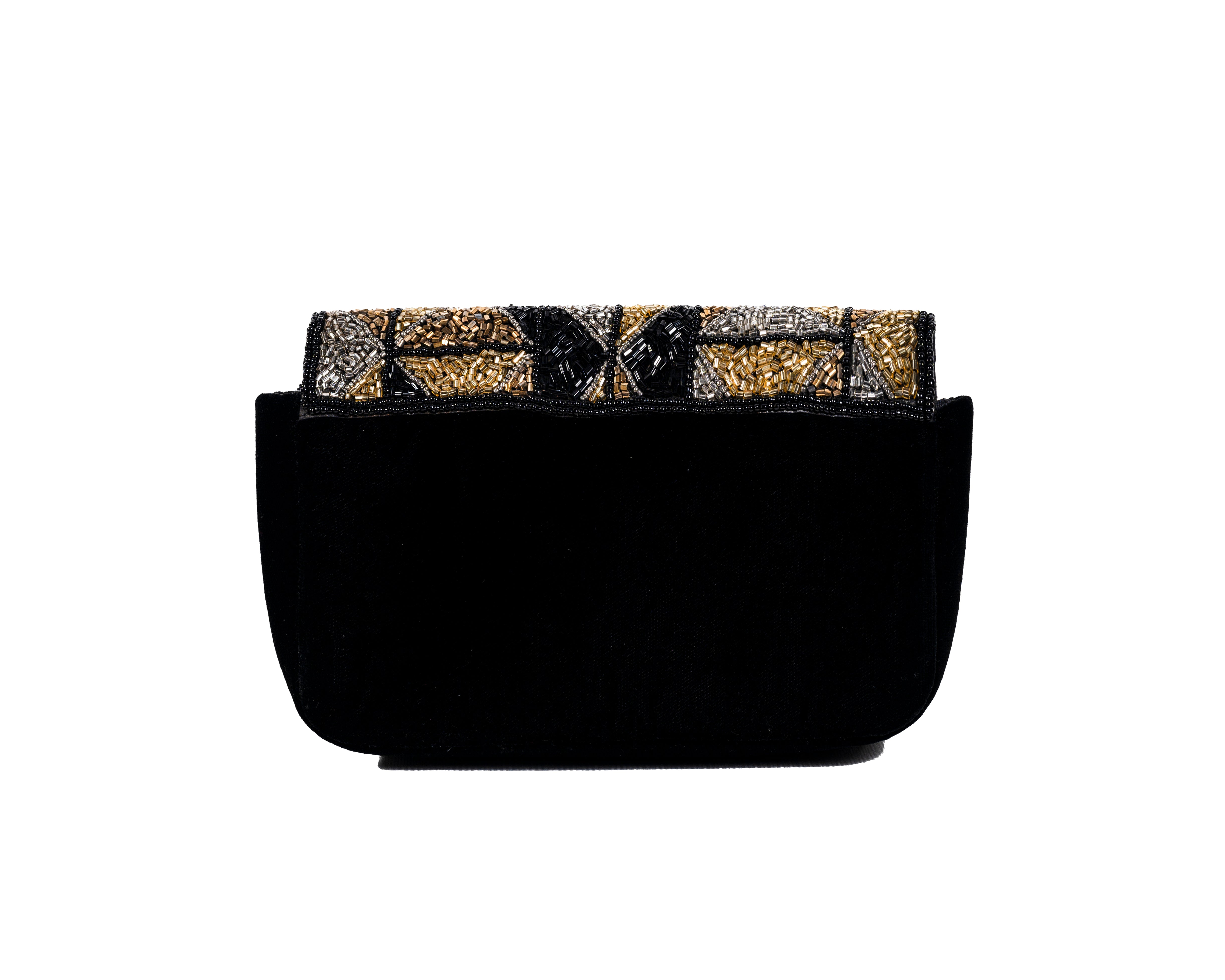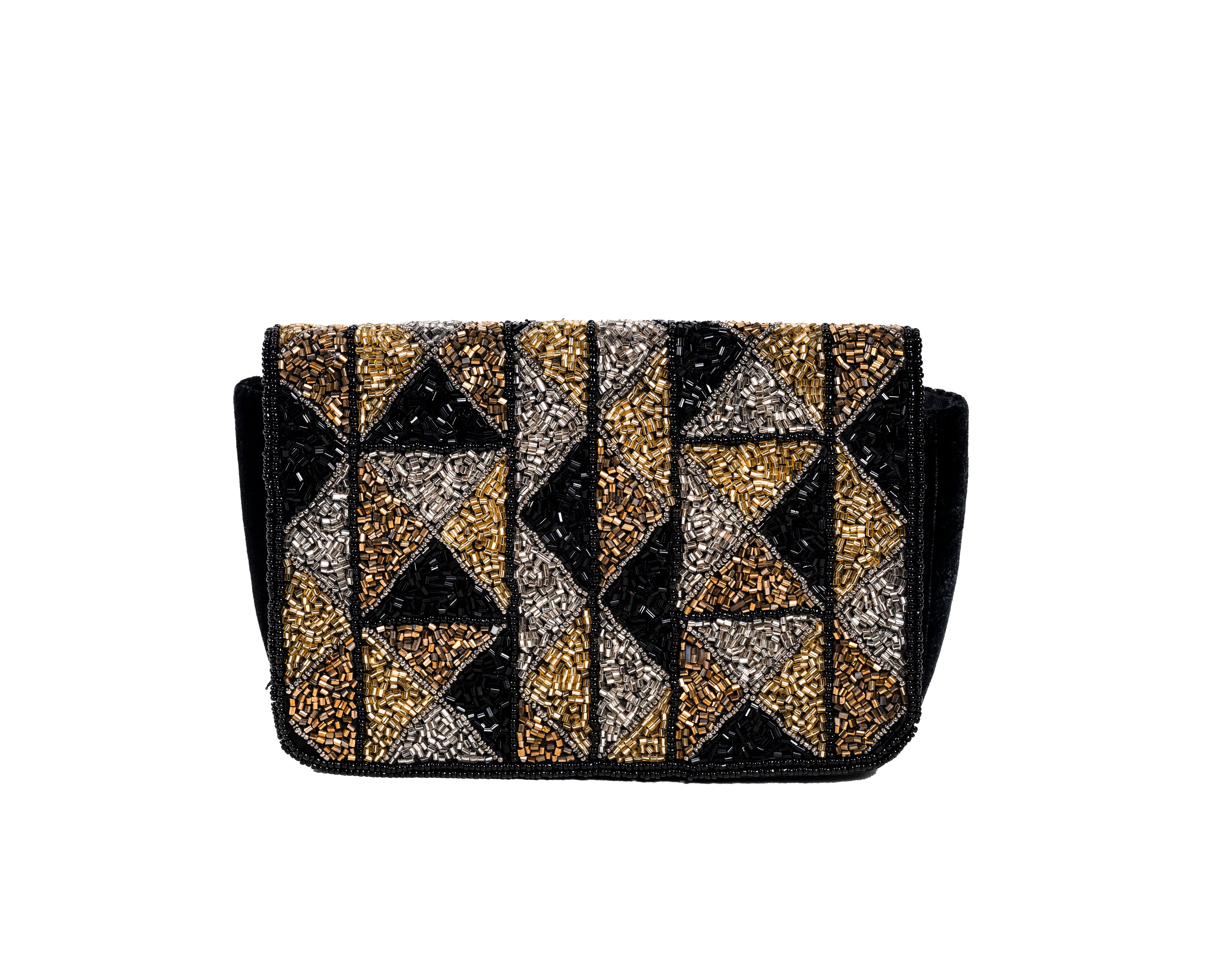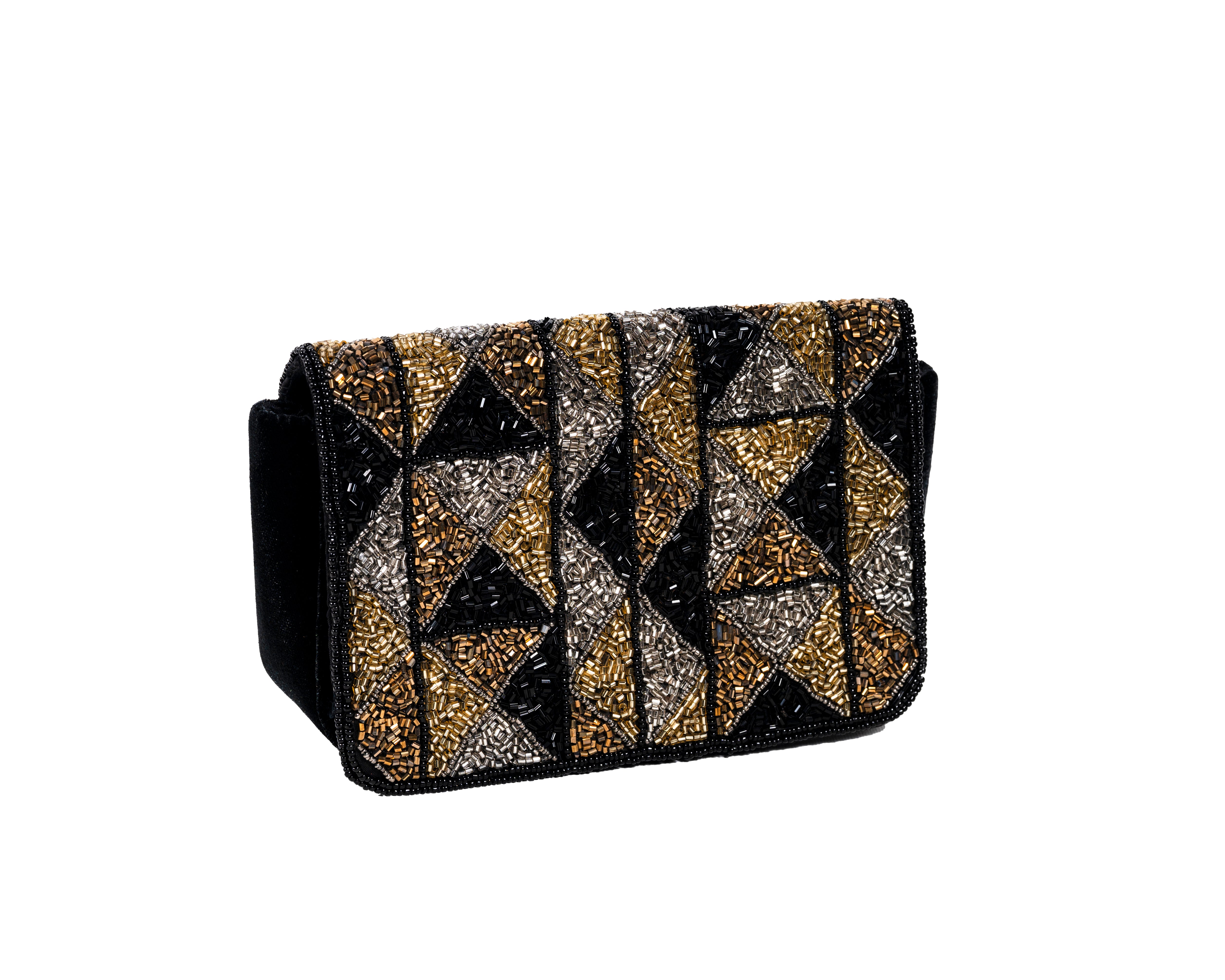 A masterpiece of modern geometry meets traditional craft in this striking evening purse. Featuring a bold pattern of triangles and squares executed in golden and silver beads by artisans from Lucknow, this piece makes a contemporary statement while honoring classical beadwork techniques. The expandable design offers practical space without compromising on style.