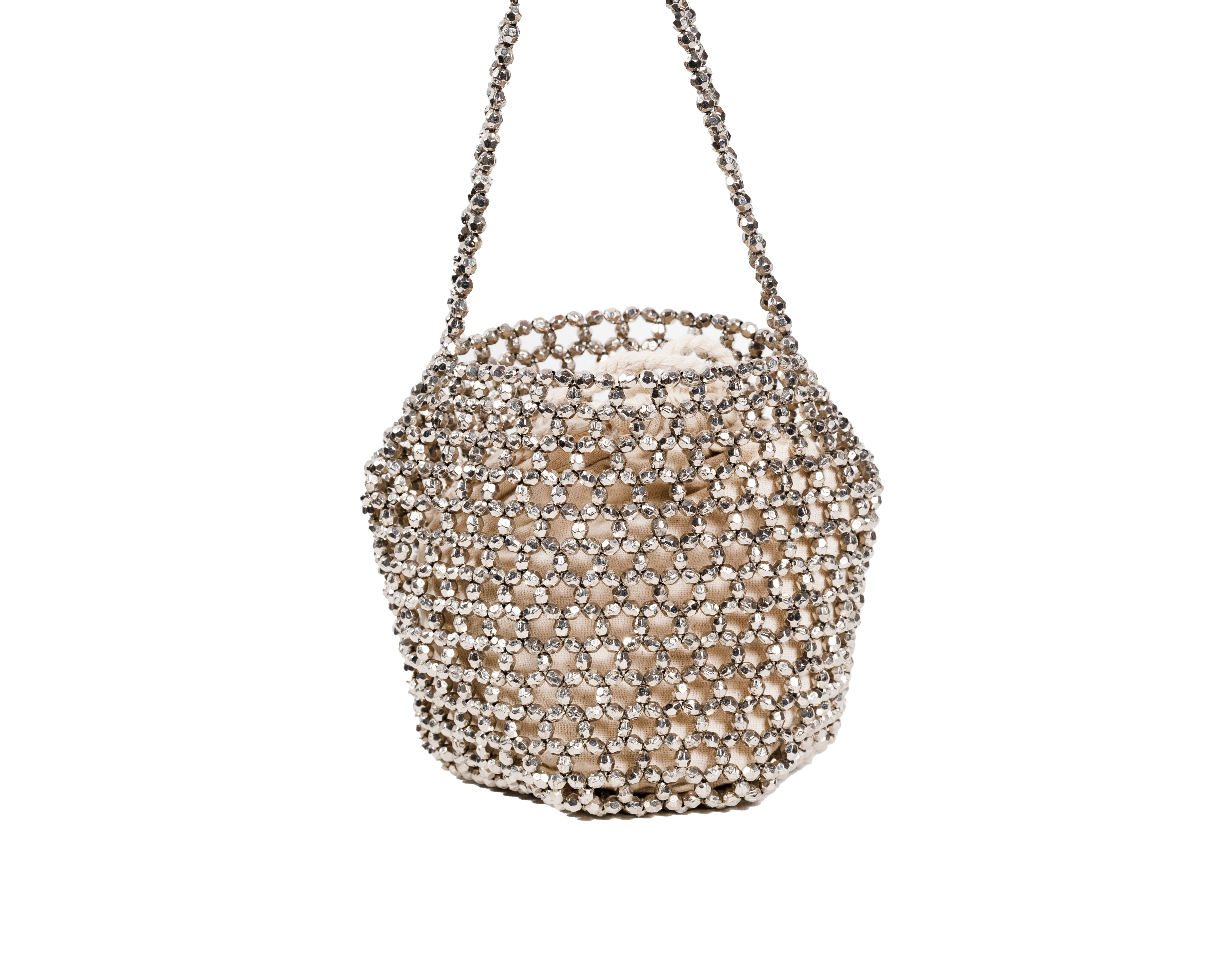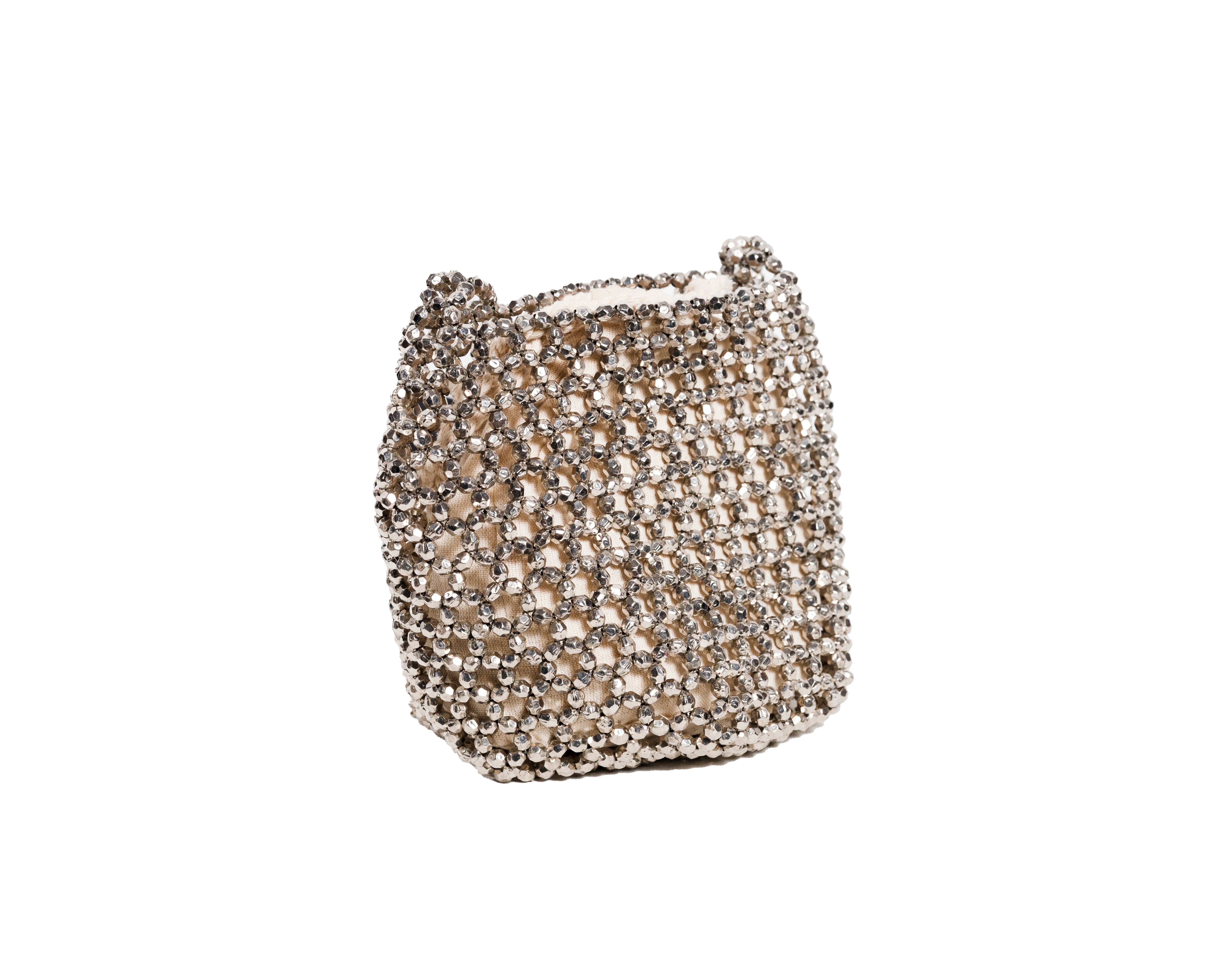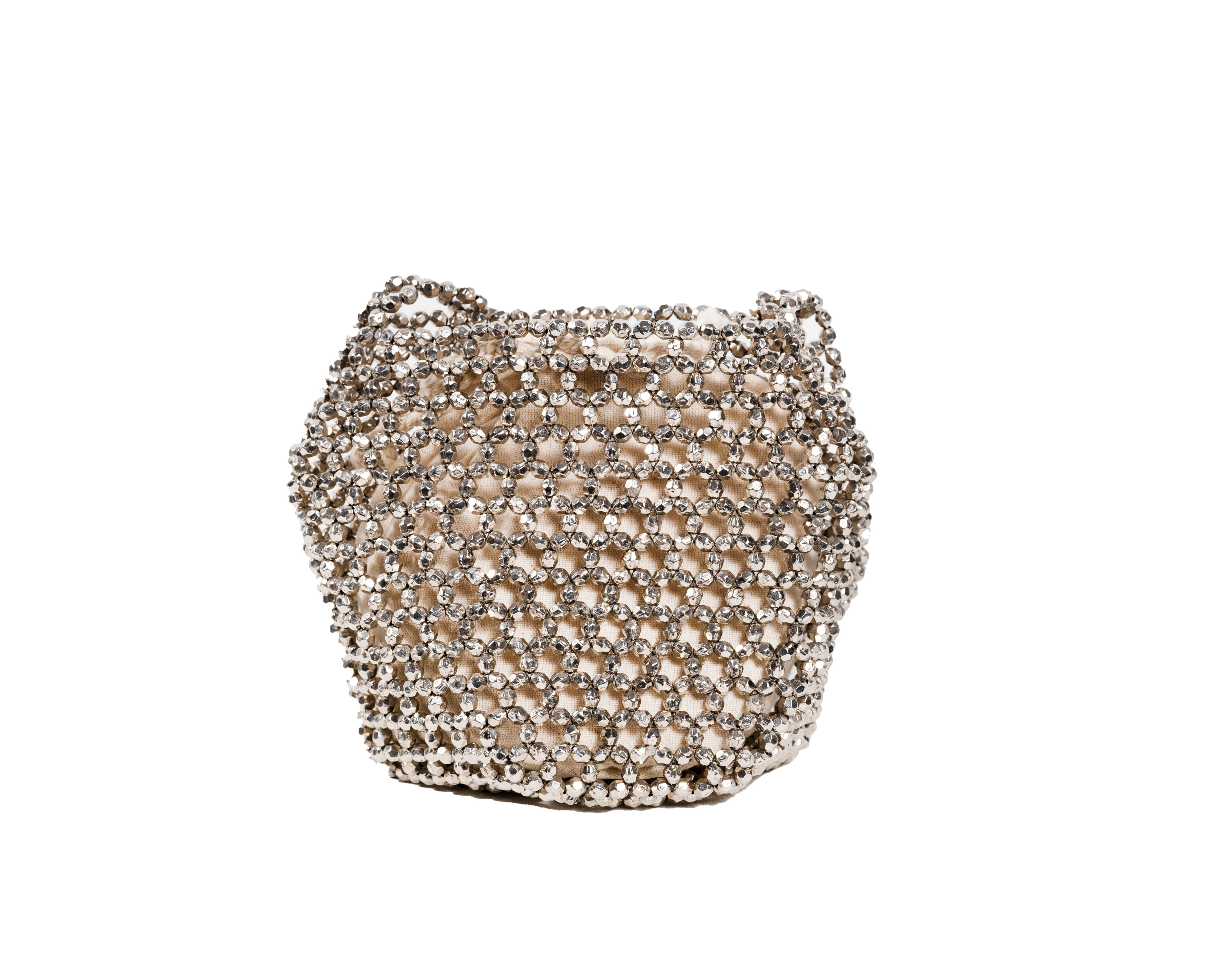 A stunning showcase of traditional beading expertise reimagined for modern elegance. This beautiful piece features an intricate honeycomb pattern of crystal-clear and metallic beads, handcrafted by artisans from Bareilly. The sophisticated design creates a mesmerizing play of light and shadow, while the chain strap adds versatility to this statement piece.