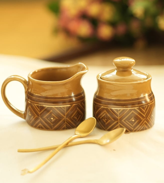 Transform your home into a warm and inviting atmosphere with this beautiful Courtyard Yellow Barmer Milk Pot and Sugar Pot. Crafted from fine ceramic, this product adds a timeless charm to your table. The vibrant yellow colour brings life to the decor, adding a touch of vibrancy to the space. Not just aesthetically appealing. Disclaimer: All other items in the image are only for display purposes and will not be a part of the delivery content. Product colour may slightly vary due to photographic lighting sources. Country of Origin - India.