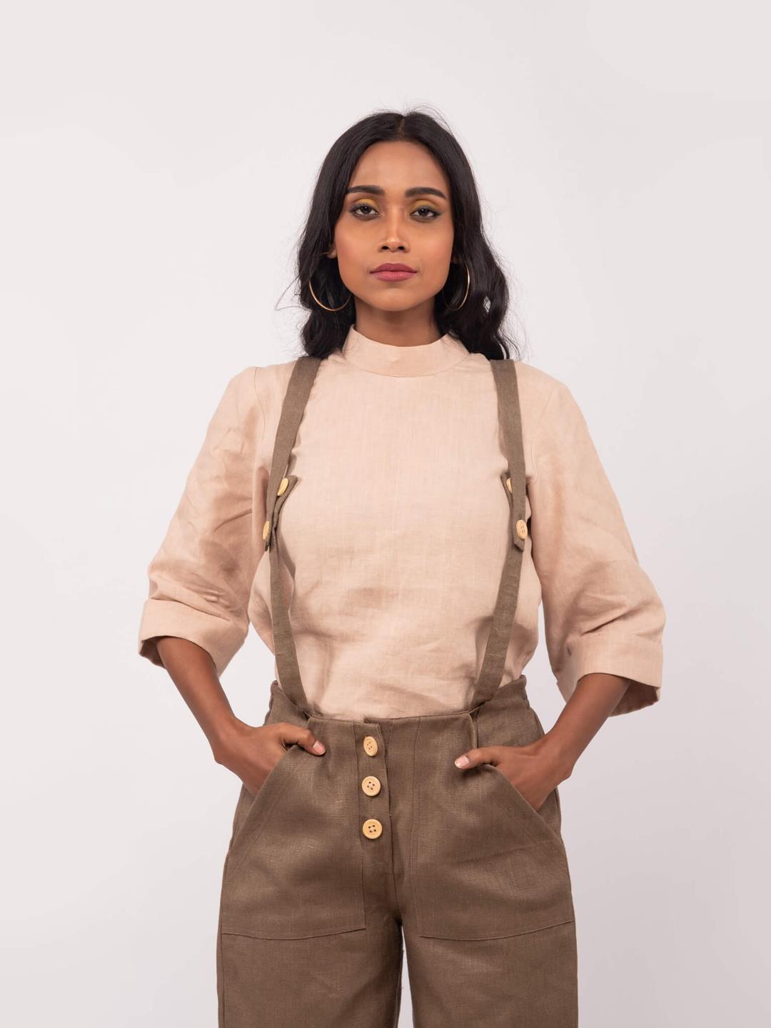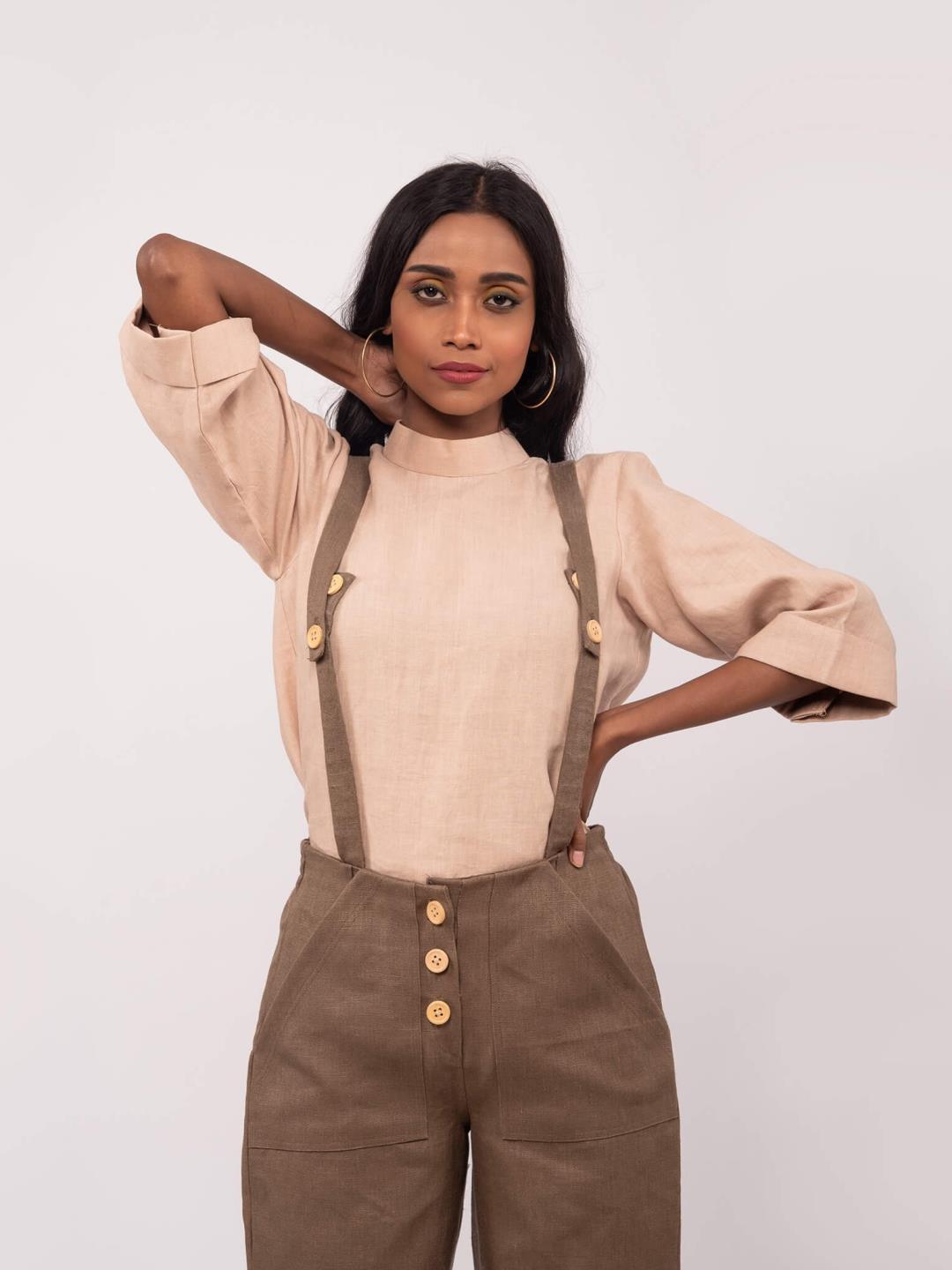 Description: Boxy fit with a buttoned back, makes the courtroom top a perfect fit for a casual day. The high neck and band color silhouette made in 100% hemp will keep your body feeling airy and light throughout the day.