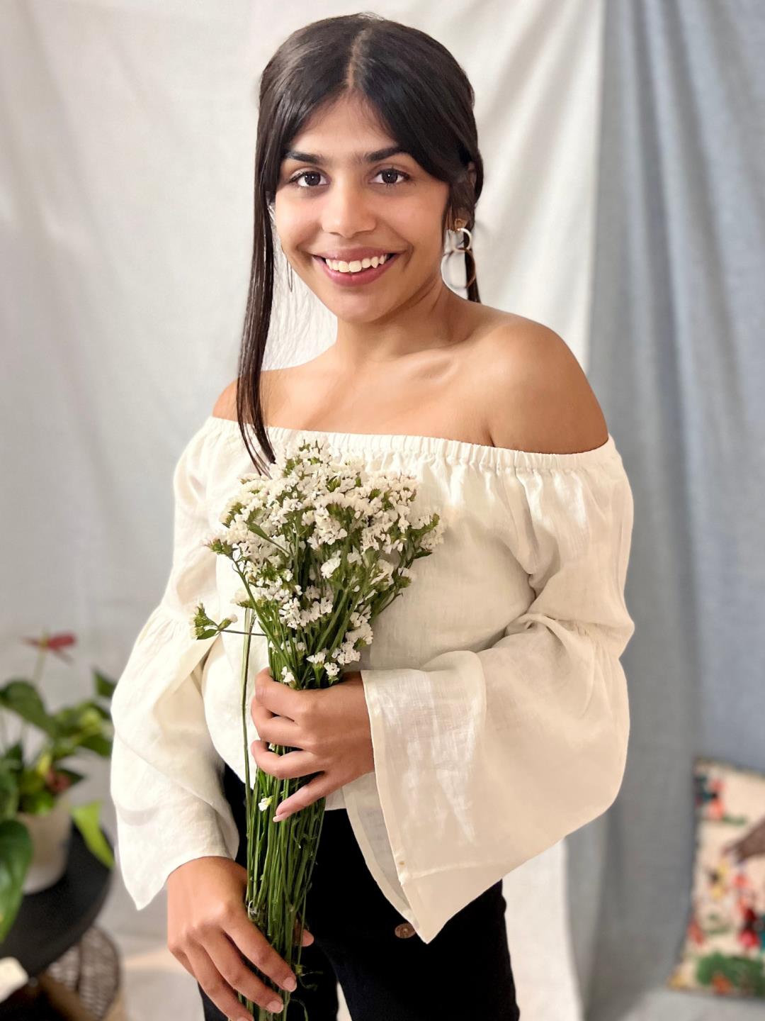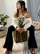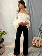 Description: Our simple yet sexy look with the off-shoulder top. Crafted in a way that allows you to show off those shoulders and collar bones, and keep you breezy through the night. With bell sleeves and elastic bands, the garment feels as light as air on your body.