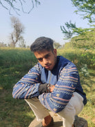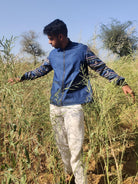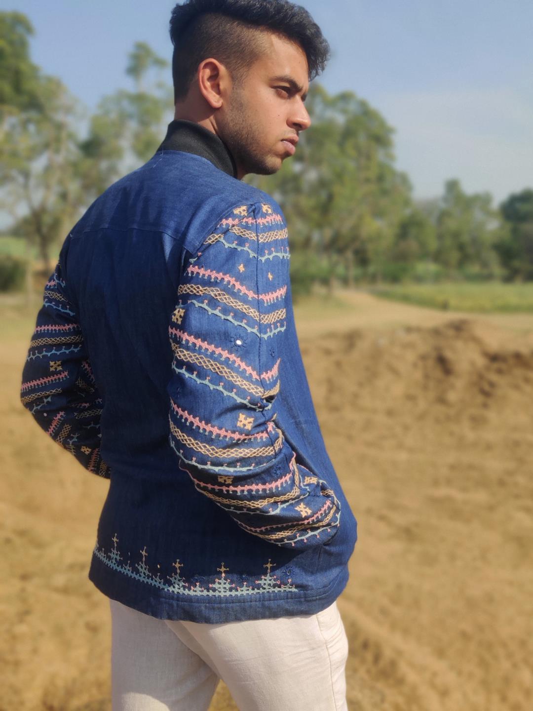 Description: Carefully crafted by women over 12 days. Following the patterns of Sindhi embroidery, the bomber jacket brings together generations of culture onto its arms. Intricate motifs covering the sleeve and minimal detailing along the base of the jacket.