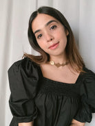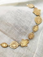 The neckpiece is handcrafted in a matt gold leather, with embossed symbols of the evil eye and the hamsa hand, asymmetrically arranged together. We are redefining the word new by upcycling leather off-cuts to give them a second purpose and each product a new skin.