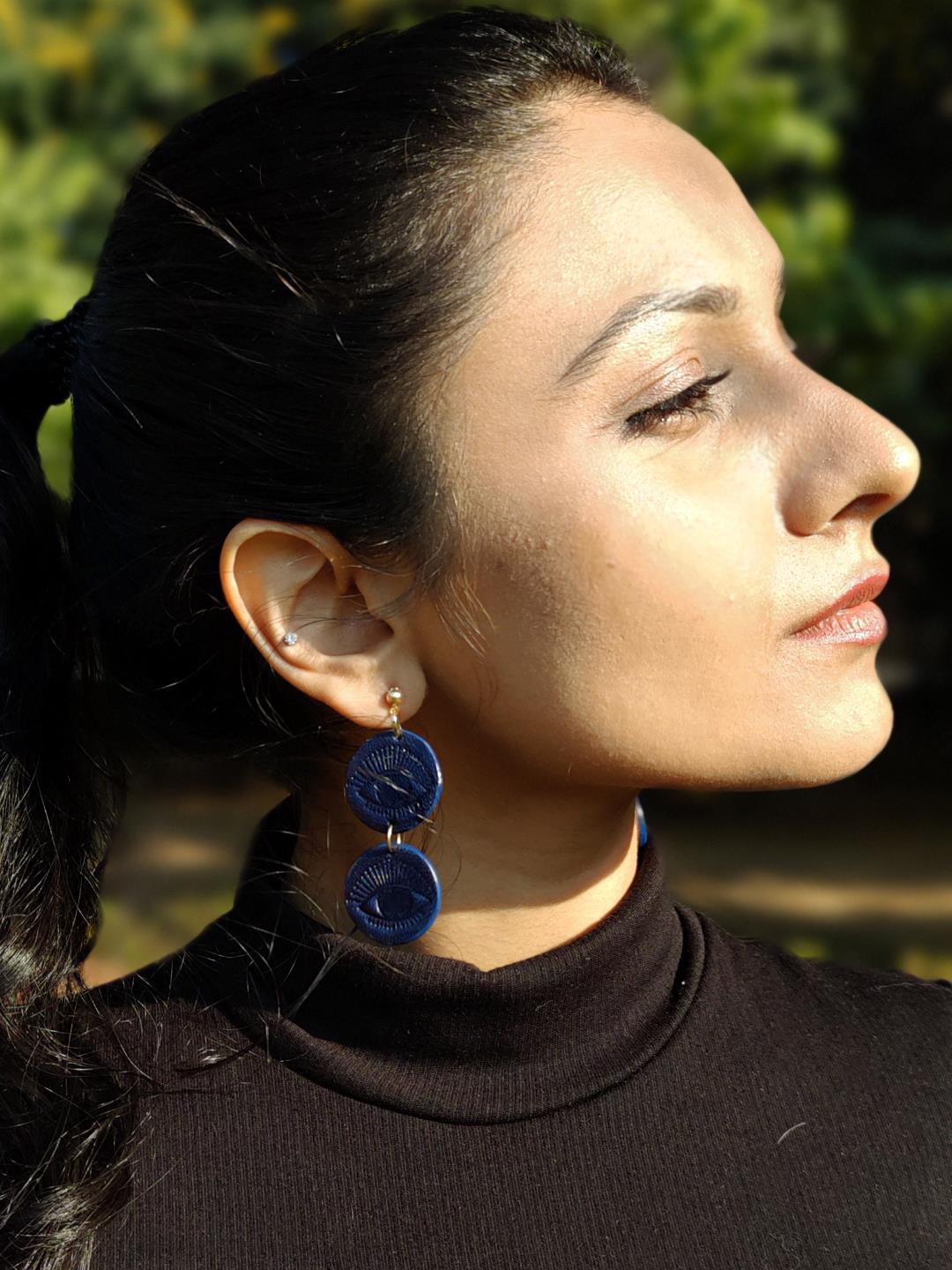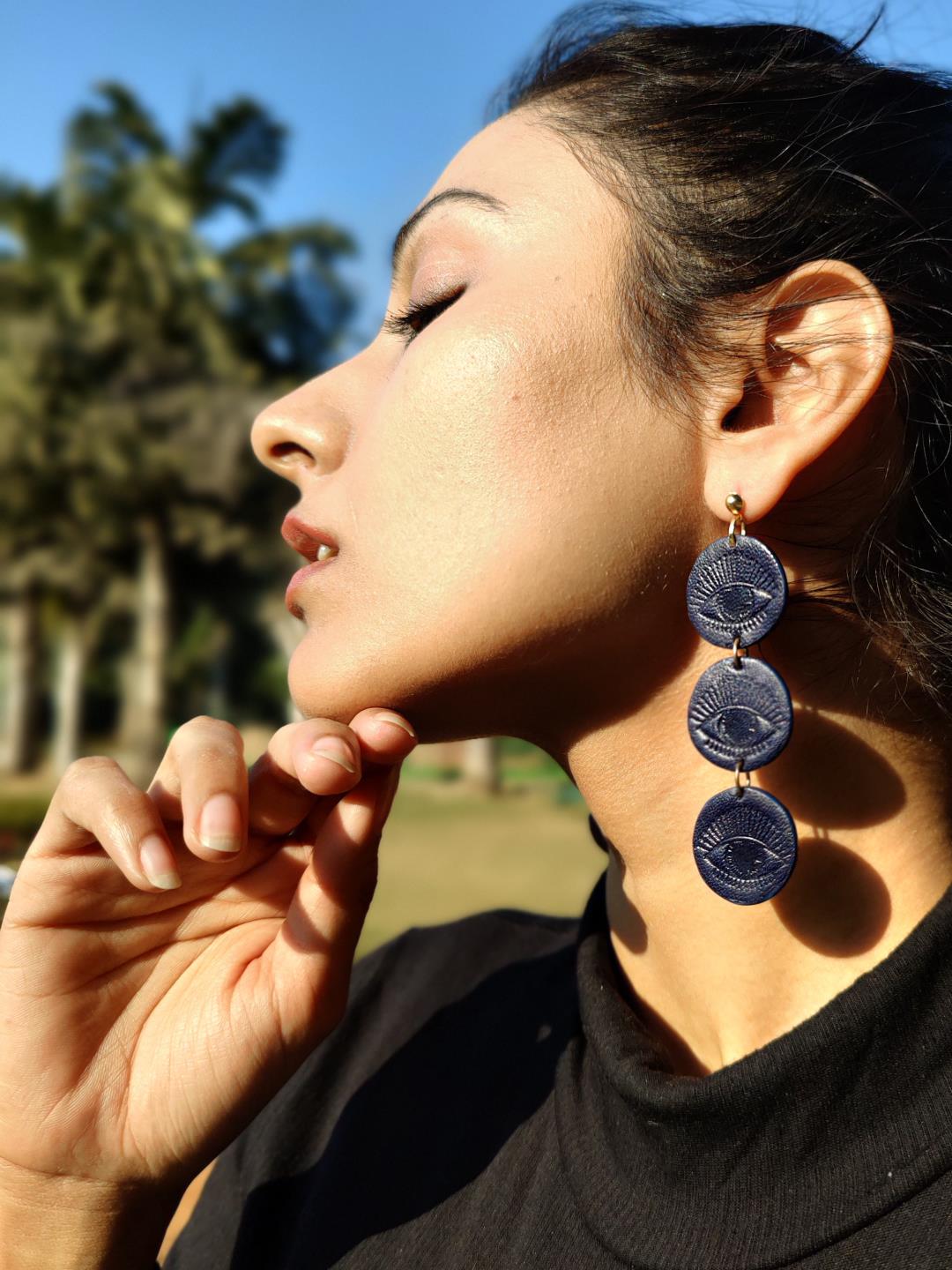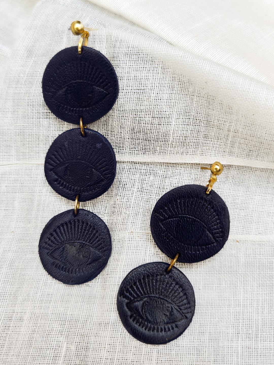 Asymmetric upcycled leather paillettes in a deep blue, embossed with the evil eye We are redefining the word new by upcycling leather off-cuts to give them a second purpose and each product a new skin.