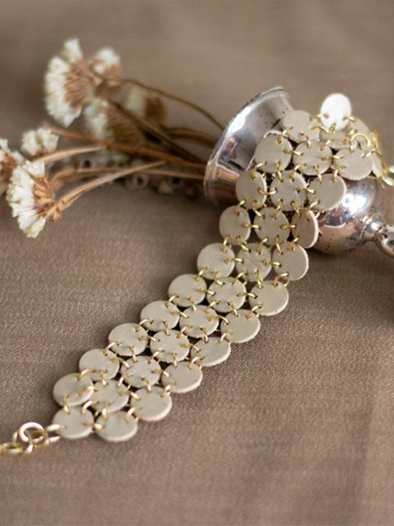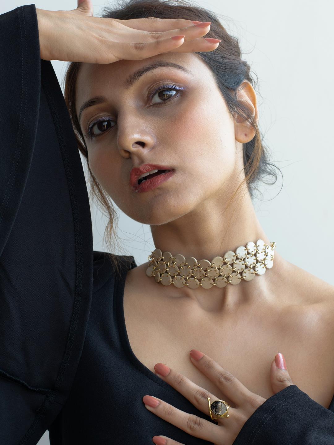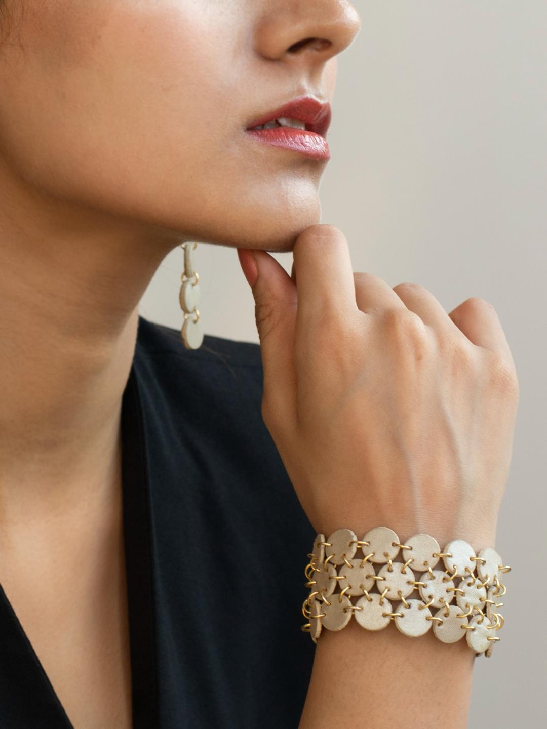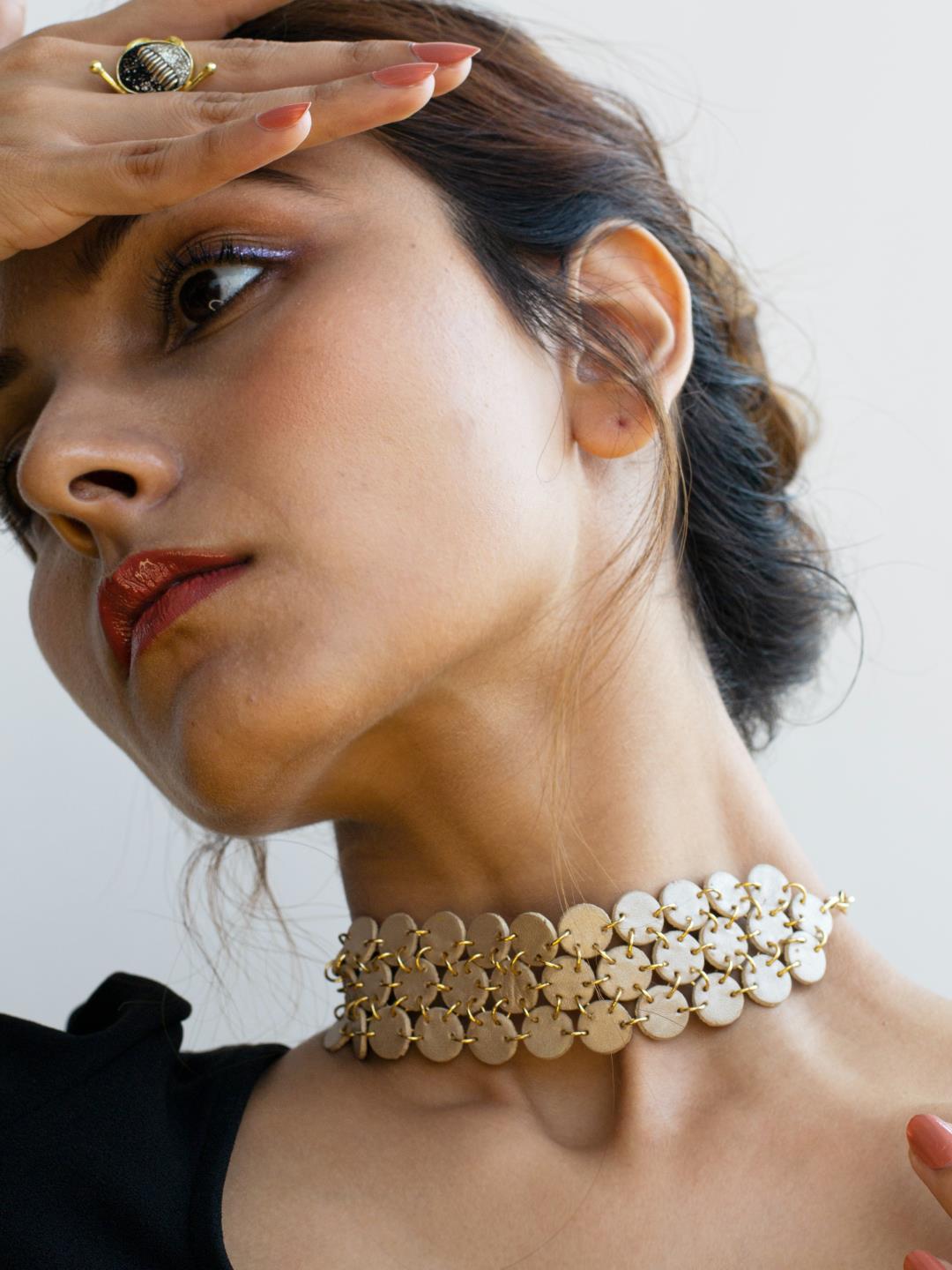 The Gold Chord choker is handcrafted with hand-cut leather sequins and put together with golden rings. The piece's statement still looks delicate and goes perfectly with traditional and western clothing. We are redefining the word new by upcycling leather off-cuts to give them a second purpose and each product a new skin.
