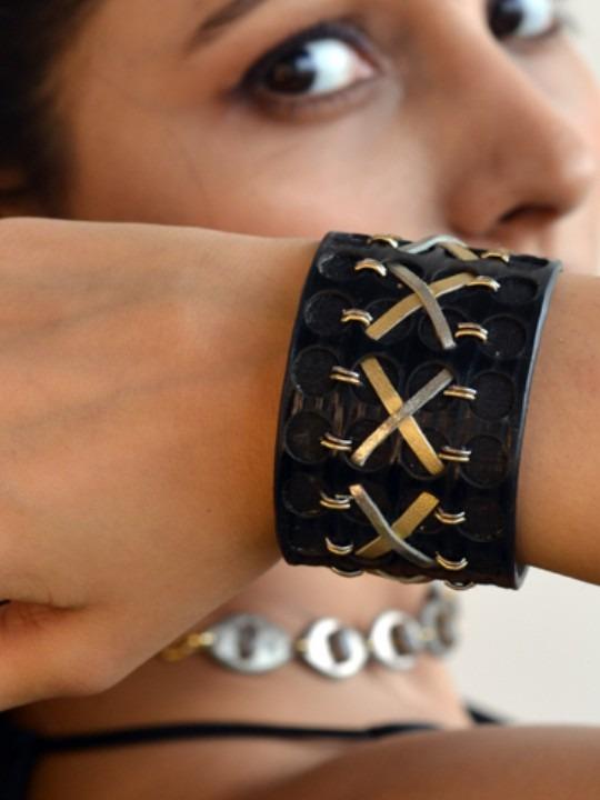 The black leather base with dabka work and metallic leather cross woven through the cut outs. The statement cuff goes is a versatile piece that can be layered and paired with any jewelry. We are redefining the word new by upcycling leather off-cuts to give them a second purpose and each product a new skin.