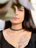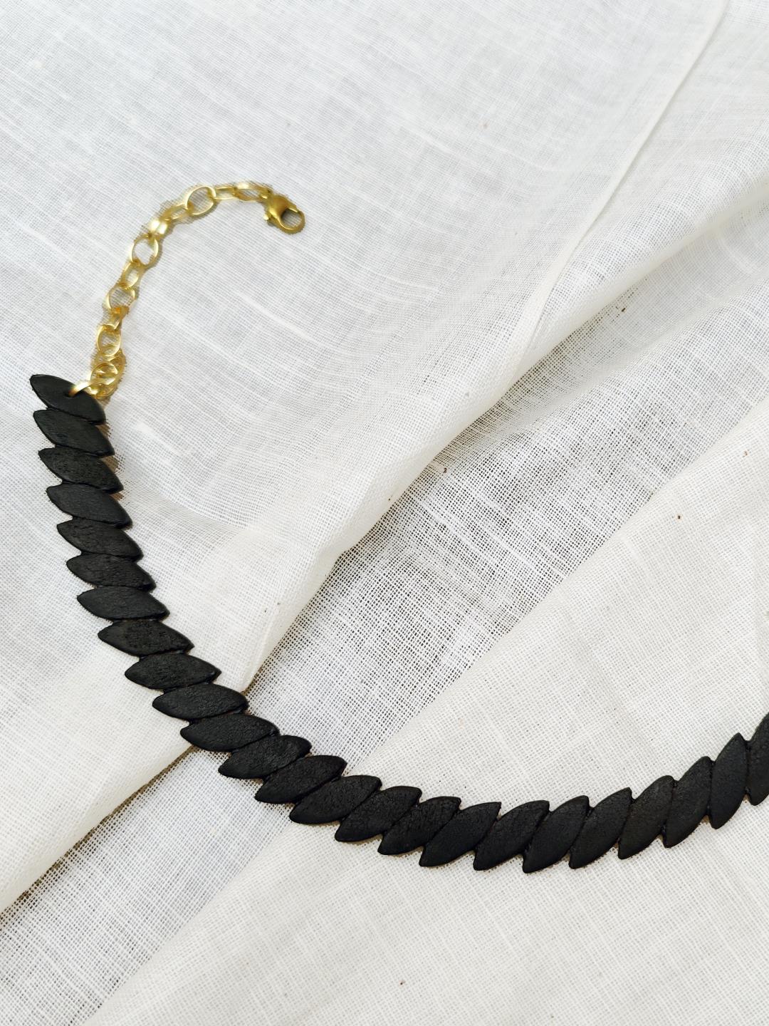 The eye silhouette choker is crafted with handcut leather-shaped sequins arranged together to create a delicate choker. We are redefining the word new by upcycling leather off-cuts to give them a second purpose and each product a new skin.