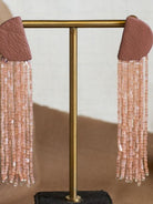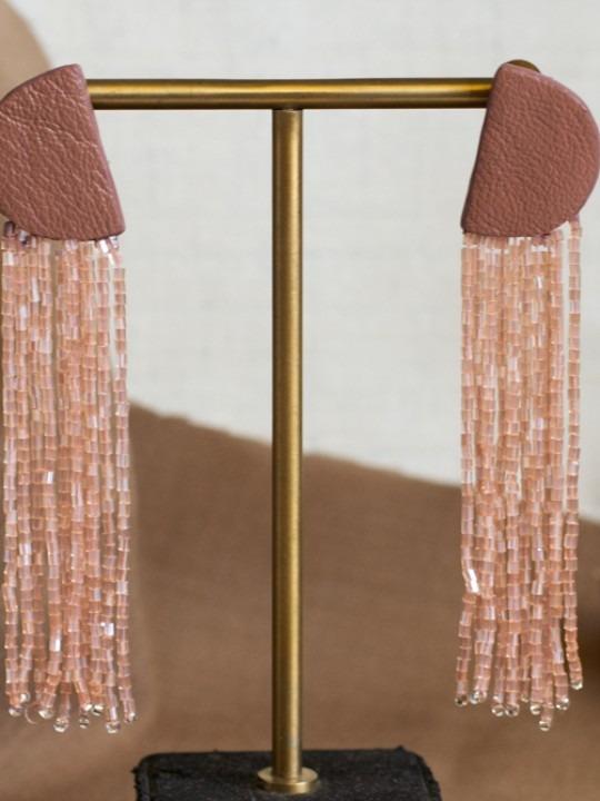 The fall tassel earrings in a delicate pink, glass beads threaded together with a resham thread. The asymmetric arrangement is put together with a leather stud. We are redefining the word new by upcycling leather off-cuts to give them a second purpose and each product a new skin.