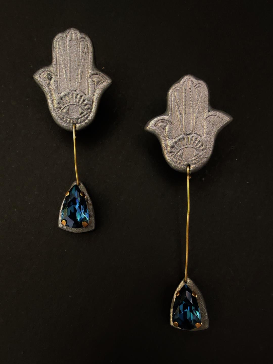 The Hamsa hand a protective talisman that brings good fortune, health and happiness. Embossed on a metallic grey leather with dangling teal stones. We are redefining the word new by upcycling leather off-cuts to give them a second purpose and each product a new skin.