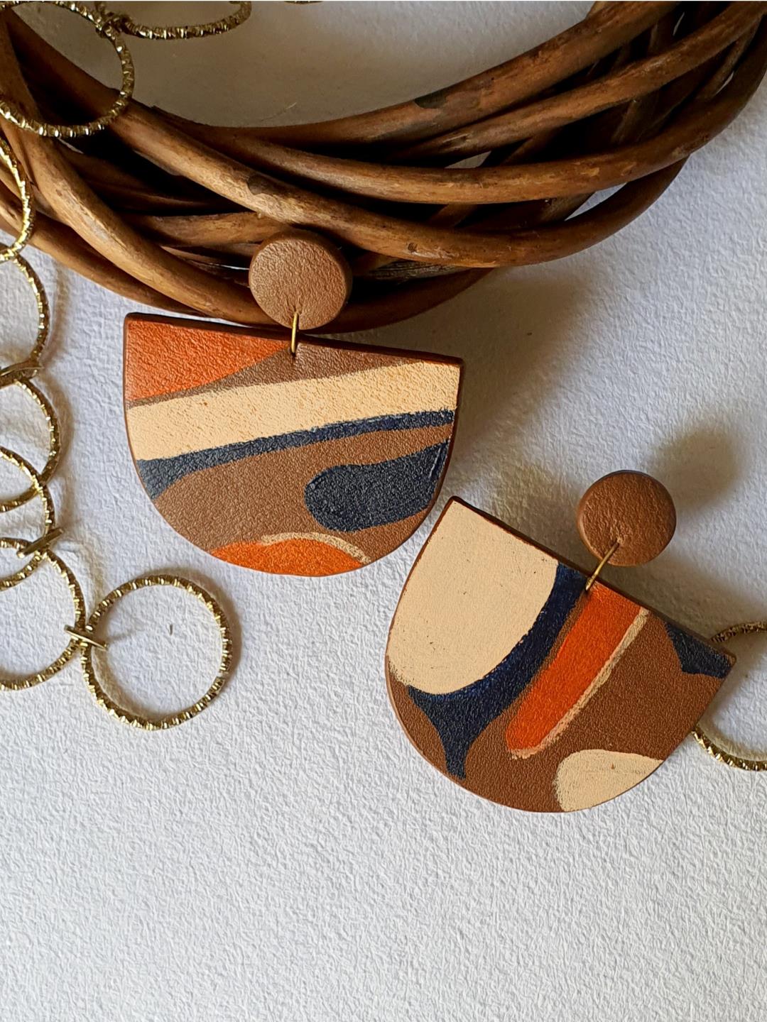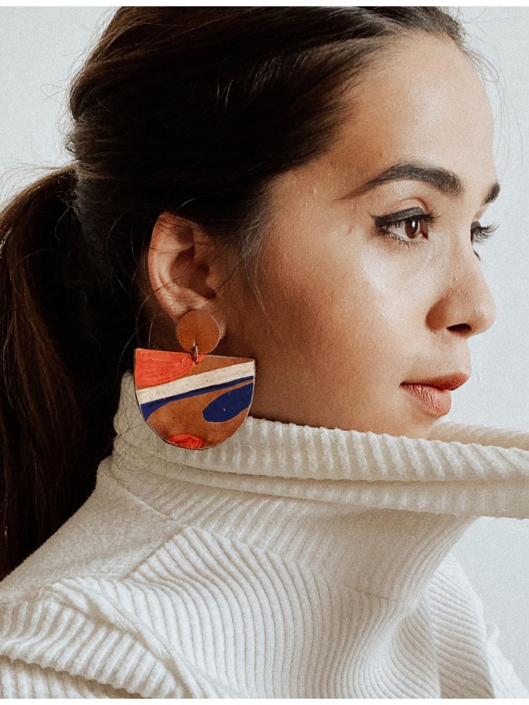 Hand painted on tan leather, the irregular pattern on both the pieces make them unique. The pop of orange adds that splash of colour and fun We are redefining the word new by upcycling leather off-cuts to give them a second purpose and each product a new skin.
