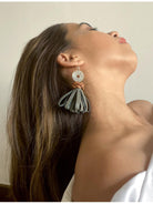 Chunky leather tassel earrings with a tan braid and a shell bead We are redefining the word new by upcycling leather off-cuts to give them a second purpose and each product a new skin.