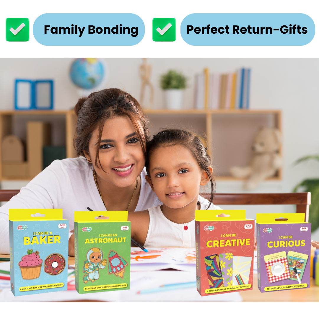 This is a combo of 10 sets of the " I Can Be a Baker " which makes it perfect for return gifting, bulk gifting and play dates.Step into a world of sweet dreams and delicious creativity with JoGenii's "I Can Be a Baker" Mini DIY Kit! Perfect for aspiring bakers aged 3 to 99, this enchanting kit invites you to whip up some magical fun by creating jumbo-sized fridge magnets with delightful donut and cupcake designs.