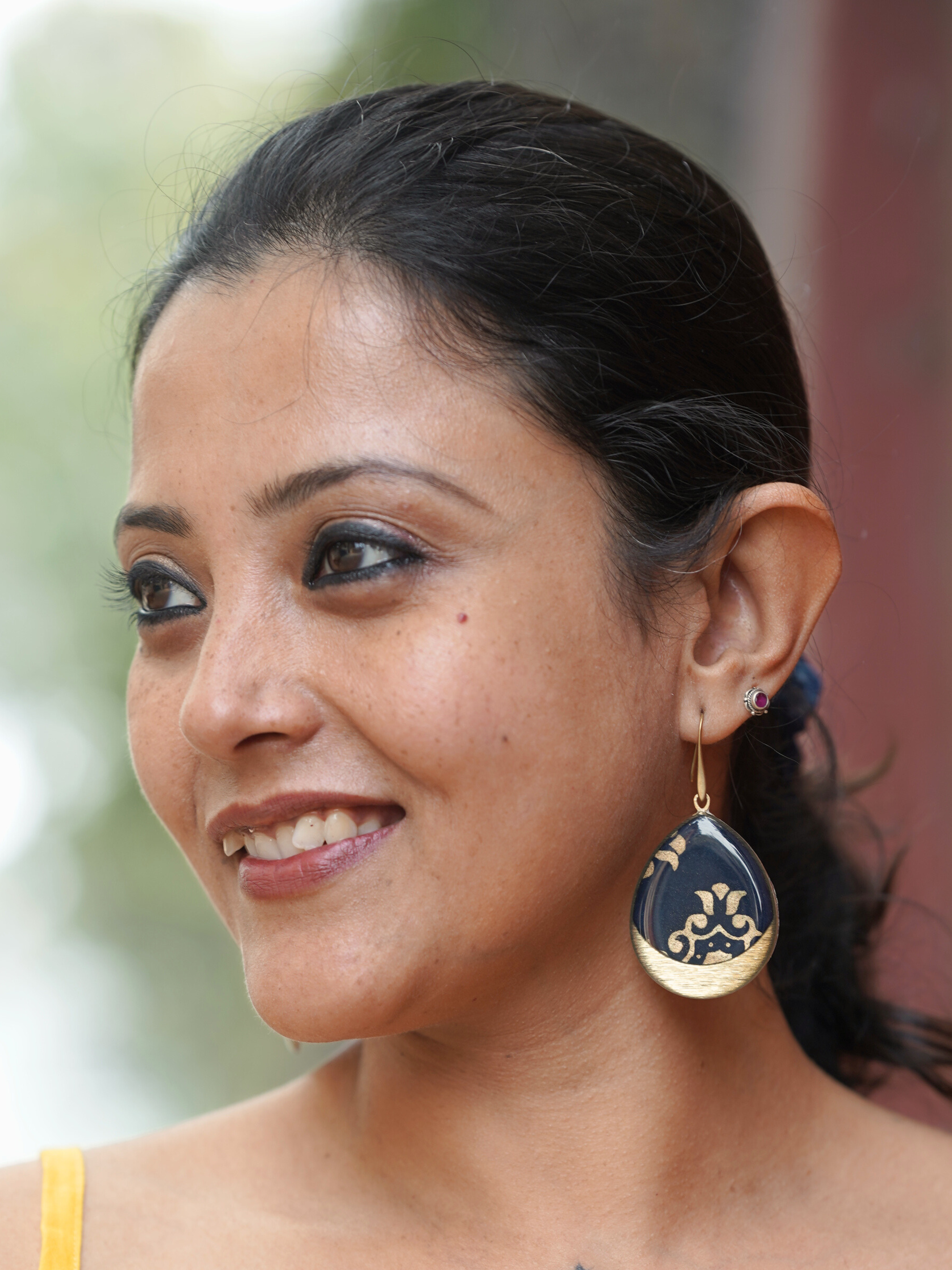 Crafted from eco-friendly handmade paper and set in brass with a resin coating, these earrings boast a deep navy hue with gold accents, perfect for any occasion.