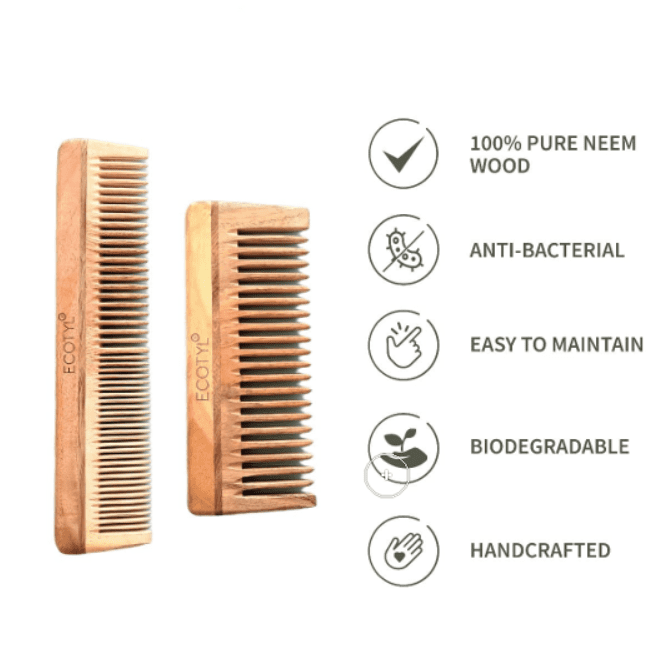 Discover the perfect hair care duo with Ecotyl's Premium Neem Wood Comb Combo, featuring the Detangling Comb and Shampoo Comb. Crafted with 100% pure neem wood, these combs are anti-bacterial, antiseptic, and anti-static. Additionally, it is great for the scalp, as neem wood prevents dandruff.Detangling Comb:Experience the ease of detangling with our thoughtfully designed comb. This comb comes with both wide-teeth and narrow-teeth which helps to gently detangle your hair, minimise hair breakage, and improve blood circulation. This will result in smoother and more manageable hair. Shampoo Comb:Upgrade your shower routine with the Shampoo Comb. Designed for efficient distribution of shampoo and conditioner, this comb helps evenly coat every strand for a thorough cleanse. The neem wood material adds an extra layer of natural care, contributing to a healthier scalp and hair.