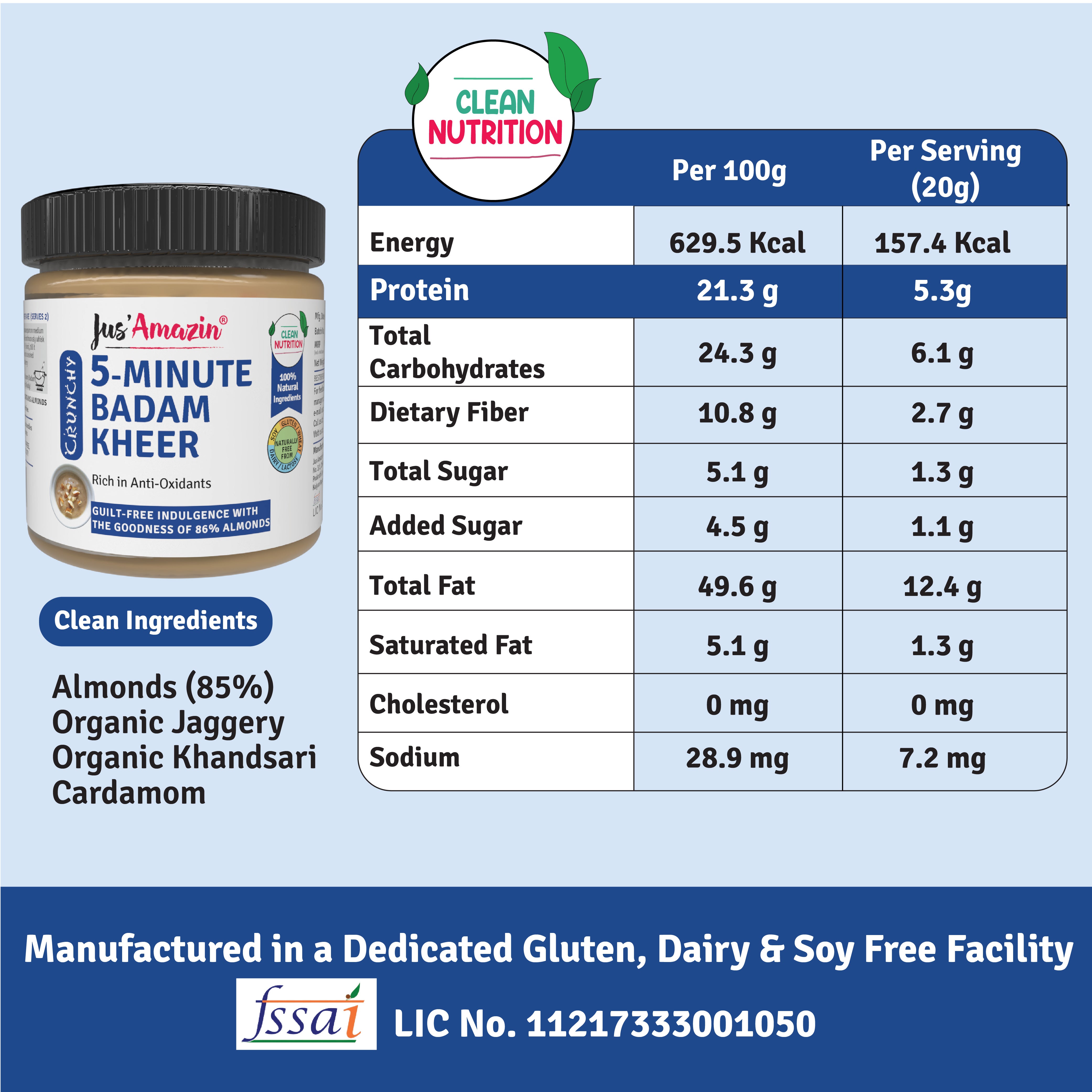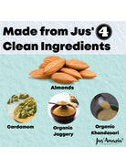 It’s made from just 4 natural ingredients (Almonds, Organic Jaggery, Organic Khandsari Sugar & Cardamom). It provides Clean Nutrition, with Zero Junk (No refined sugar or chemicals or preservatives).
