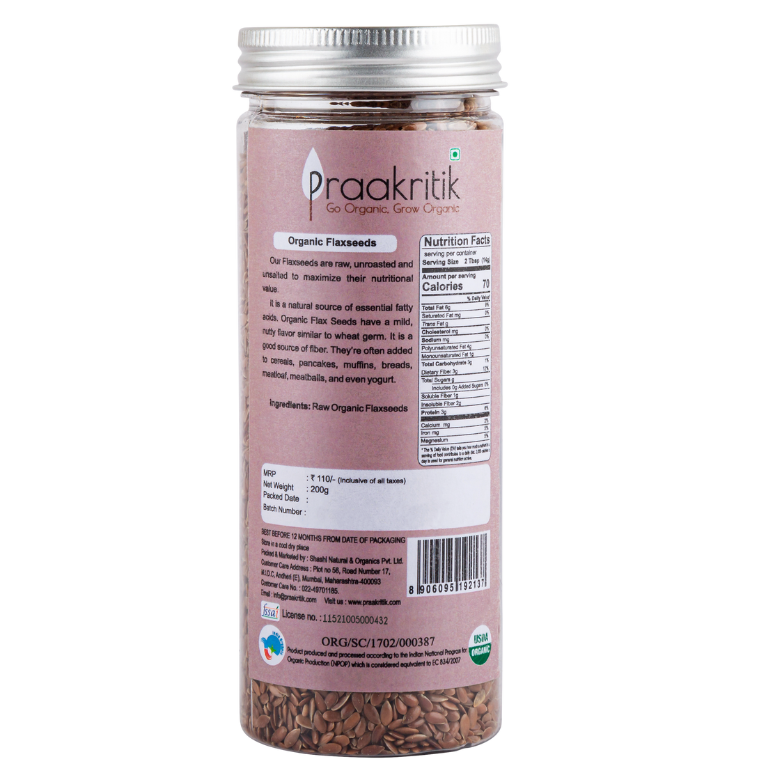 - Ingredients: Raw Organic Flaxseeds