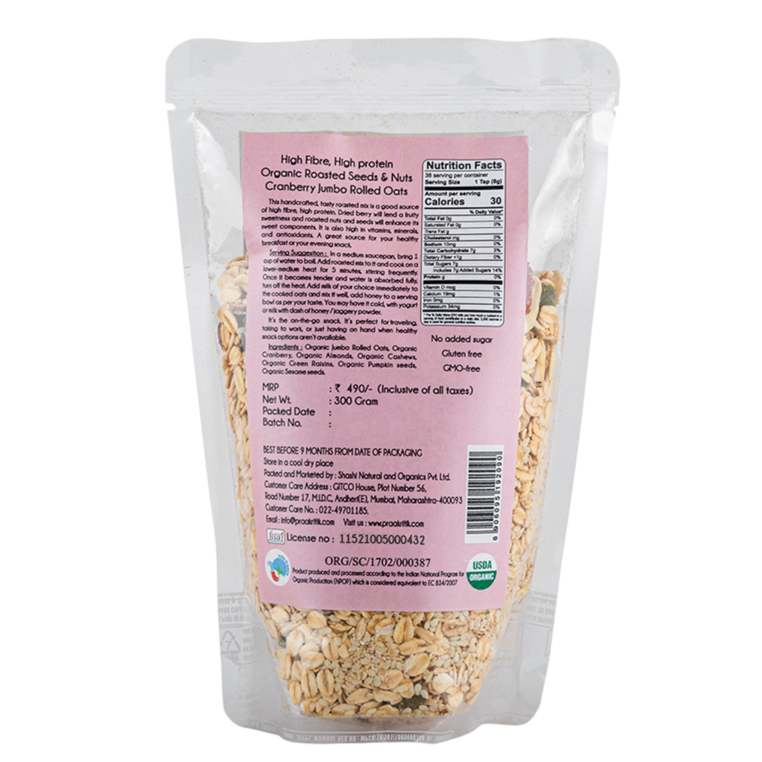 Ingredients Organic Almonds, Pumpkin Seeds & Sesame seeds,Organic Cranberry, Cashew, Green Raisins