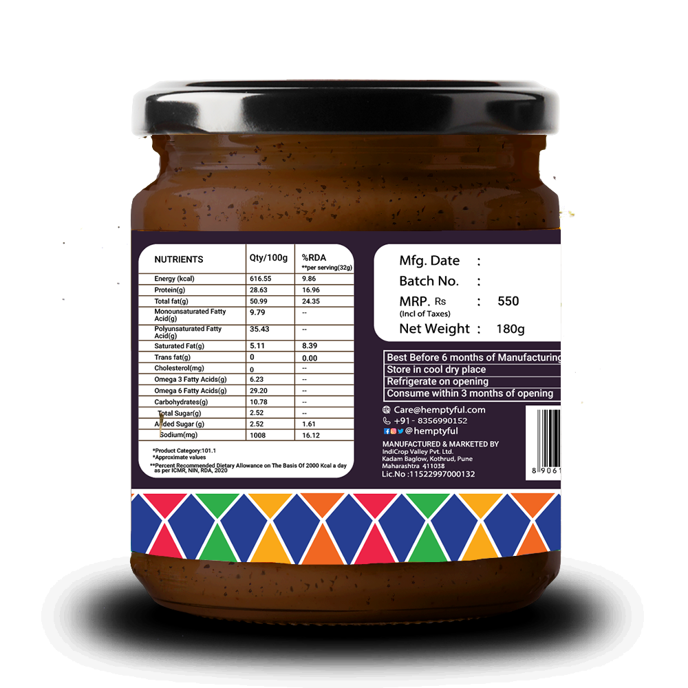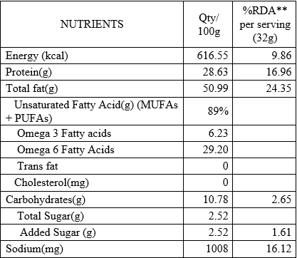 Ingredient: Hemp seeds, Sunflower Oil, Vitamin E, Rosemary Extract, Chilli, Onion, Garlic, Black Pepper, Corn Starch, Iodised Salt,coconut fat, natural flavouring (smoke, chilli), yeast extract powder