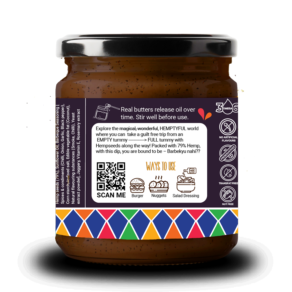 Explore the magical, wonderful, HEMPTYFUL world where you can take a guilt free, trip from an EMPTY tummy ————-> FULL tummy with Hempseeds along the way! Packed with 79% Hemp, with this dip, you are bound to be – Barbekyu nahi??”