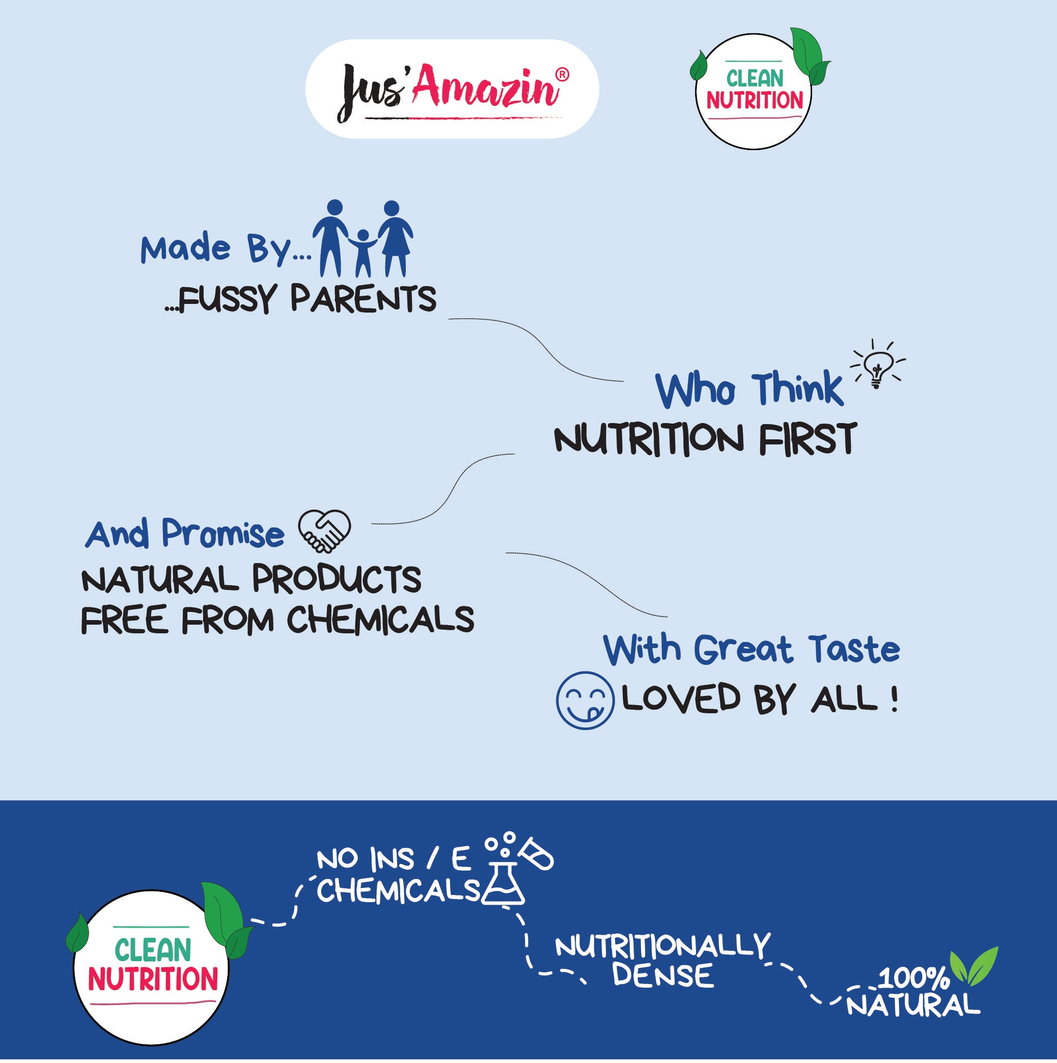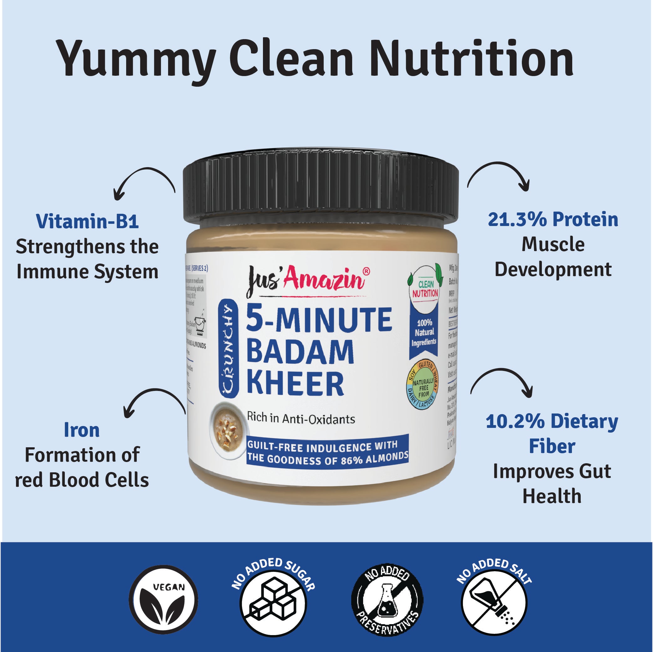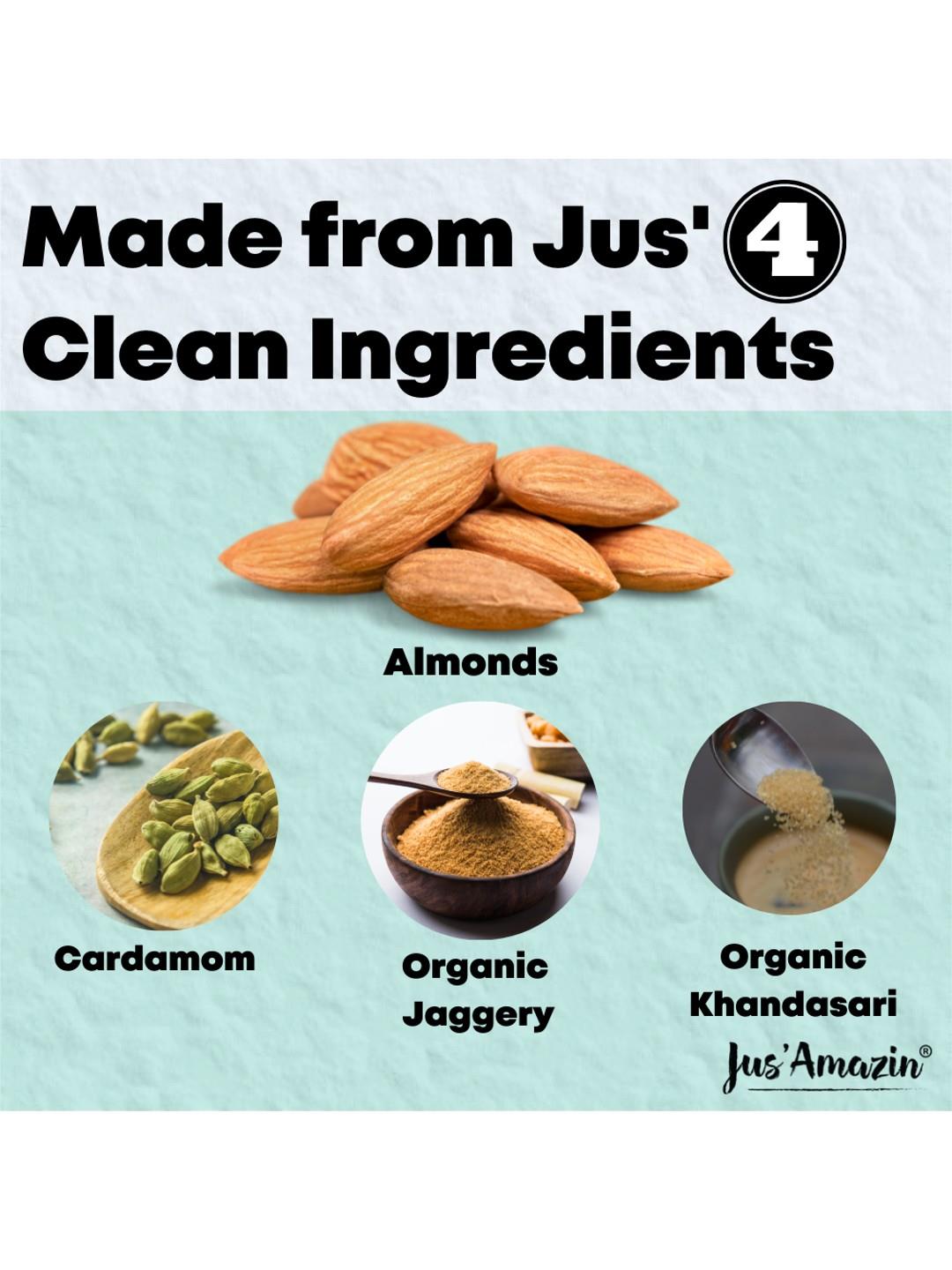 It’s made from just 4 natural ingredients (Almonds, Organic Jaggery, Organic Khandsari Sugar & Cardamom). It provides Clean Nutrition, with Zero Junk (No refined sugar or chemicals or preservatives).
