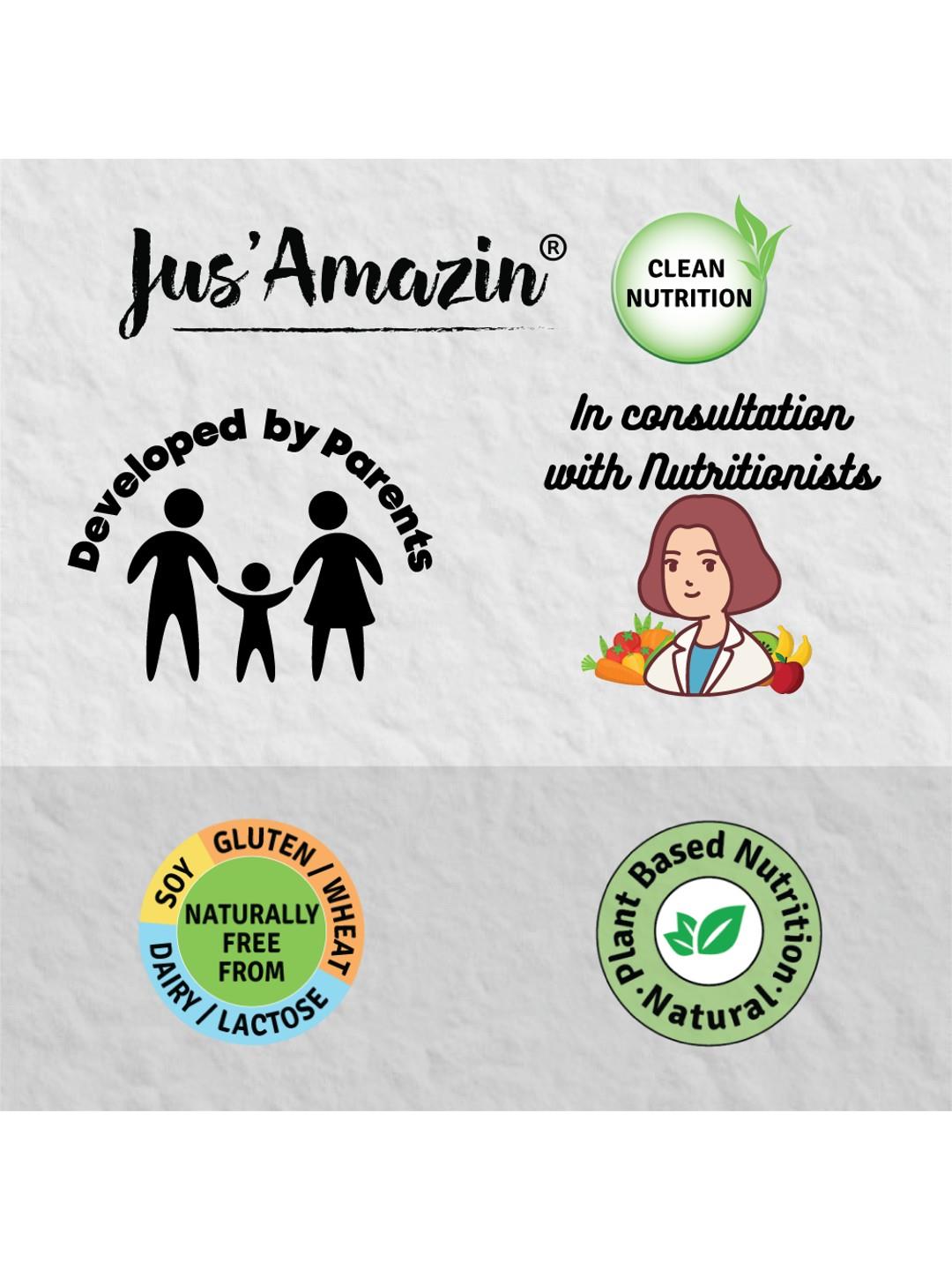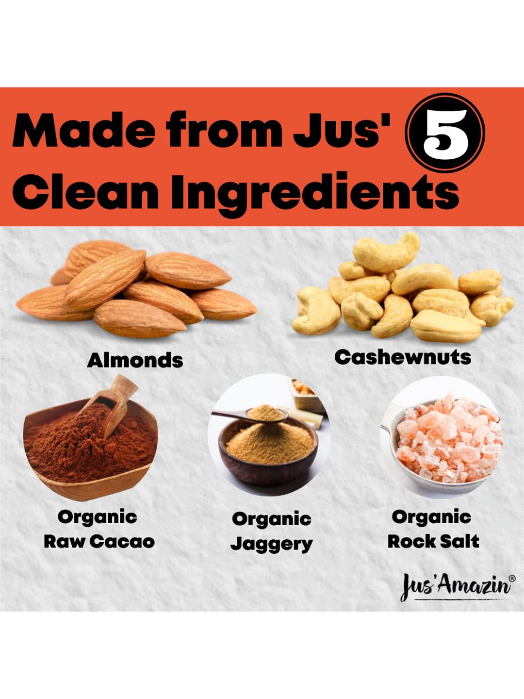 - Jus Amazin’ 5-Minute Chocolate Mousse is made from just 5 natural ingredients: Almonds, Cashew nuts, Superfood Raw Cacao, Organic Jaggery, Organic Rock Salt – that’s it!