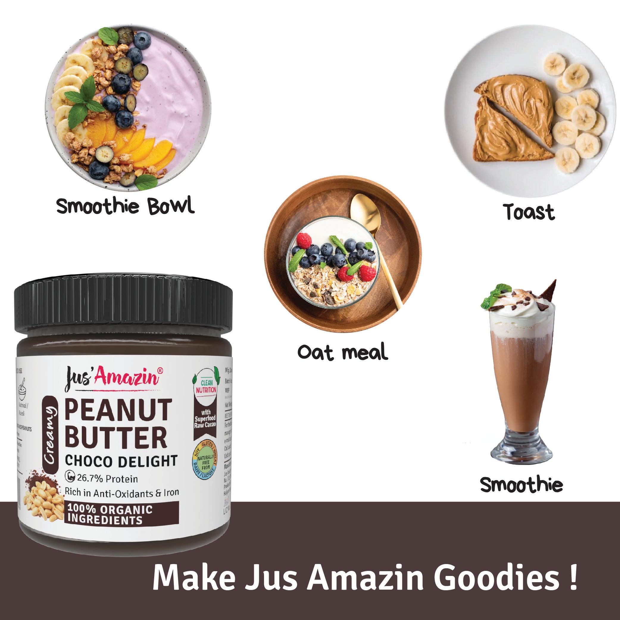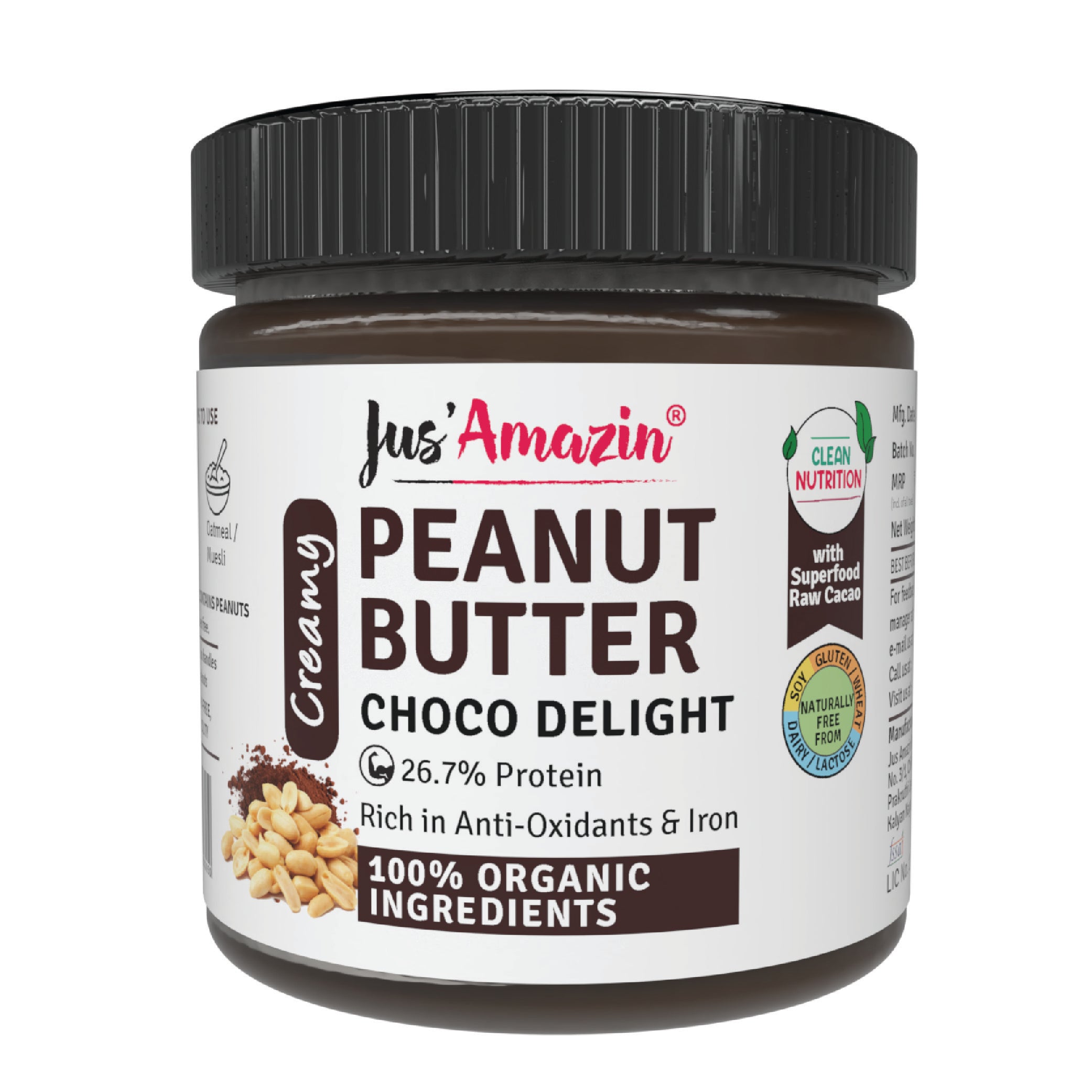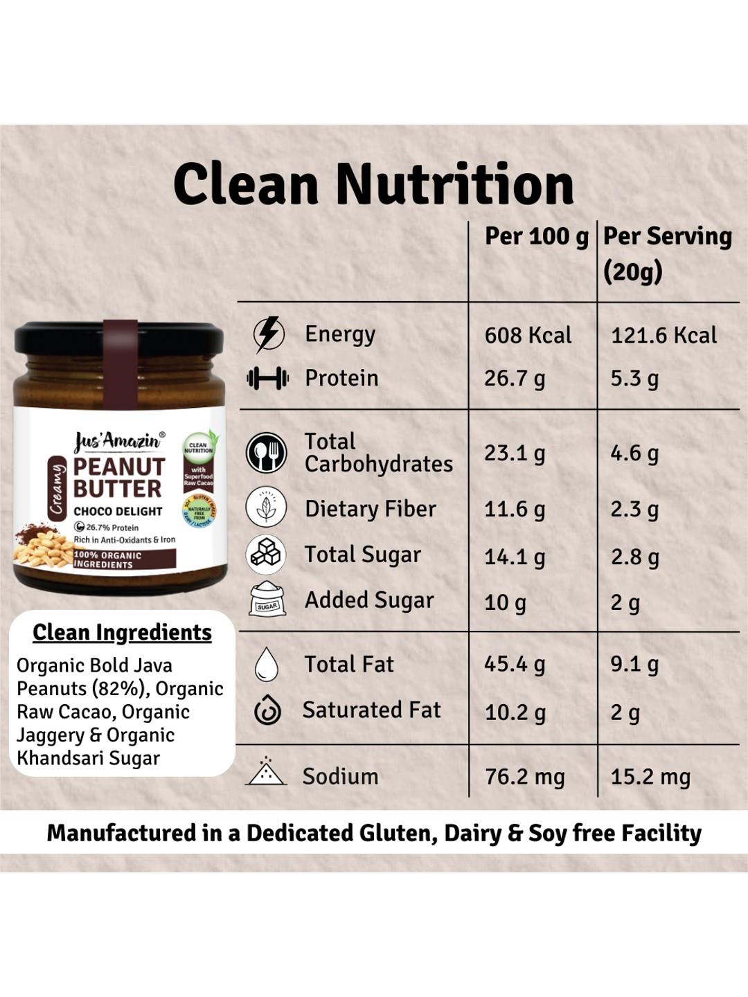 Jus Amazin Creamy Organic Peanut Butter - Choco Delight, with 26.7% protein is a unique blend of 100% certified Organic Bold Java Peanuts and Superfood Raw Cacao (super-rich in anti-oxidants), with some Organic Jaggery and Organic Khandsari Sugar. It provides Clean Nutrition, with Zero Junk (No refined sugar or chemicals or preservatives).